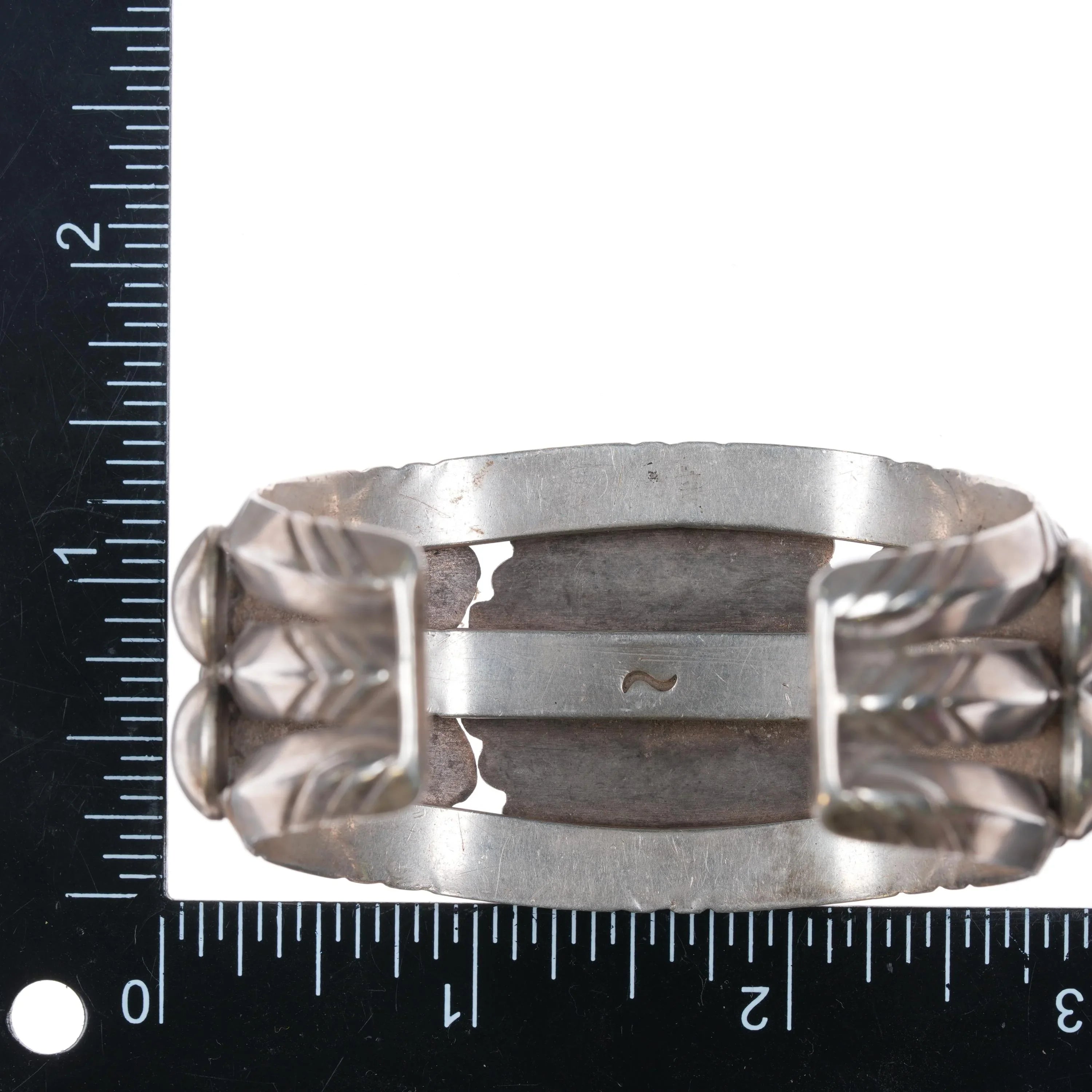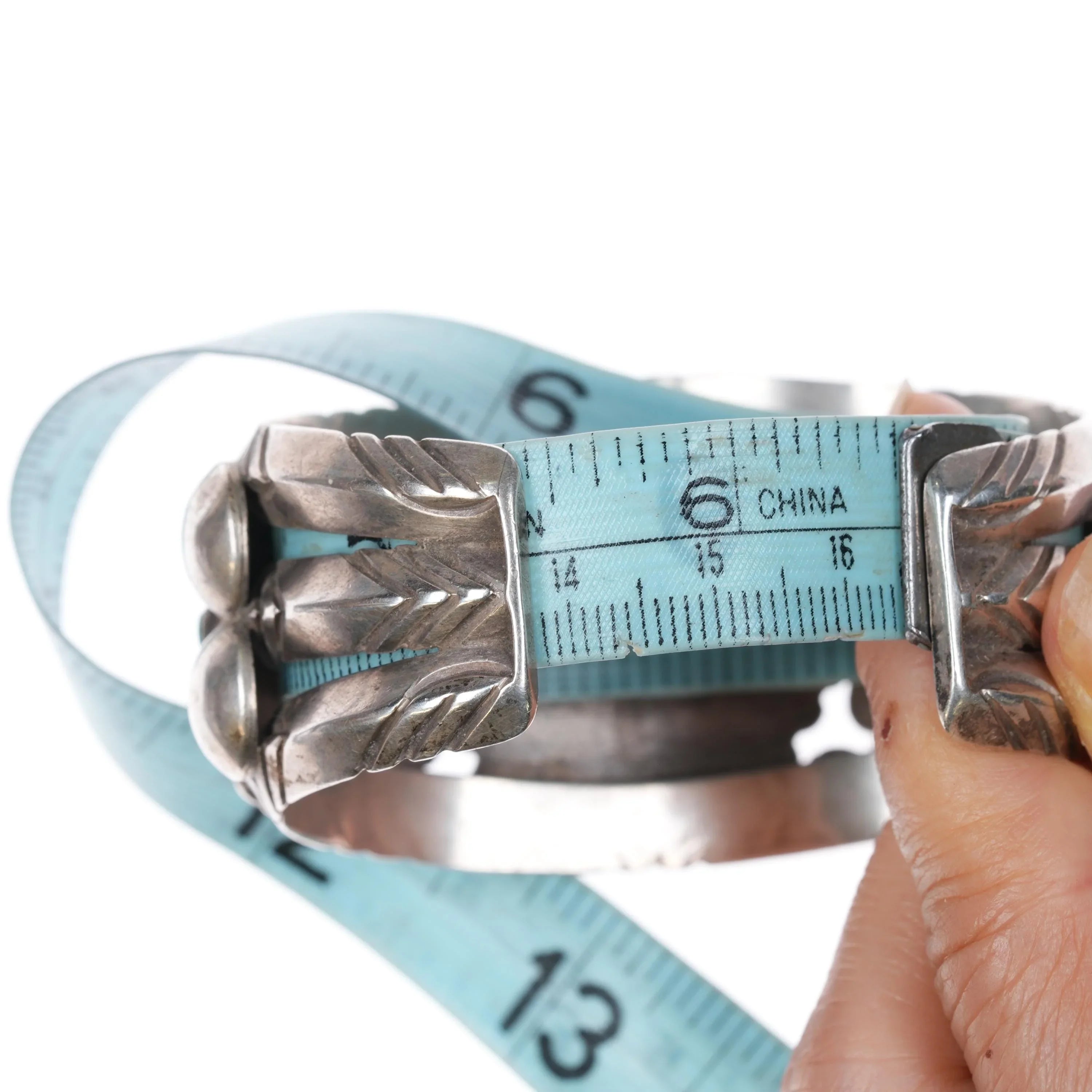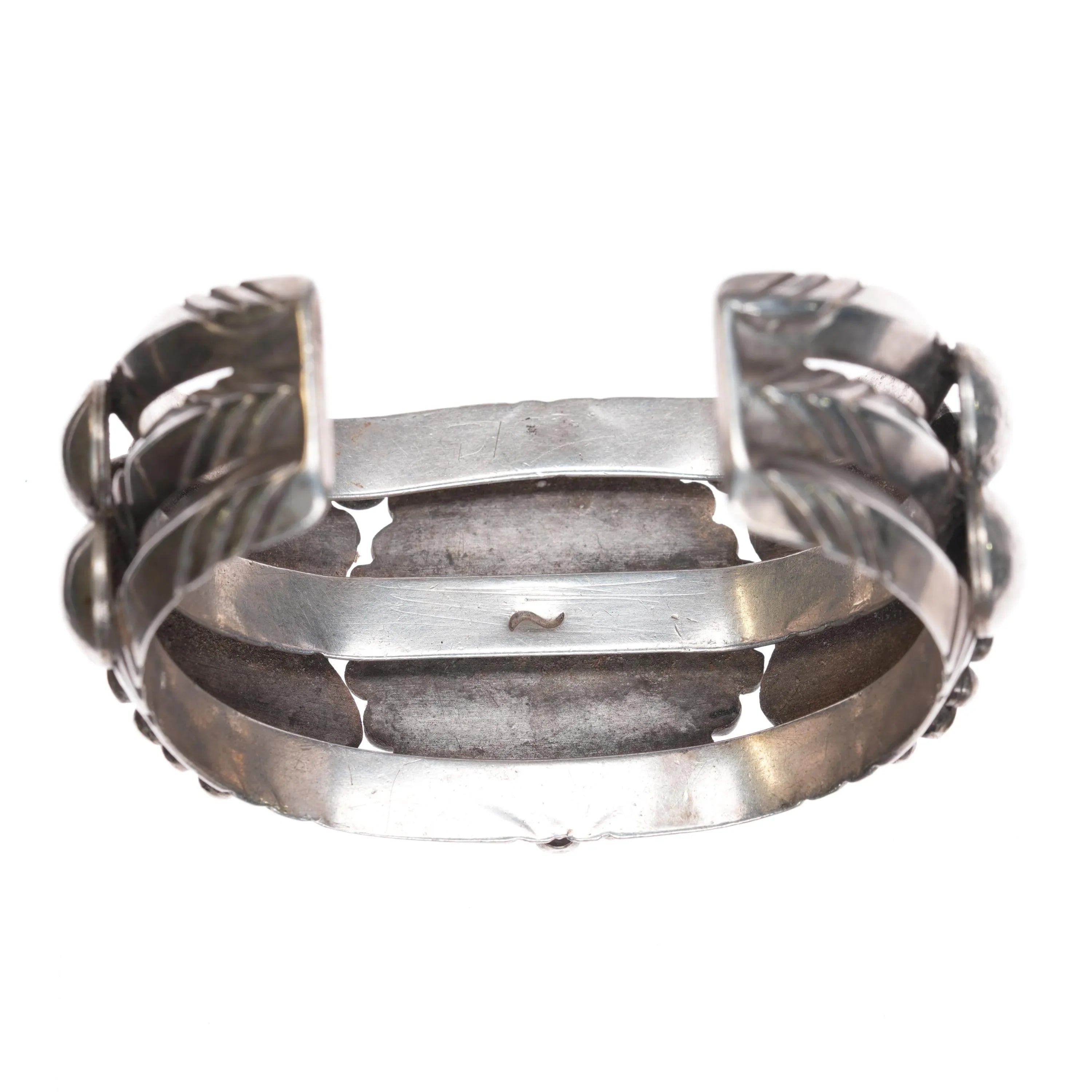 6.5" c1950 Fred Thompson Navajo sterling silver cluster turquoise cuff bracelet. Tested and guaranteed solid sterling silver. Early work by a historically important master Navajo silversmith. Multiple stones with very old fractures, all secure in their bezels. Weight and measurements in pictures.