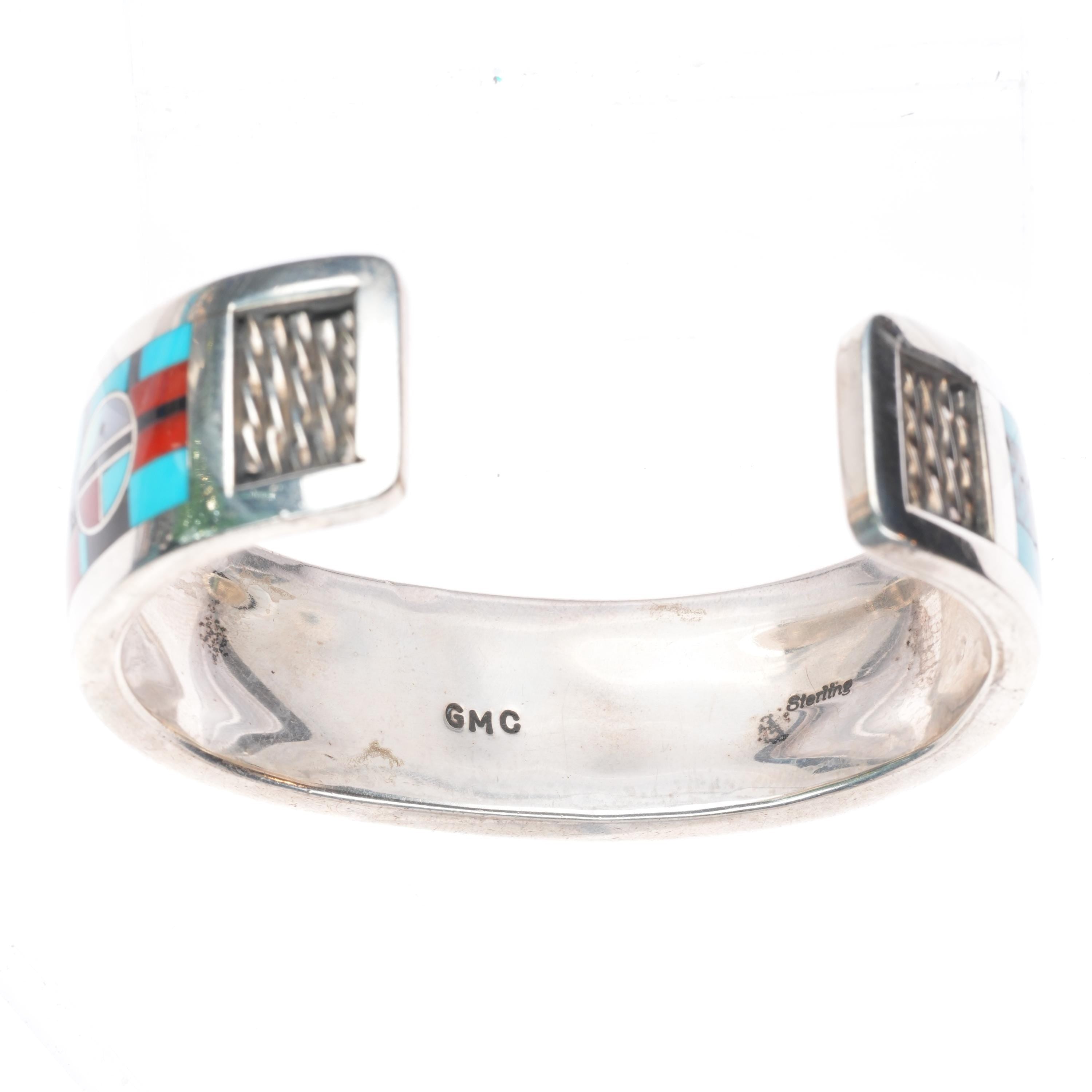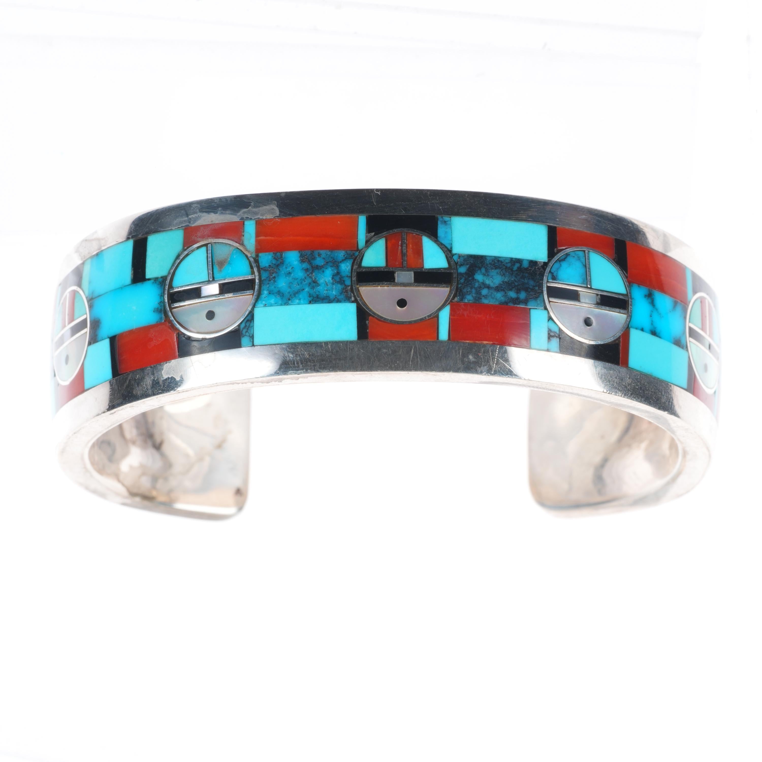 6.5" Gilbert & Mildred Calavaza Zuni inlay sunface sterling silver cuff bracelet