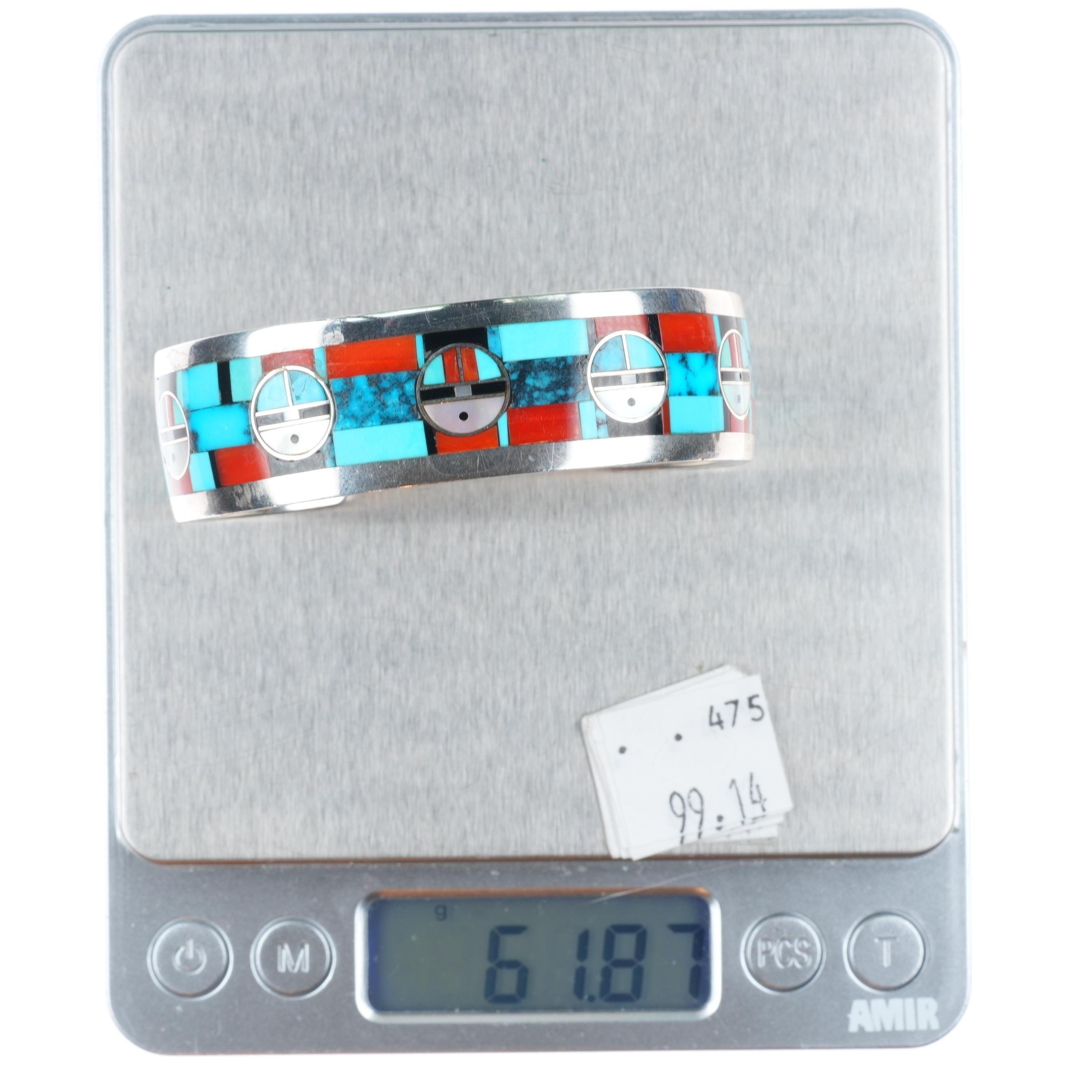6.5" Gilbert & Mildred Calavaza Zuni inlay sunface sterling silver cuff bracelet. Tested and guaranteed solid sterling silver with weight and measurements in pictures. Circa last quarter of the 20th century, No issues.