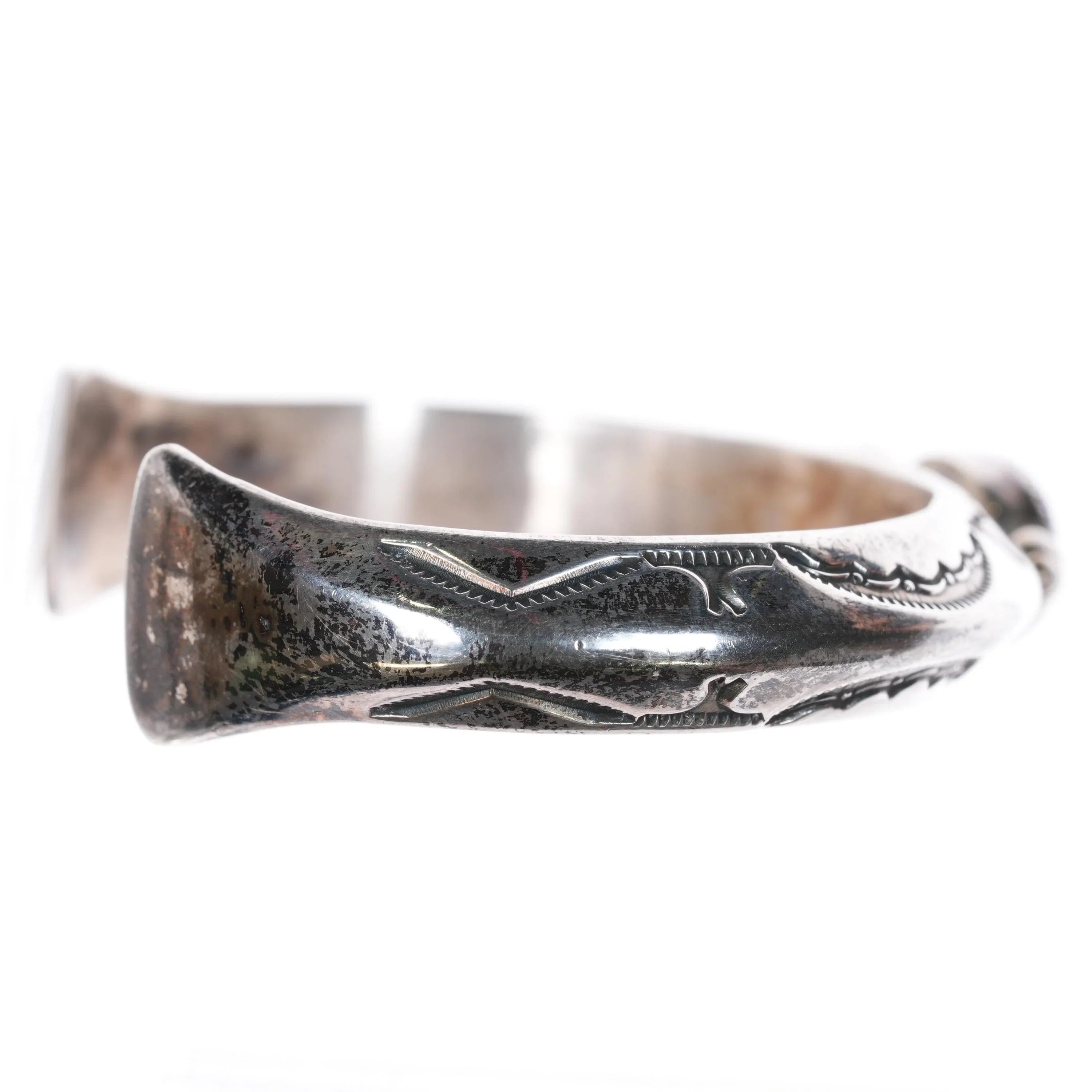 Jeanette‘s pieces are recognizable for her distinctive combination of silverwork and beautiful natural stones. Jeanette prefers the traditional Navajo style with heavy, deep stamping and high polishes. She still follows her first employer‘s advice: to leave a mark to show the jewelry was handmade.