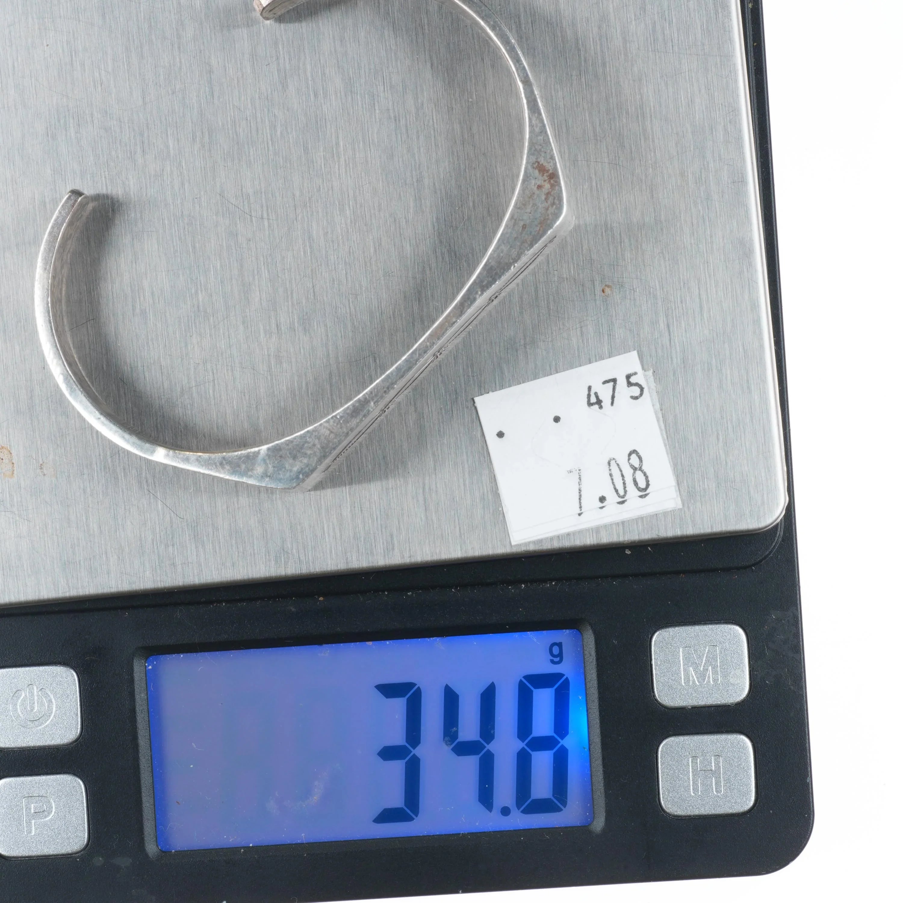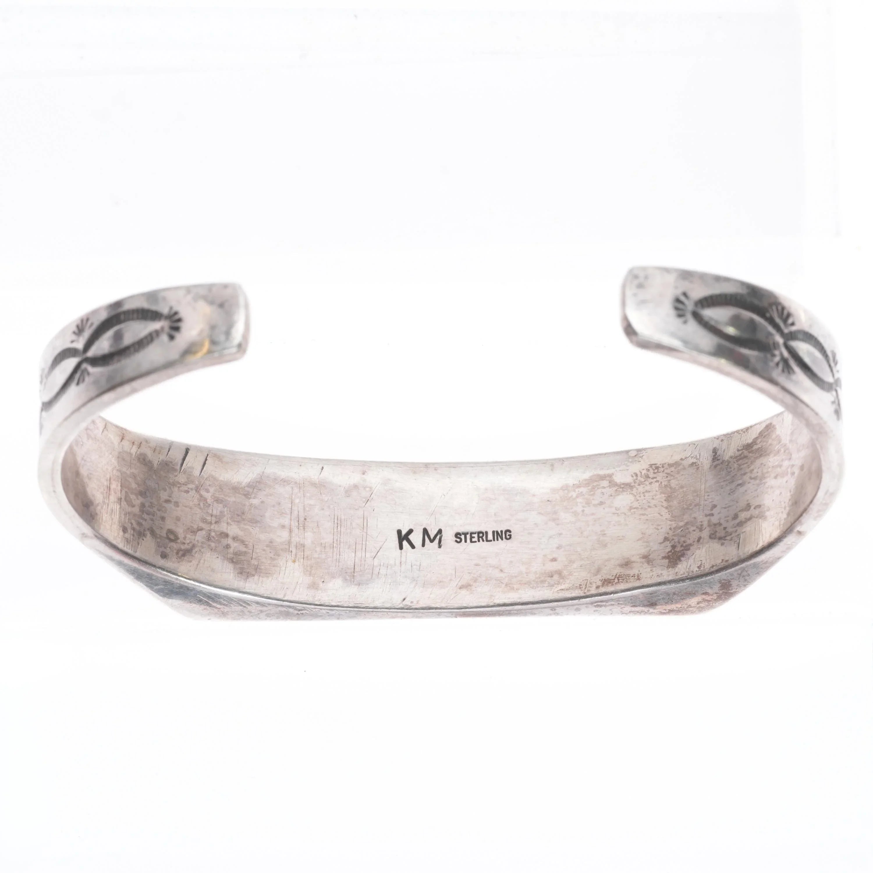 6.5" KM Navajo sterling silver hand stamped flat face cuff bracelet. Tested and guaranteed solid sterling silver with weight and measurements in pictures. Good condition, circa last quarter of the 20th century with no damage. Unknown artist.