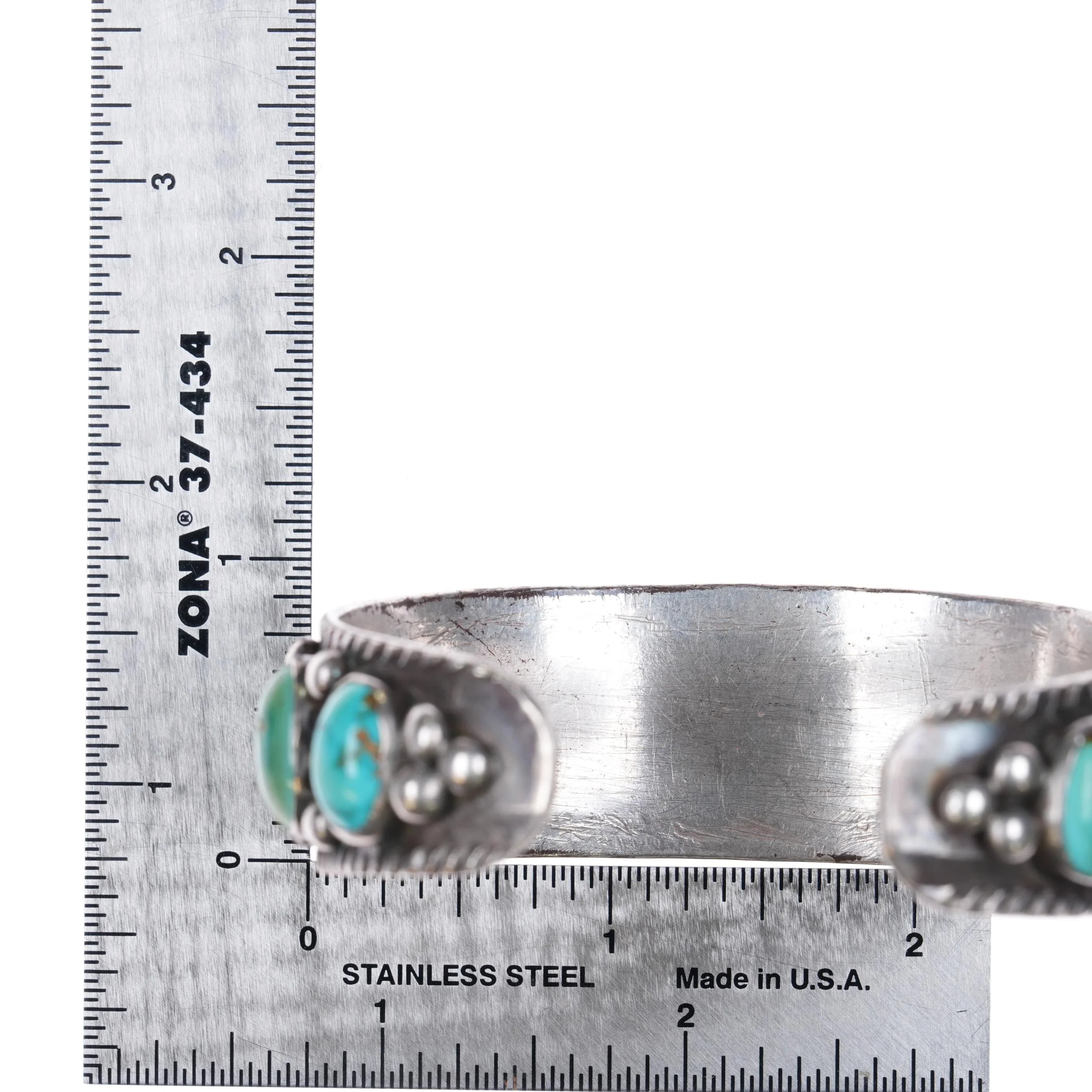 6.5" Large 30‘s-40‘s Navajo chiseled rim turquoise row cuff bracelet. Tested and guaranteed solid sterling silver with no markings. Weight and measurements in pictures. Some expected wear, no cracks or breaks. Very sturdy. Substantial bracelet from the second quarter of the 20th century.
