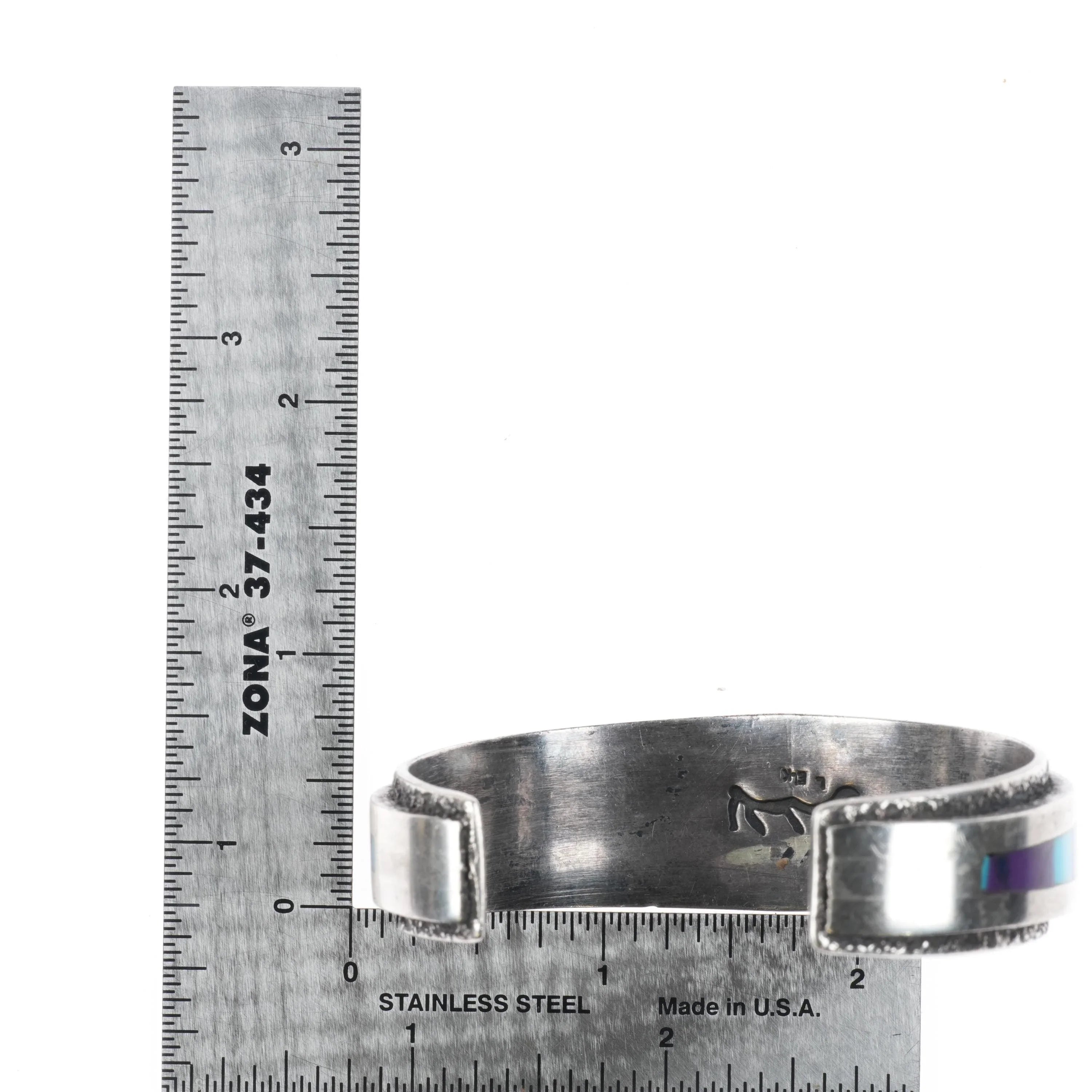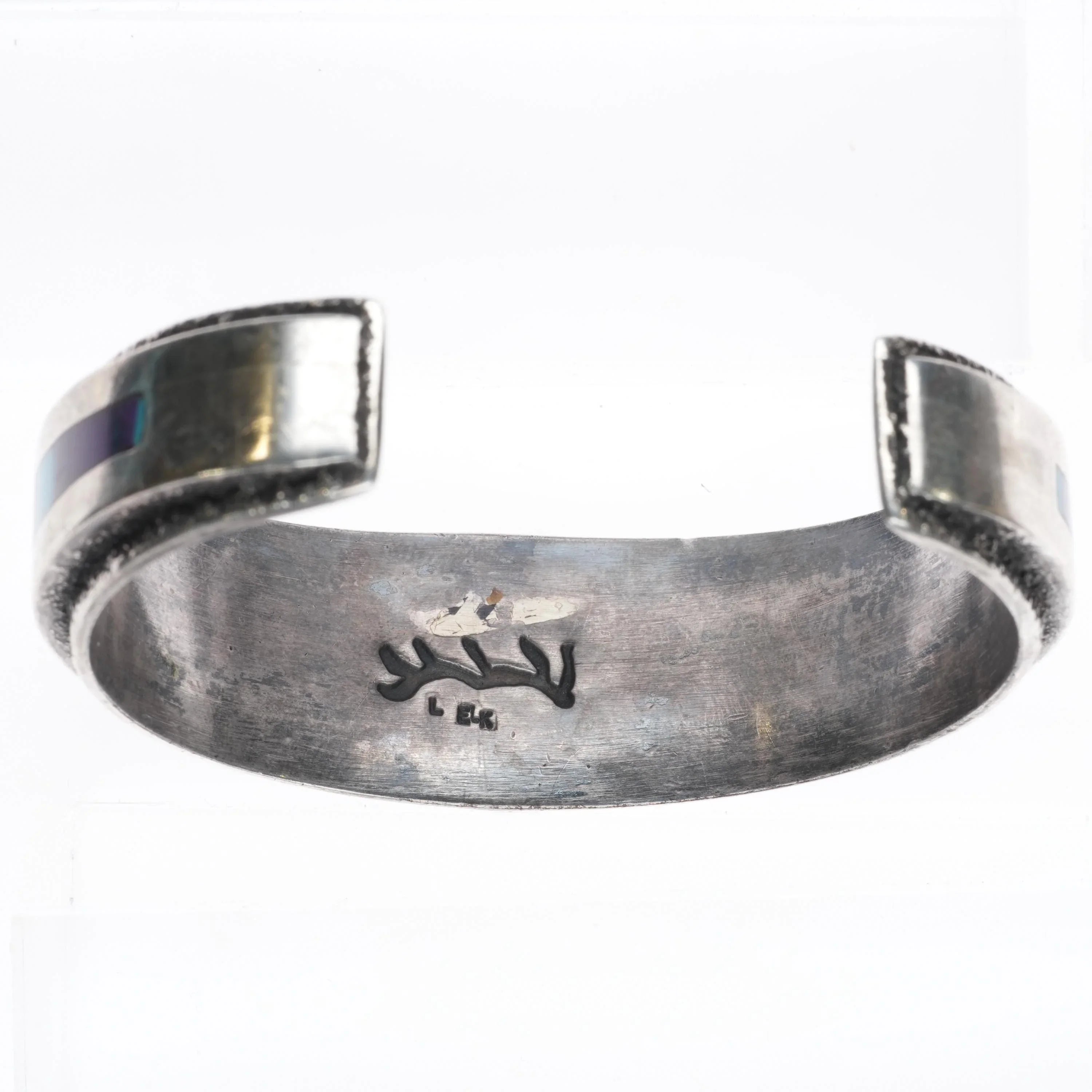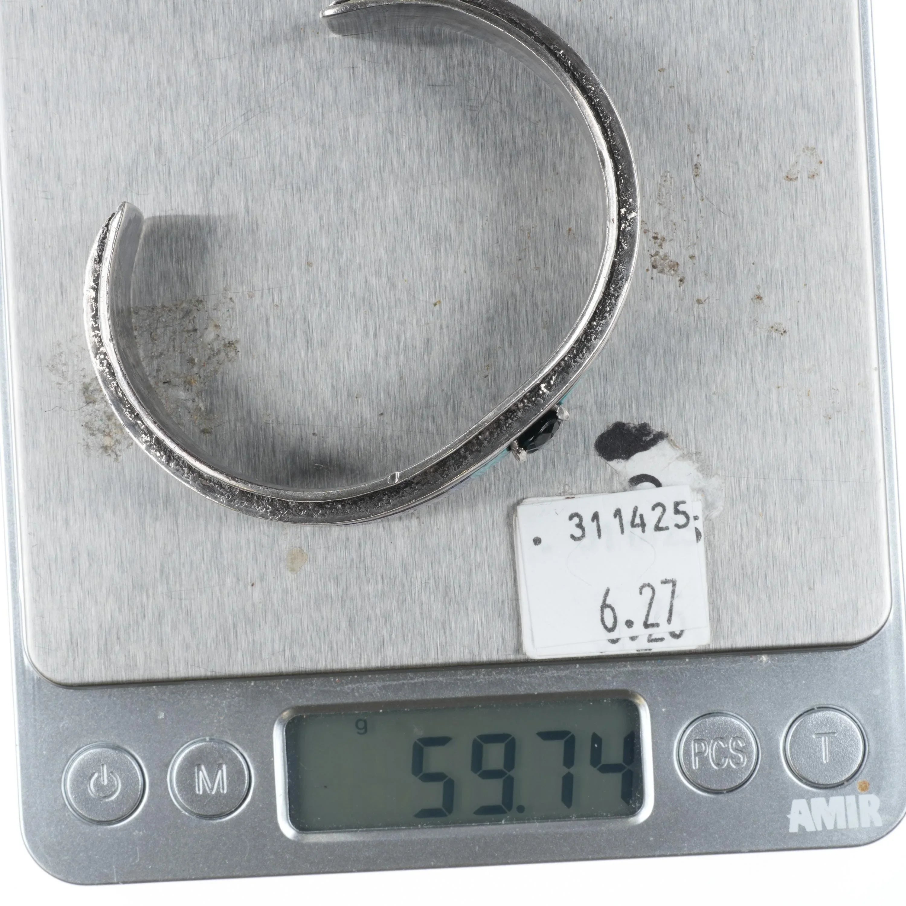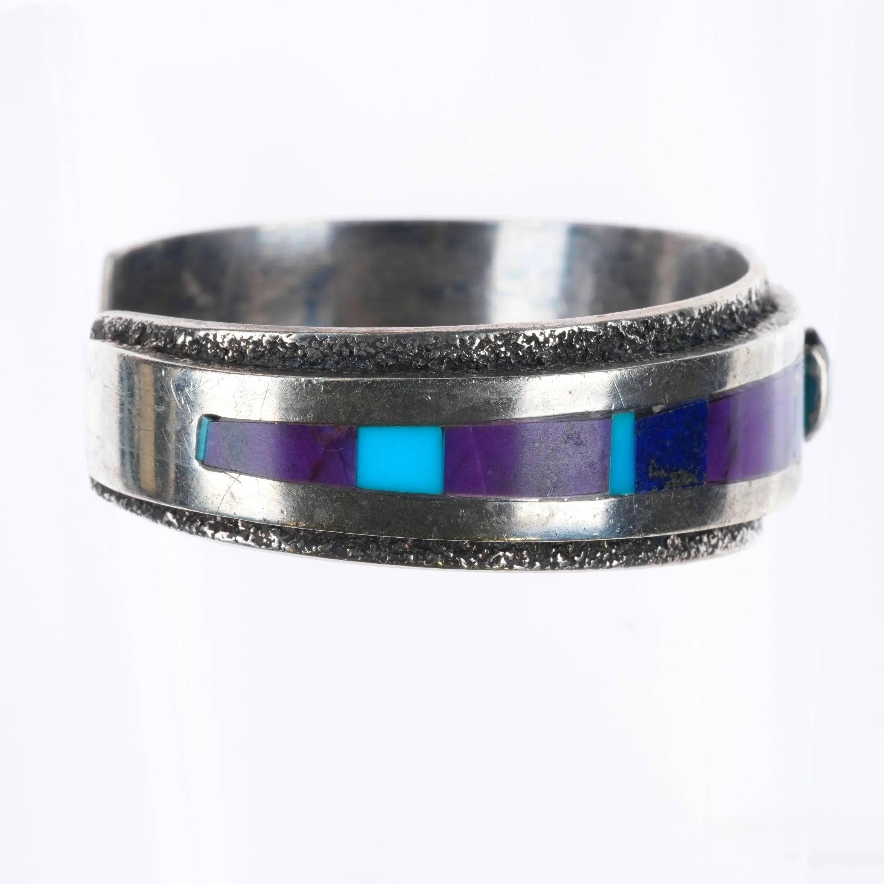 6.3" c1960‘s Vintage Modernist Navajo sterling silver coral row cuff bracelet with turquoise/lapis. Tested and guaranteed solid sterling silver. Weight and measurements in pictures. Some expected wear with no damage. Marked by the artist as shown.