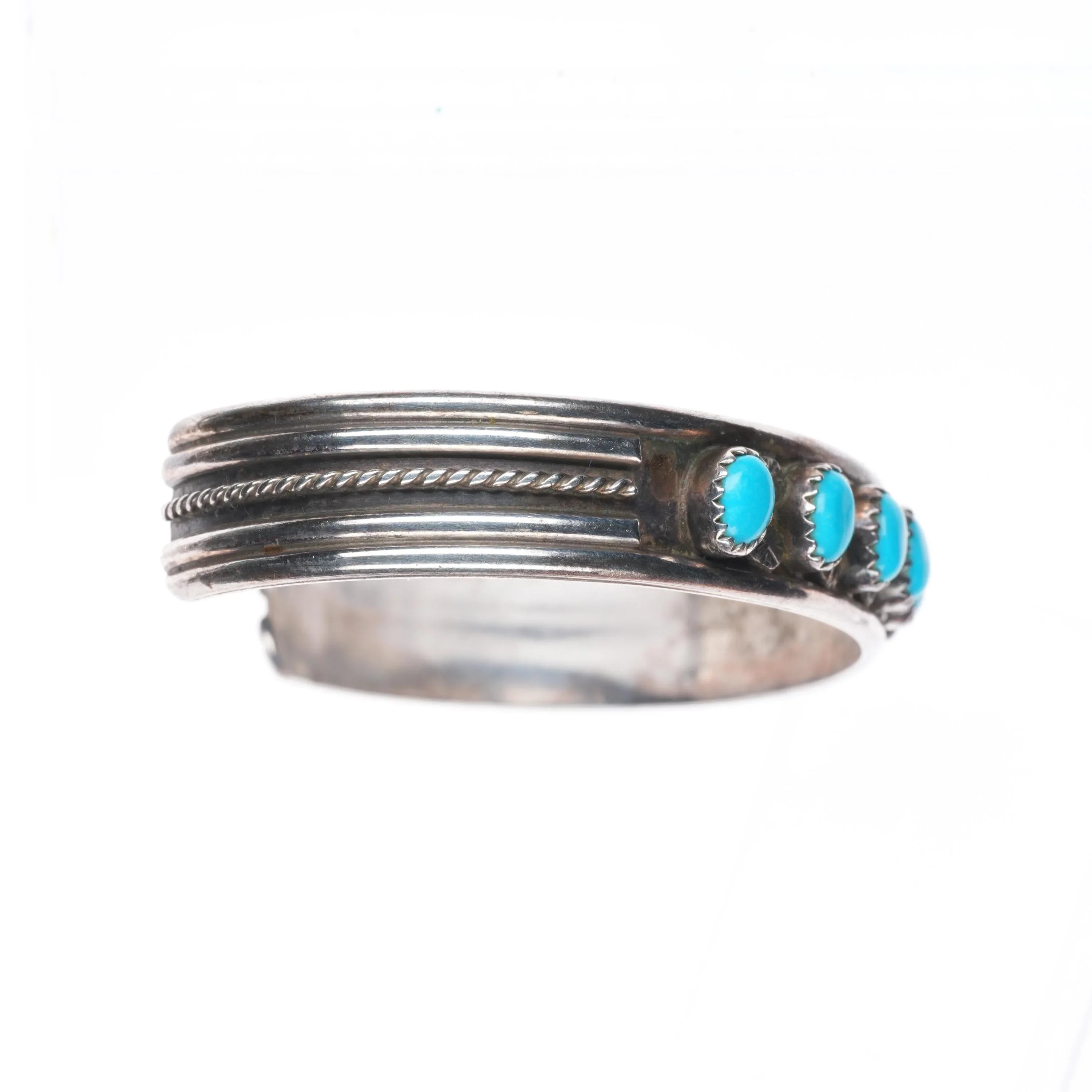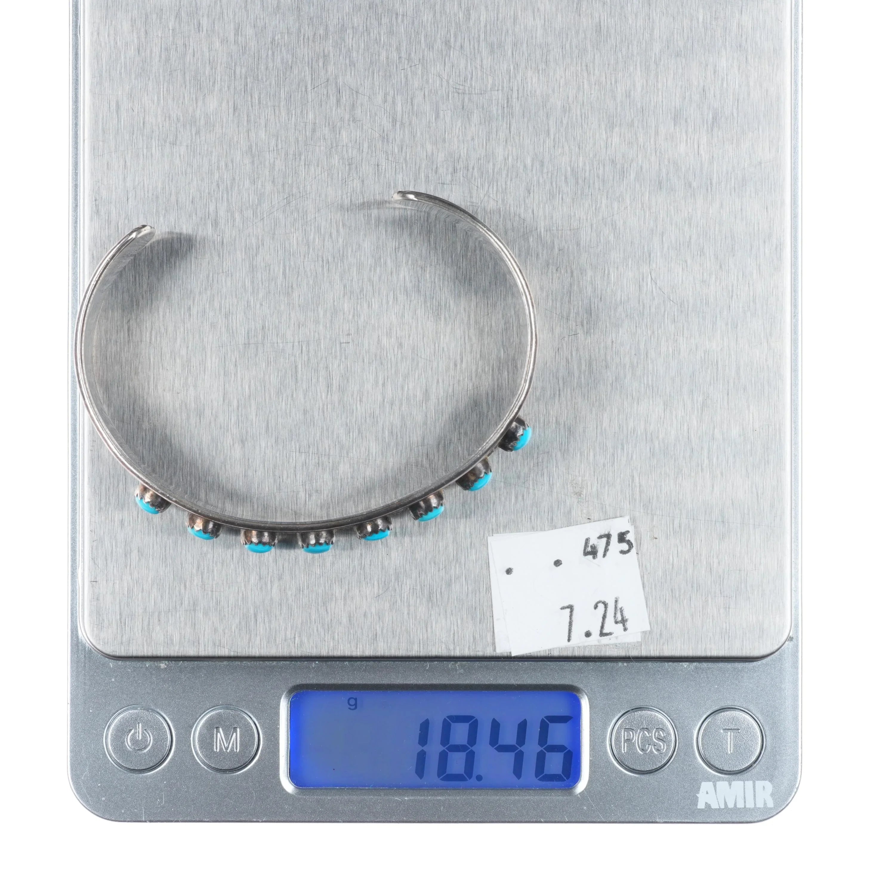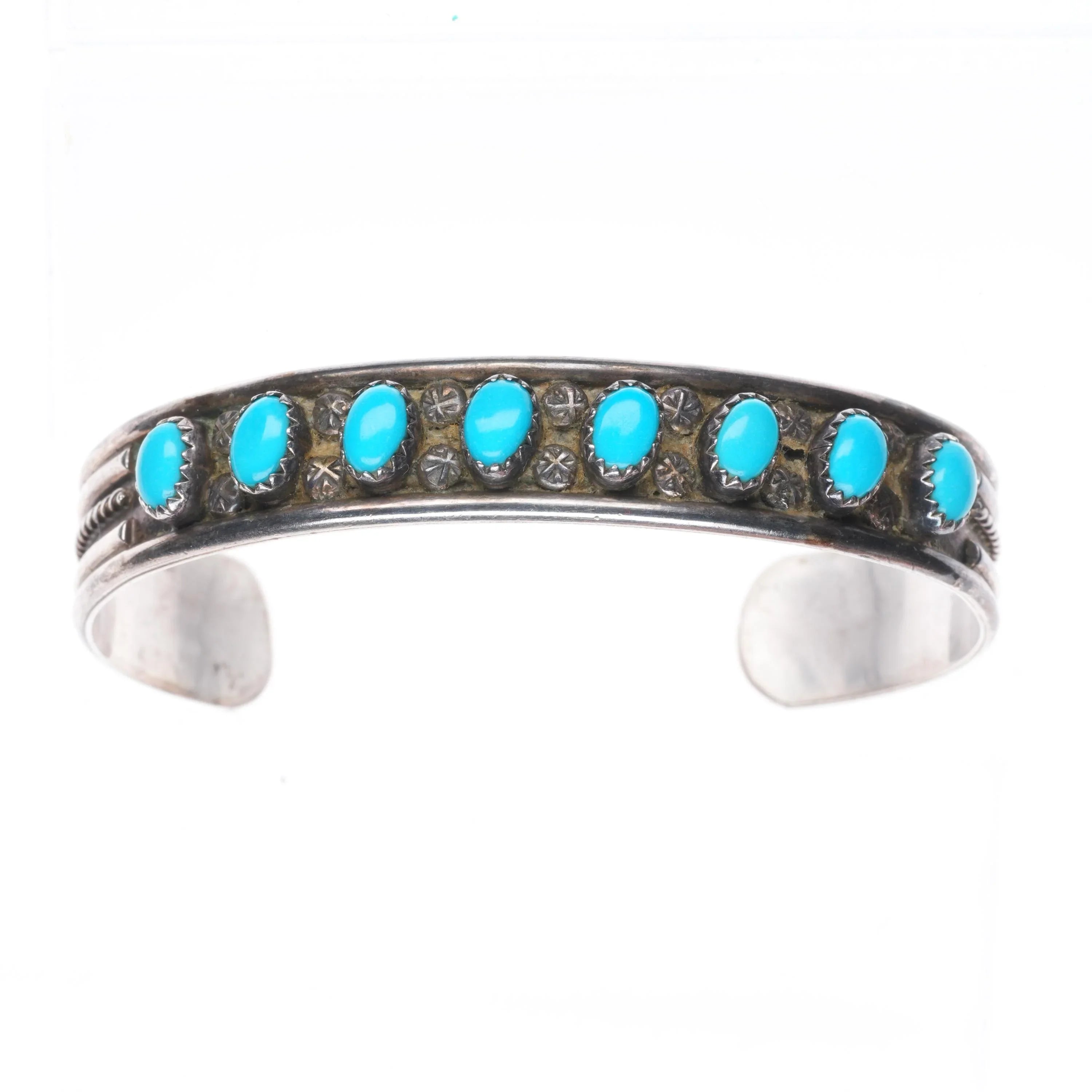 6.5" Paylee and Darlene Coonsis Zuni sterling silver turquoise row cuff bracelet. Tested and guaranteed solid sterling silver with weight and measurements in pictures. Good condition, circa last quarter of the 20th century with no issues.