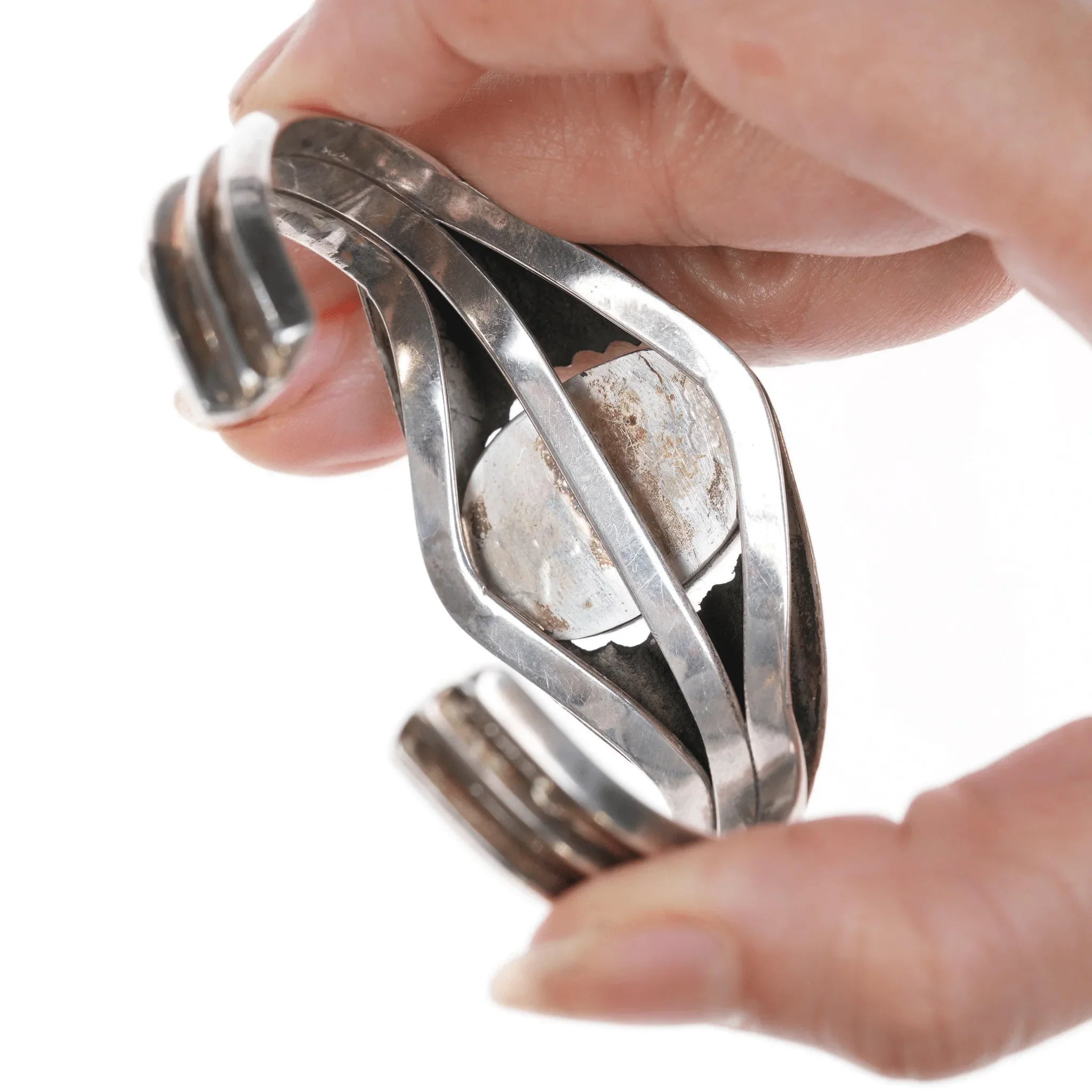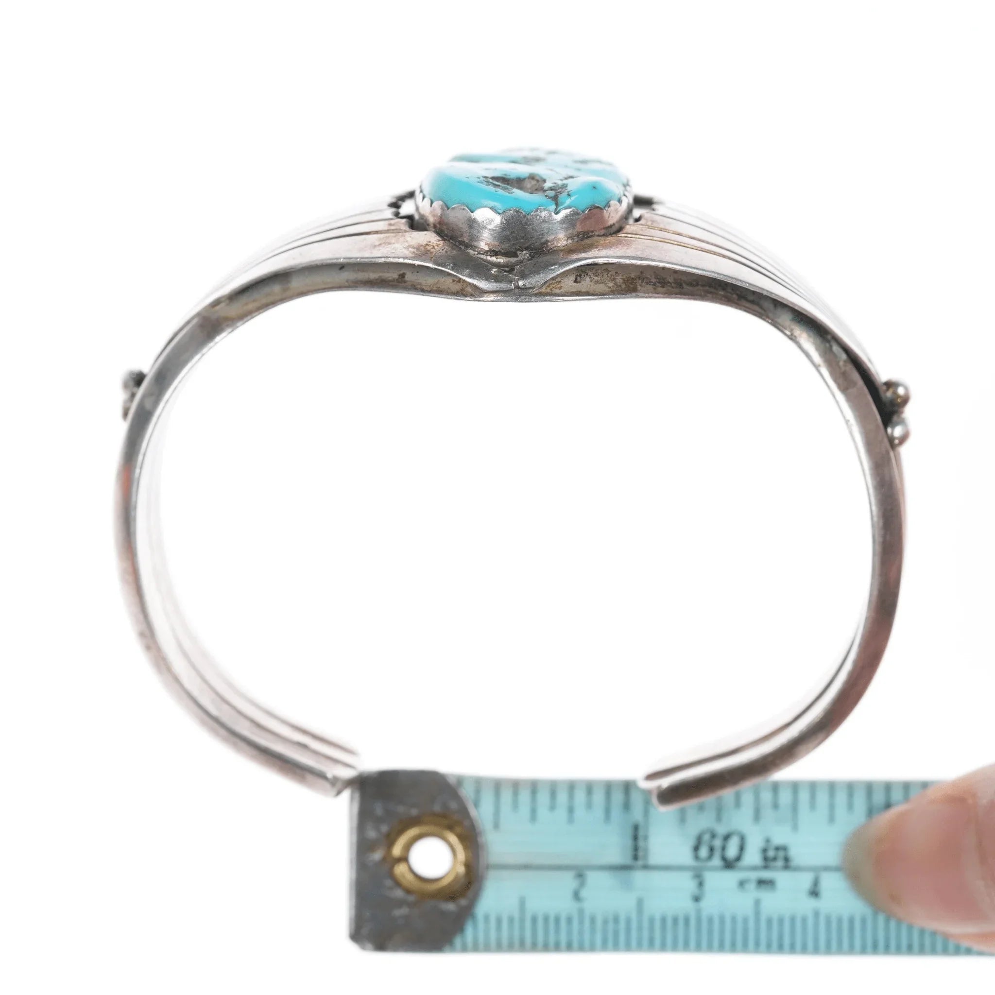 6.5" 1930's Navajo Whirling Logs stamped silver cuff bracelet with turquoise<br><br>Marked or unmarked as shown in pics, weight and other measurements in pics. Sorry but my jewelry is stored in a secure location and cannot be accessed for more pictures,<br>videos, or measurements until sold. If you look at pictures/description your<br>question should be answered. Thank you so much for your time and consideration!<br><br>All precious metals are tested and guaranteed. A Native American jewelry piece referred to as "silver" or "ingot" is guaranteed to be at least 90% silver. Bracelets are photographed on a 6" women's wrist.