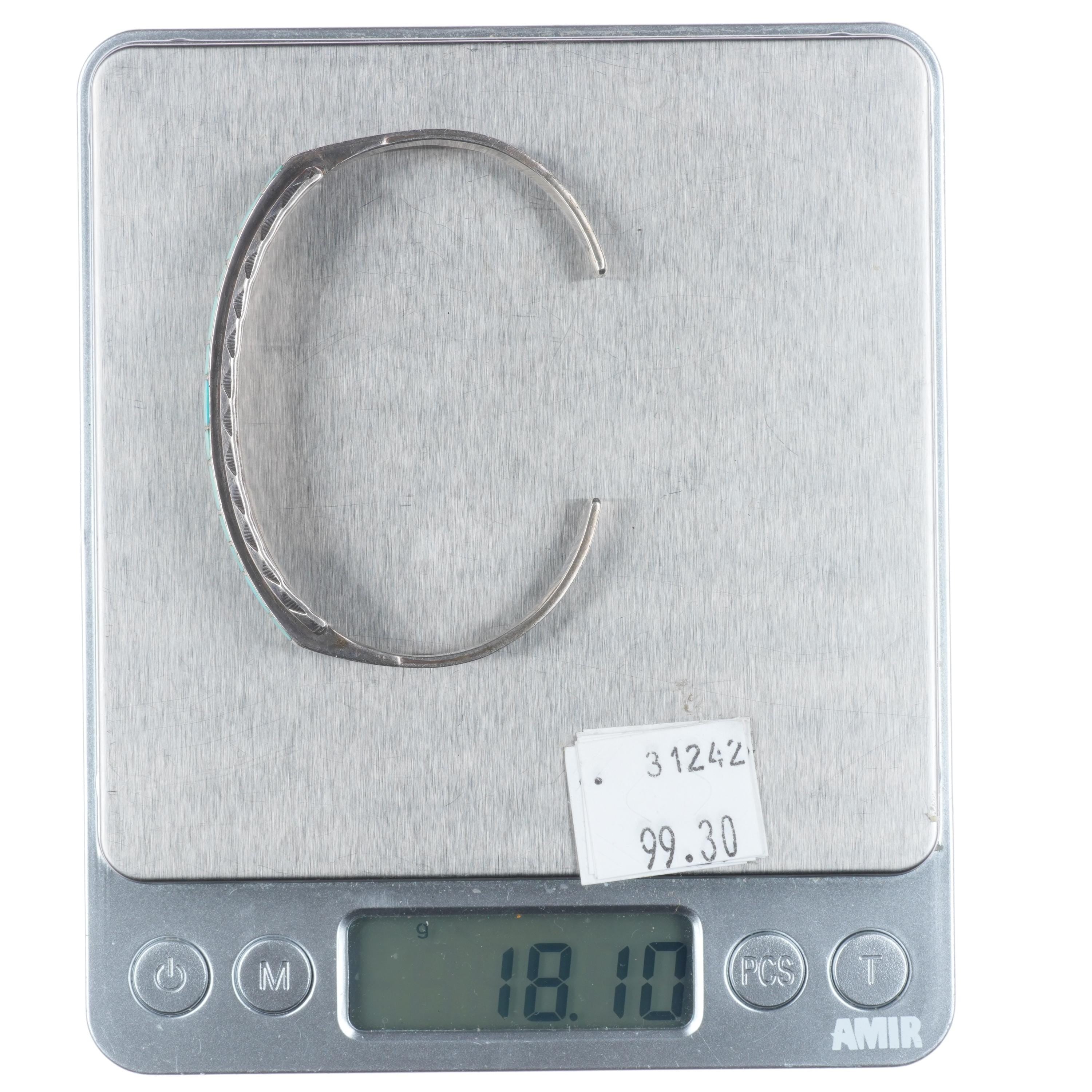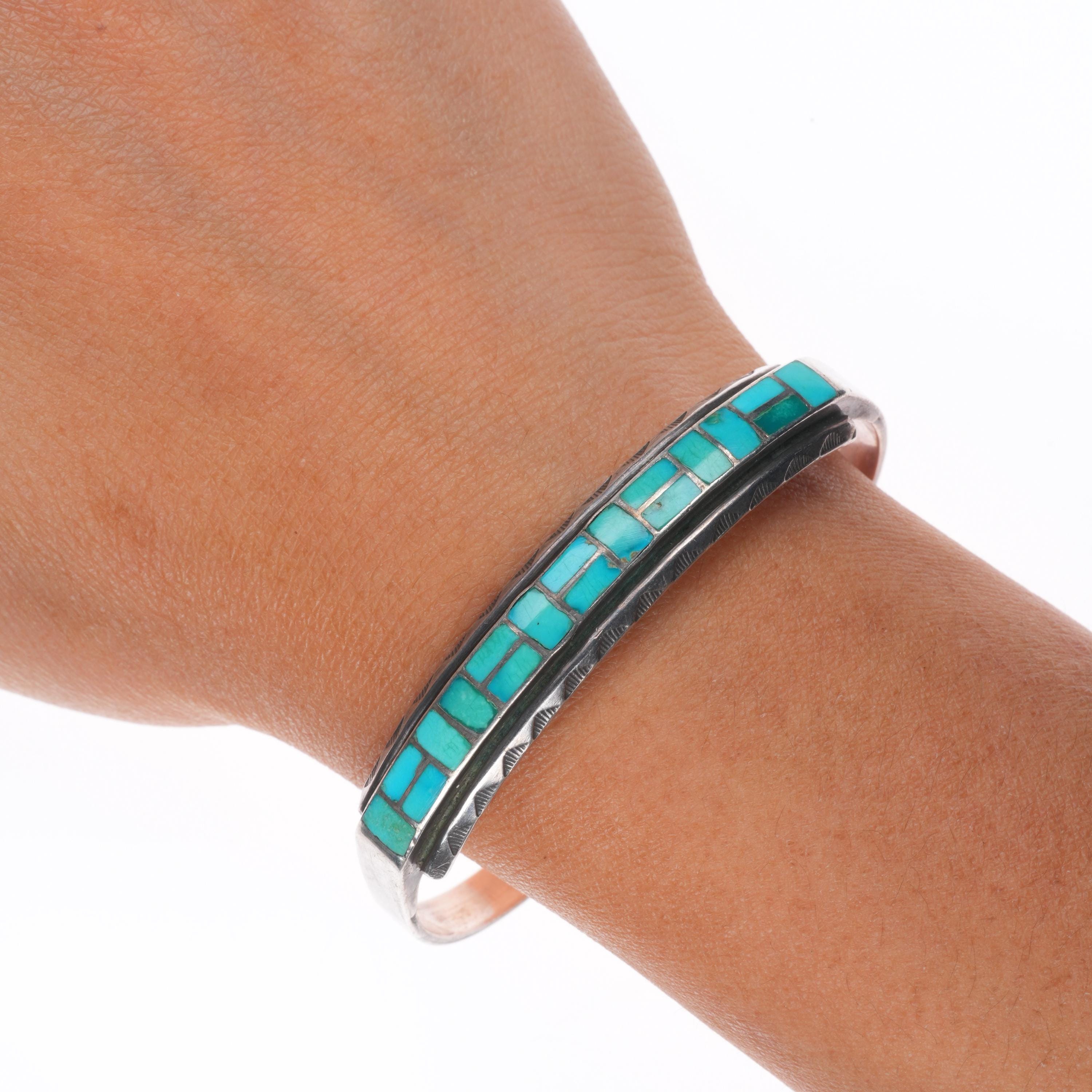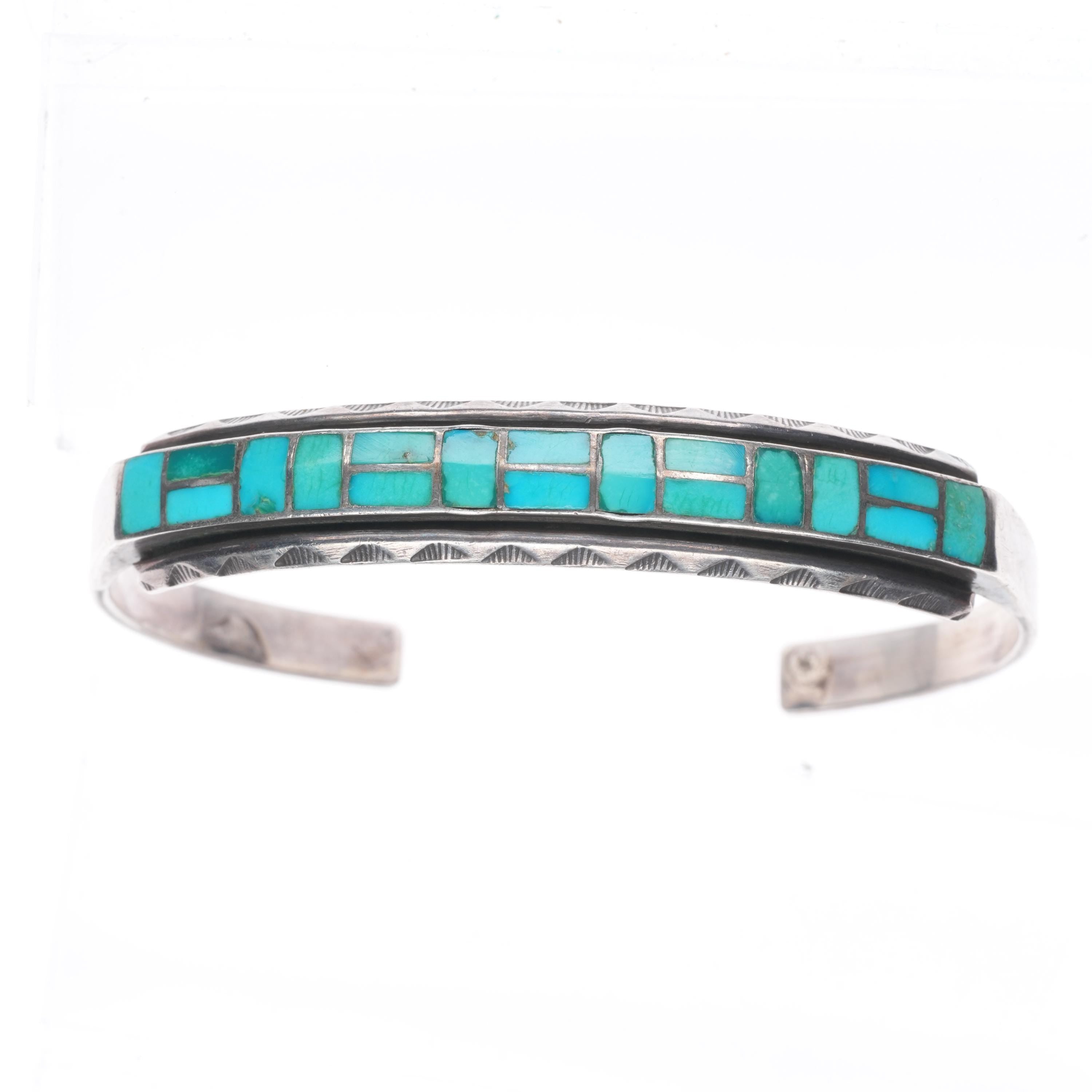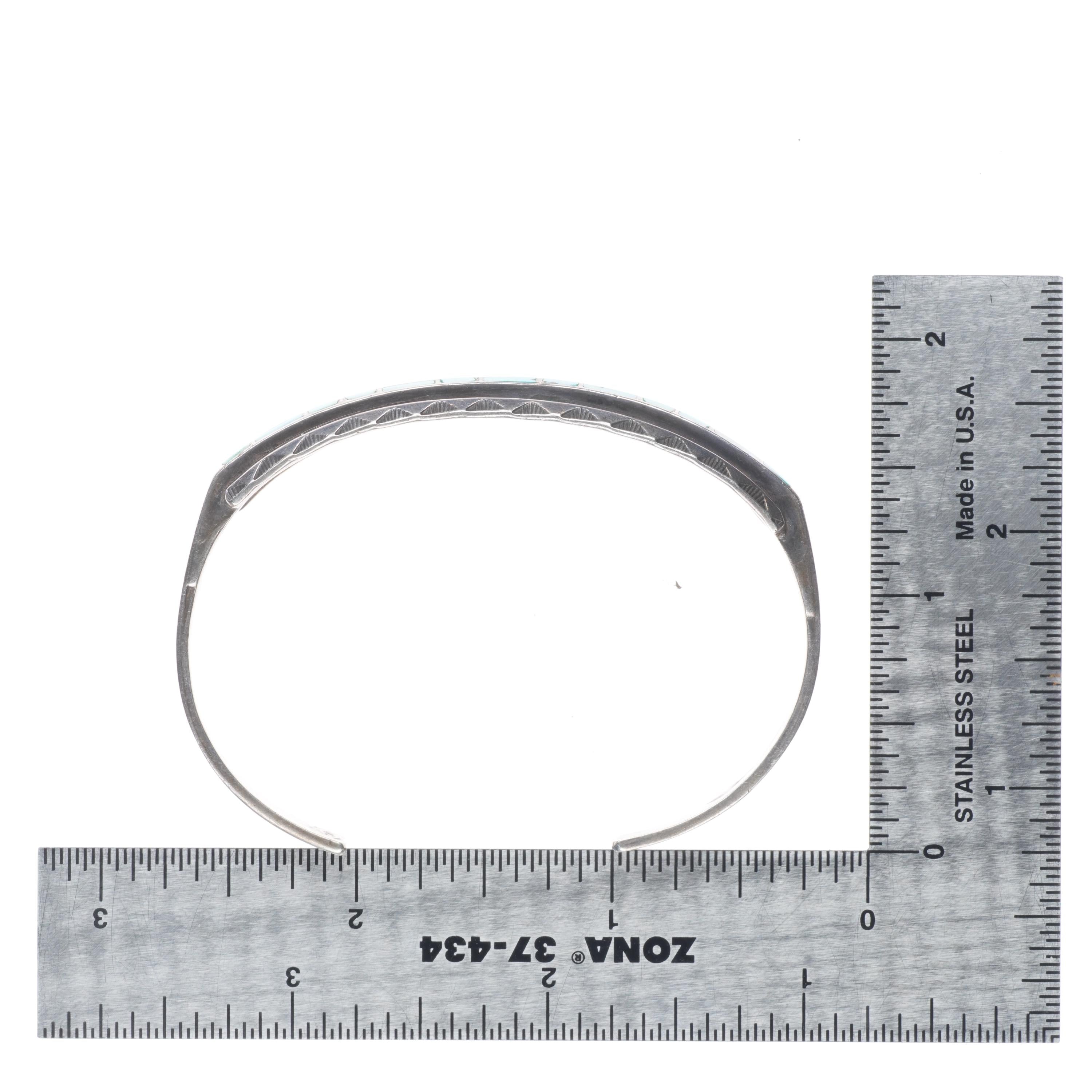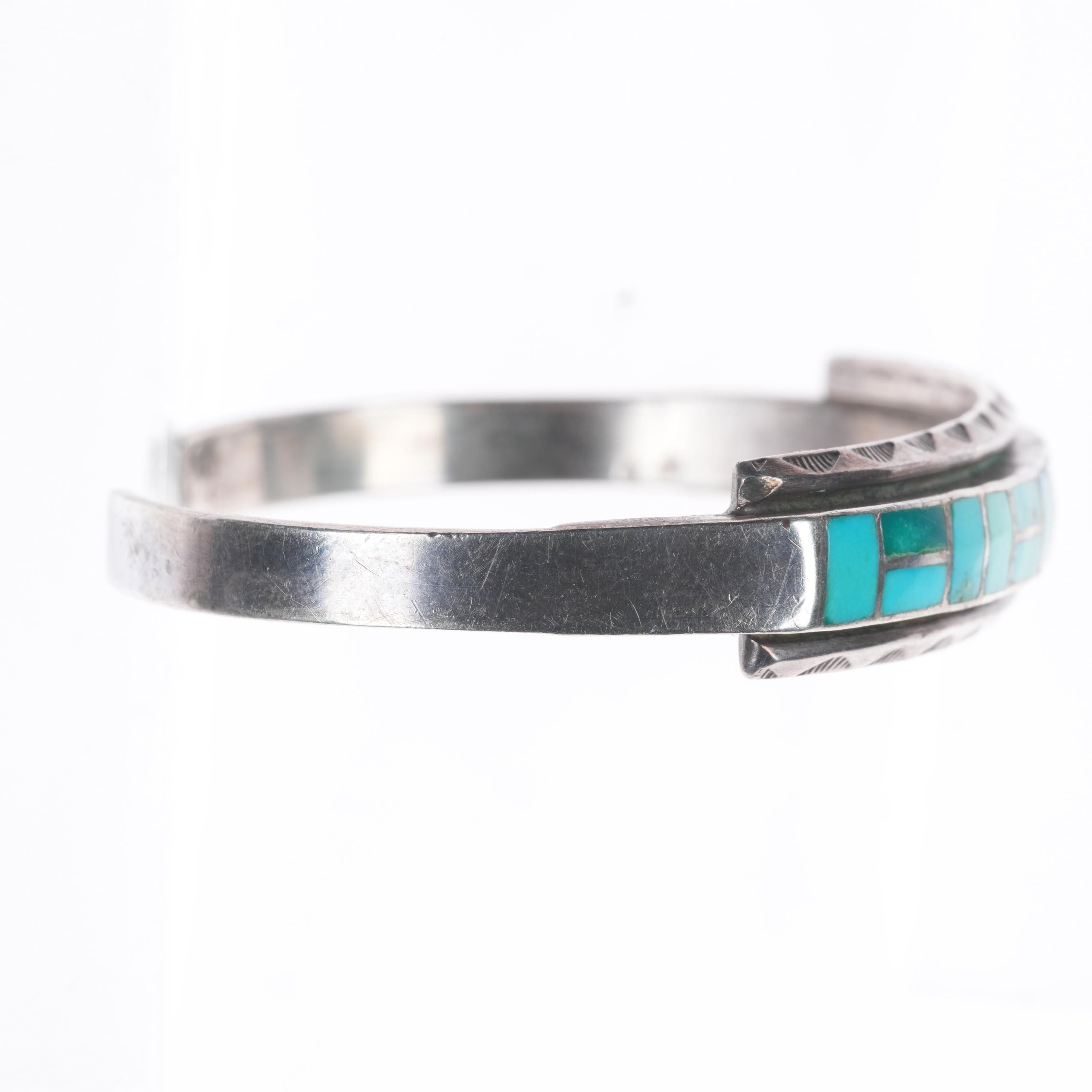 6.5" Vintage Zuni sterling silver channel inlay hand stamped cuff bracelet. Tested and guaranteed solid sterling silver with weight and measurements in pictures. Circa third quarter of the 20th century. Fits up to a 6.5" wrist without adjustment, though .25" or more of careful adjustment is typically very simple. Any adjustment will change the gap size of course which is shown in the pictures. Illegibly marked.