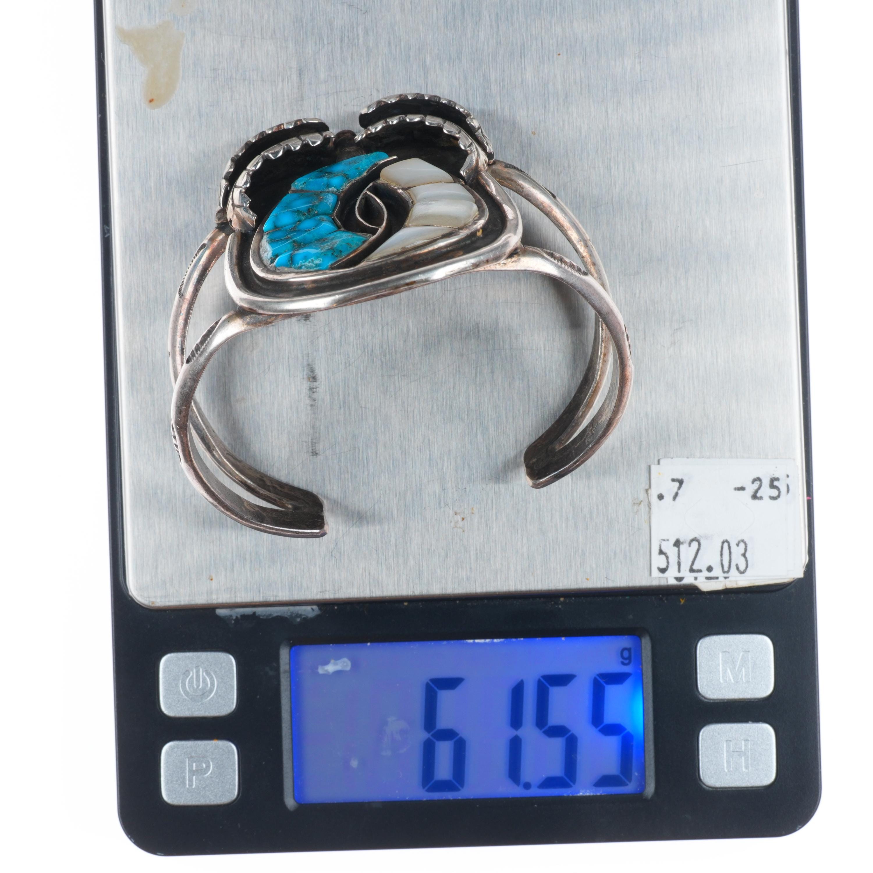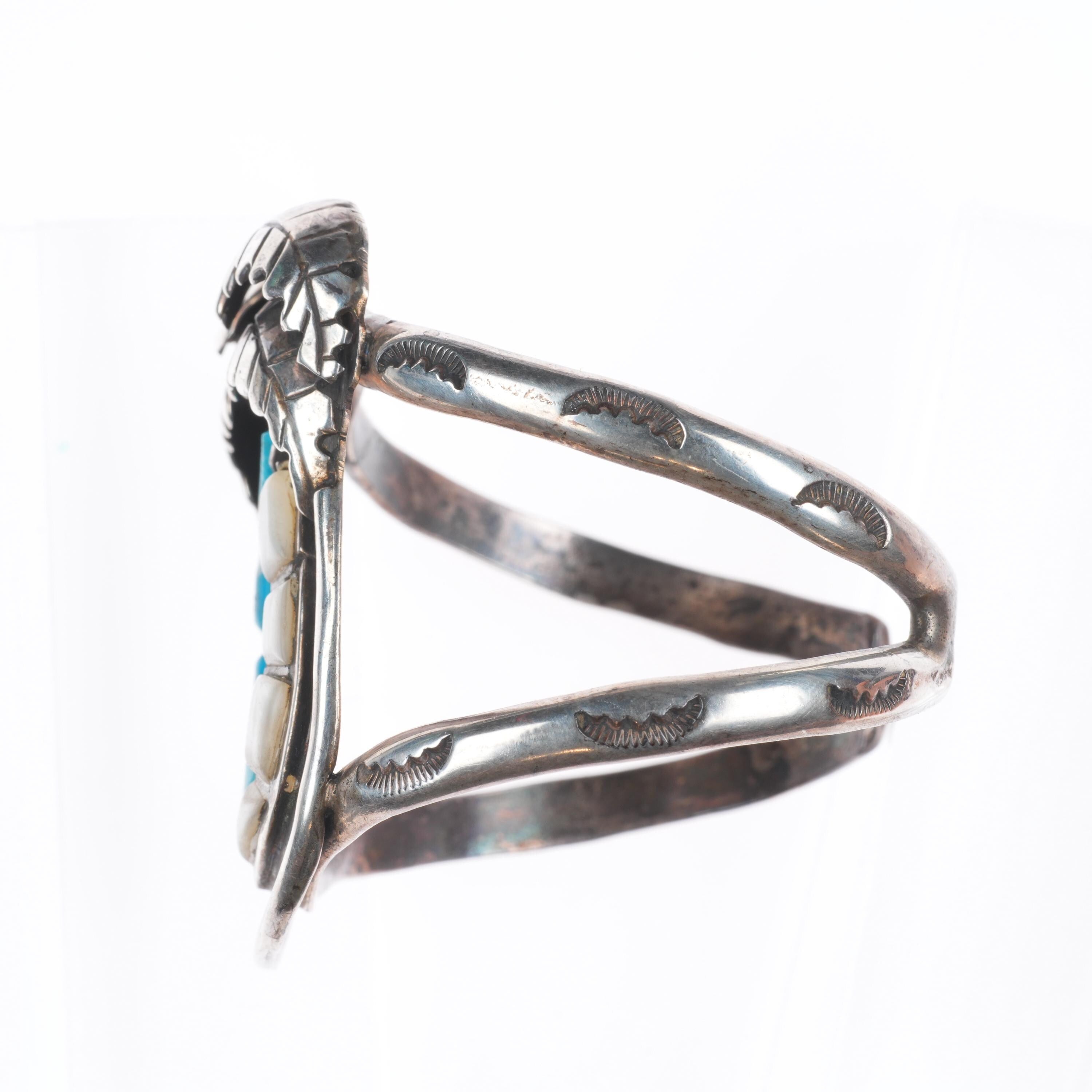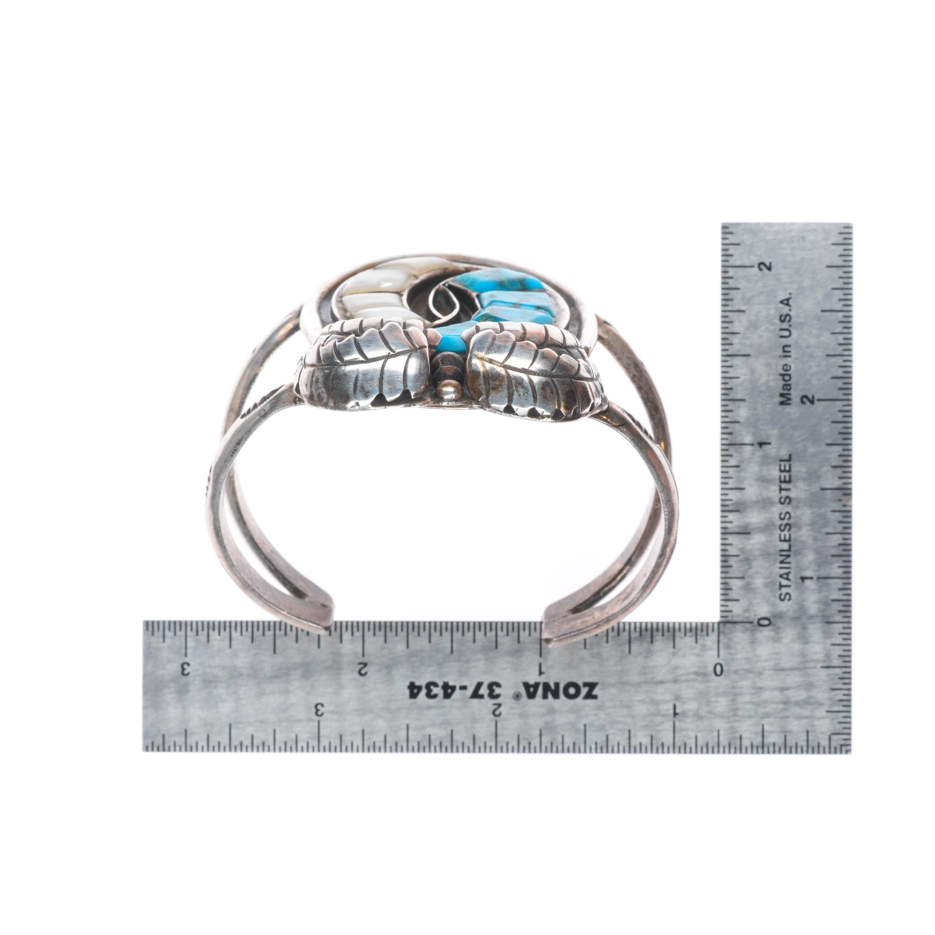 6.5" Vintage Zuni sterling silver spiderweb turquoise/shell inlay cuff bracelet. Tested and guaranteed solid sterling silver with weight and measurements in pictures. Circa third quarter of the 20th century with some expected age appropriate wear. Old Gilbert Ortega Shop mark.