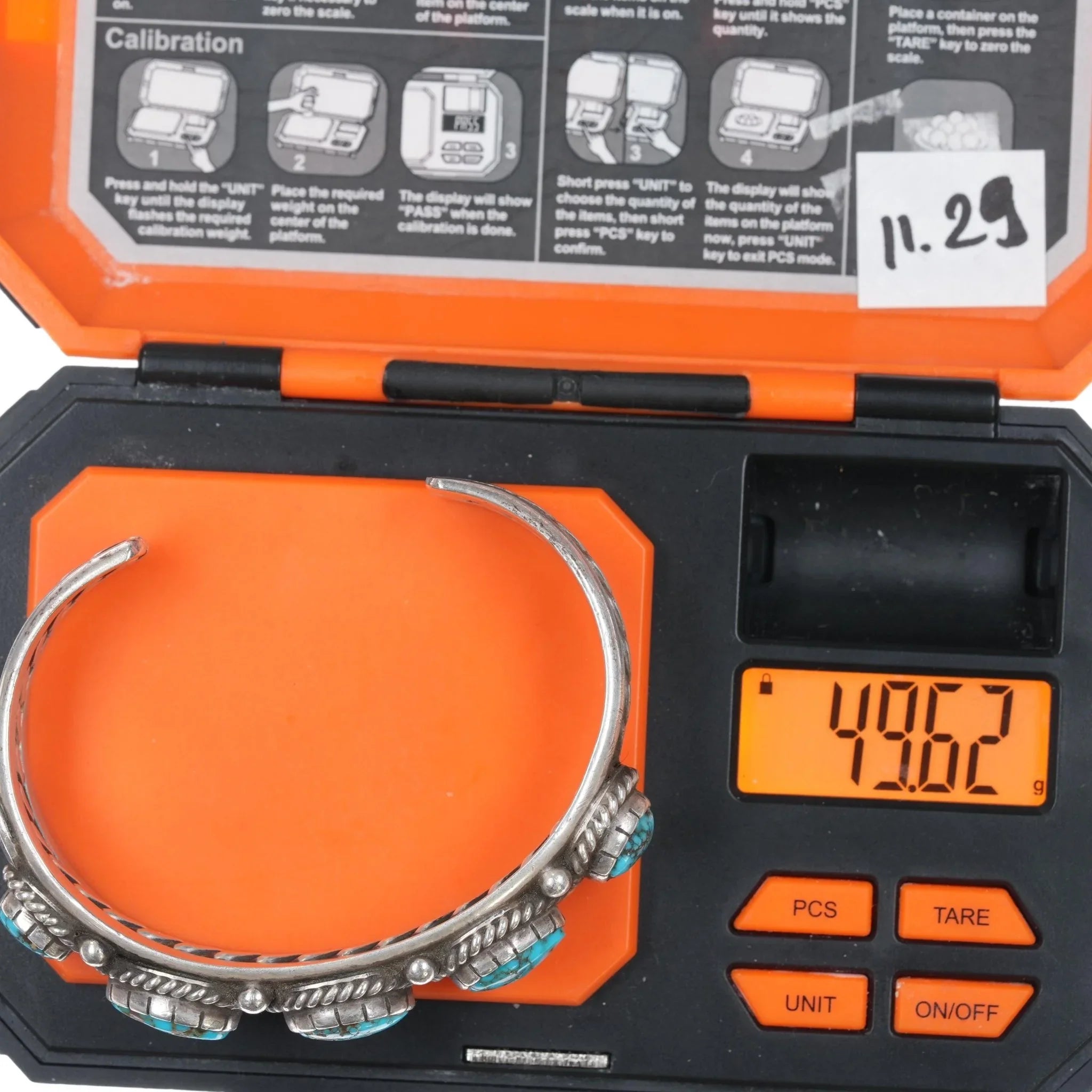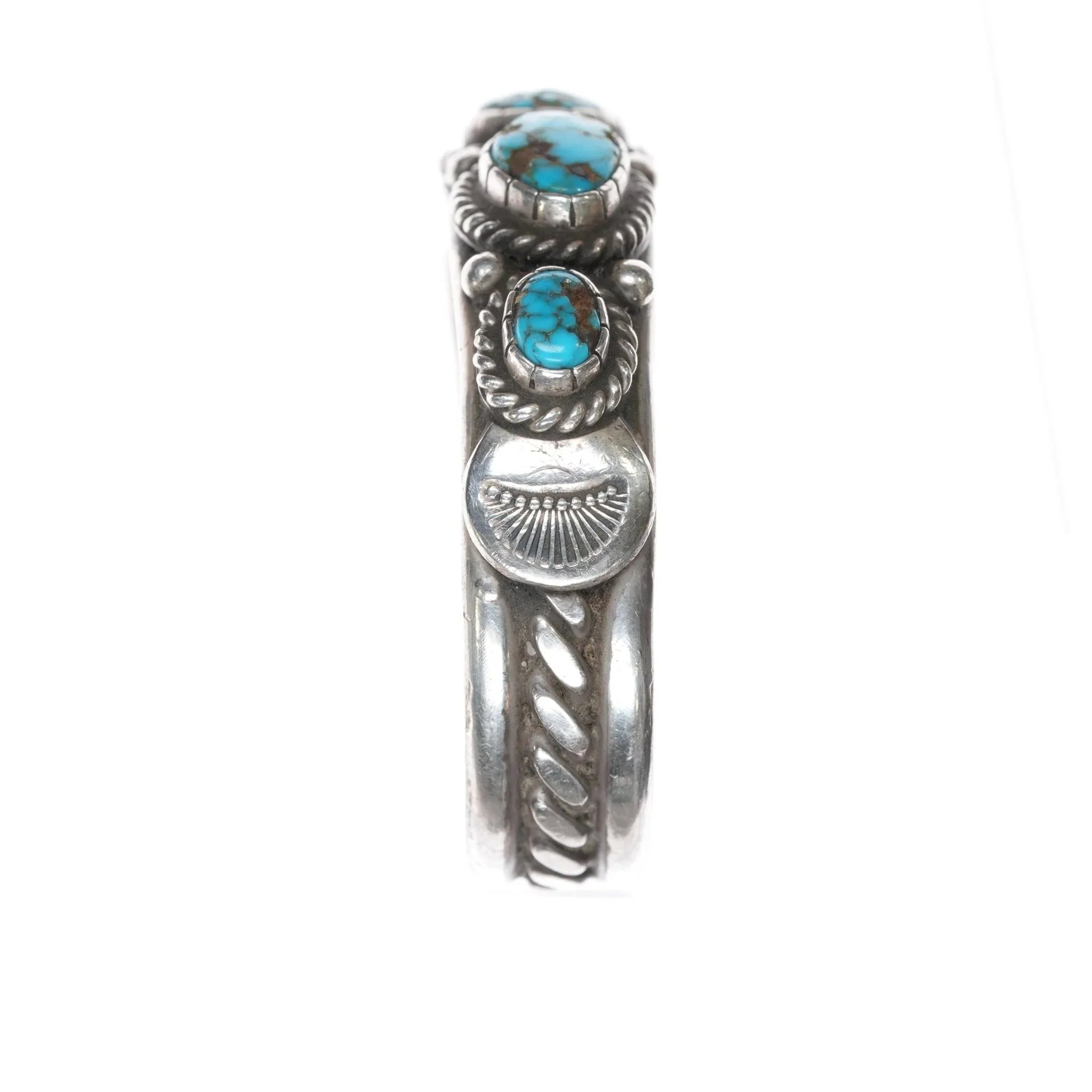 6.5" Wil Vandever Navajo sterling spiderweb turquoise row cuff bracelet. Weight and measurements in pics. Only has the decorative stamped design on one side, I believe it was made like this in the revival style to look like an early Navajo bracelet. You be the judge.
