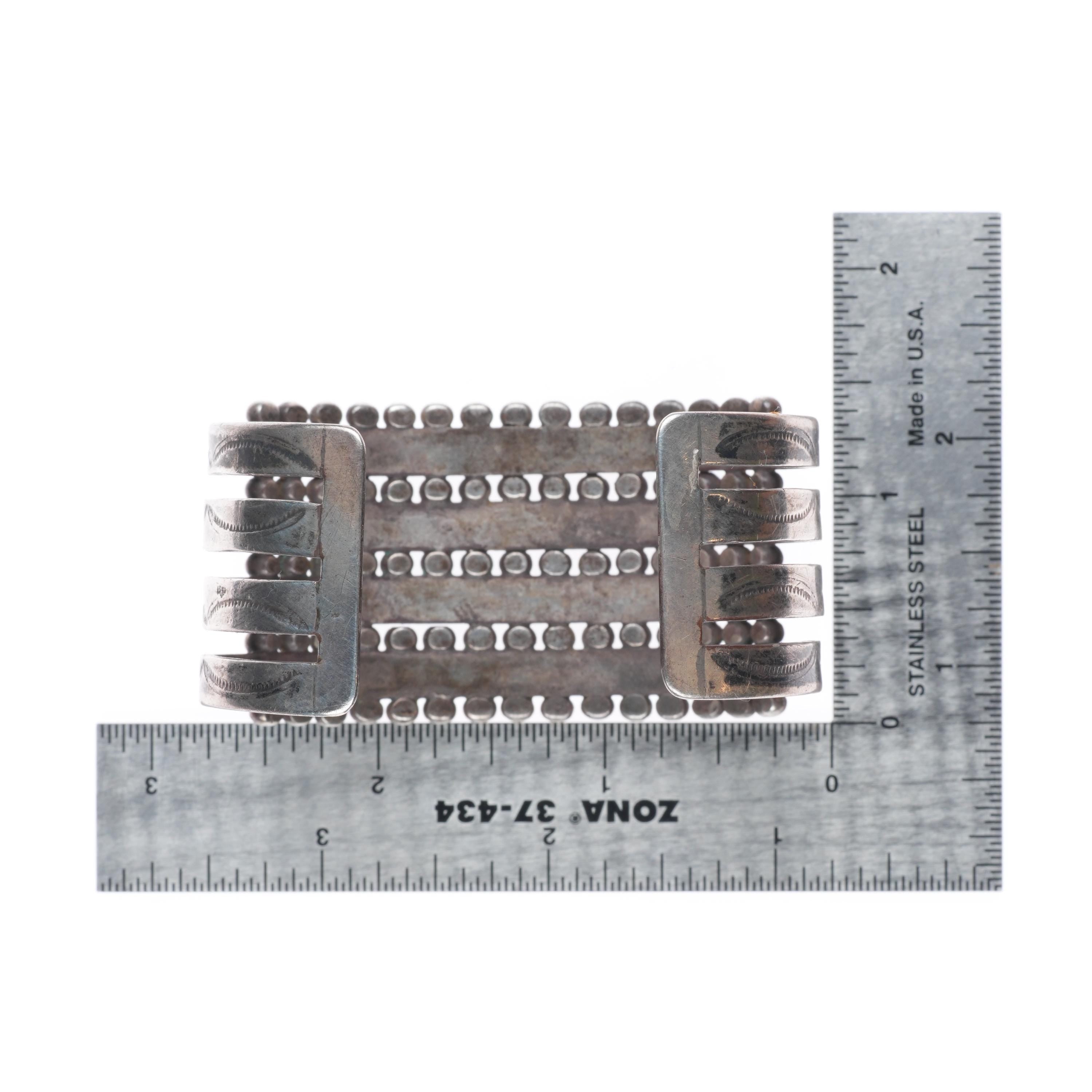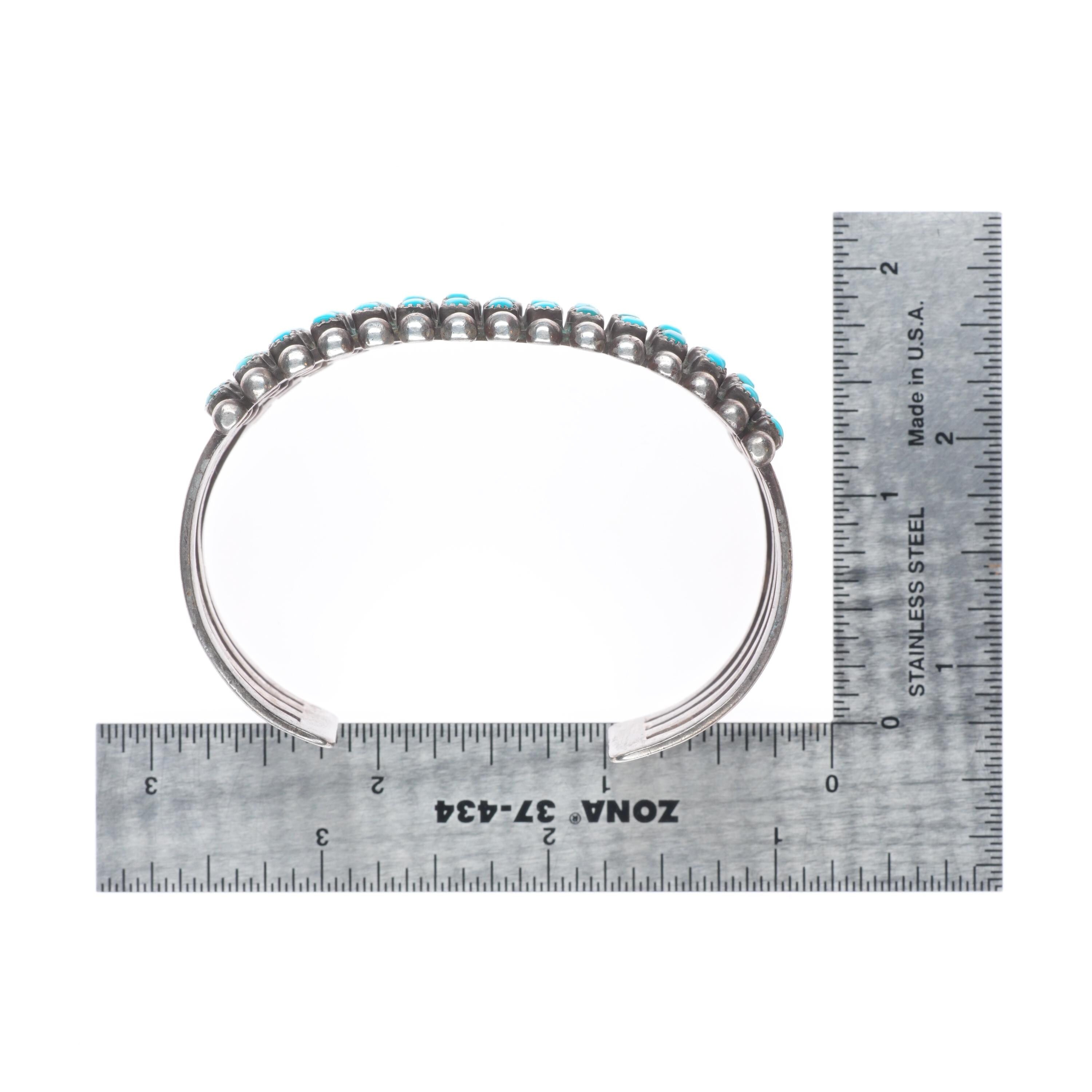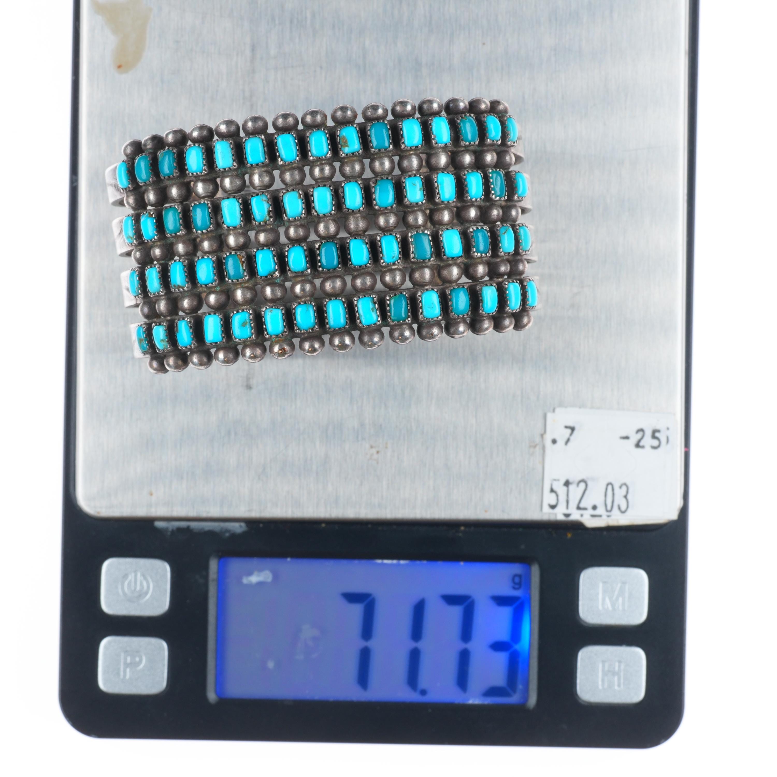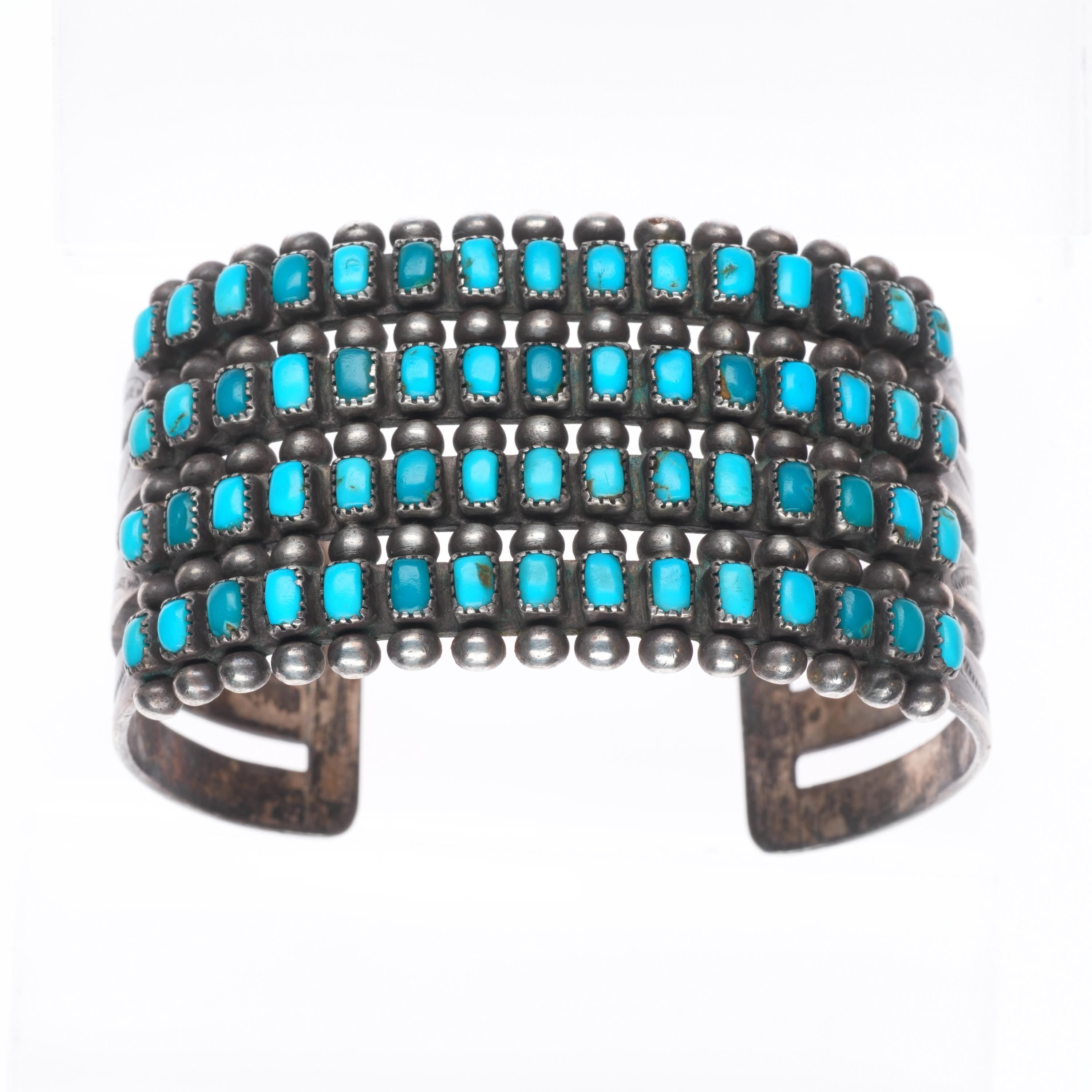 6.6" 1940's Zuni 4 row square cut natural turquoise cluster cuff bracelet. Tested and guaranteed solid sterling silver with weight and measurements in pictures. Circa second quarter of the 20th century with some expected age appropriate wear.