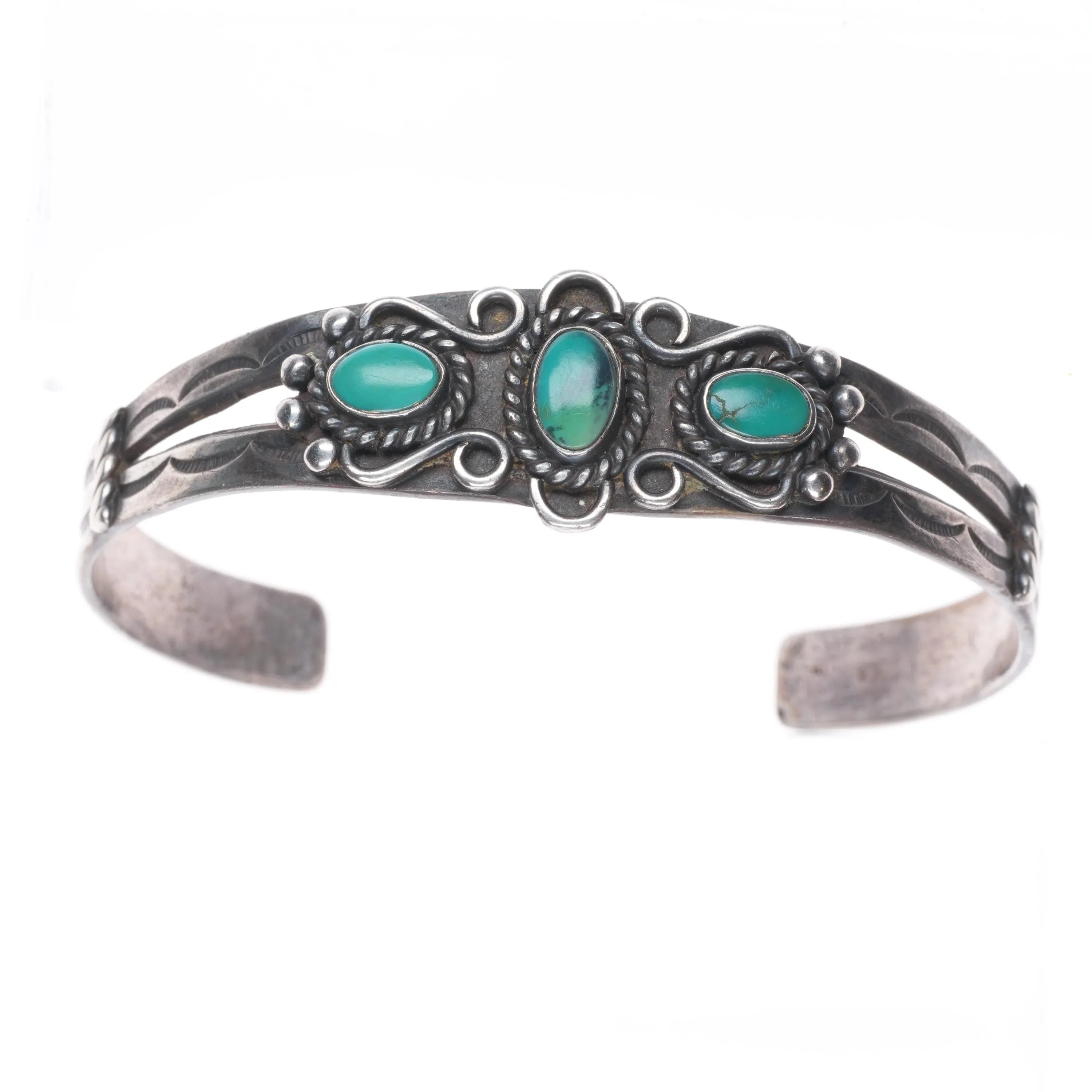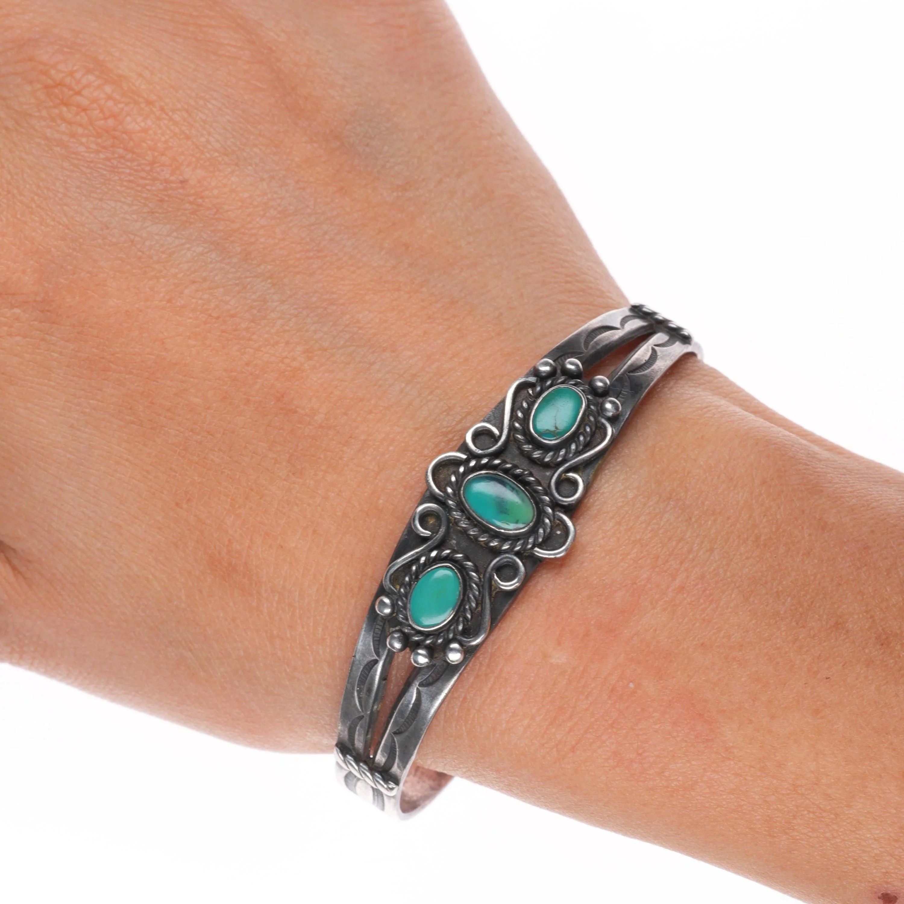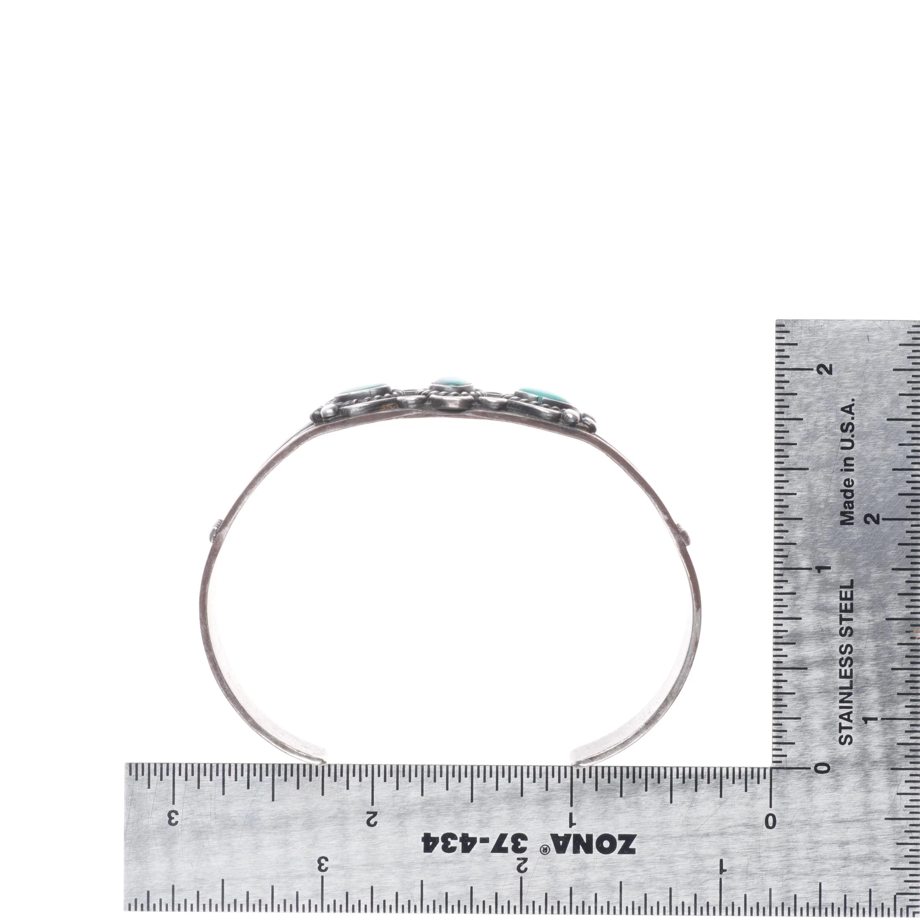 6.6" 30's-40's Navajo sterling silver green turquoise cuff bracelet 3 stone