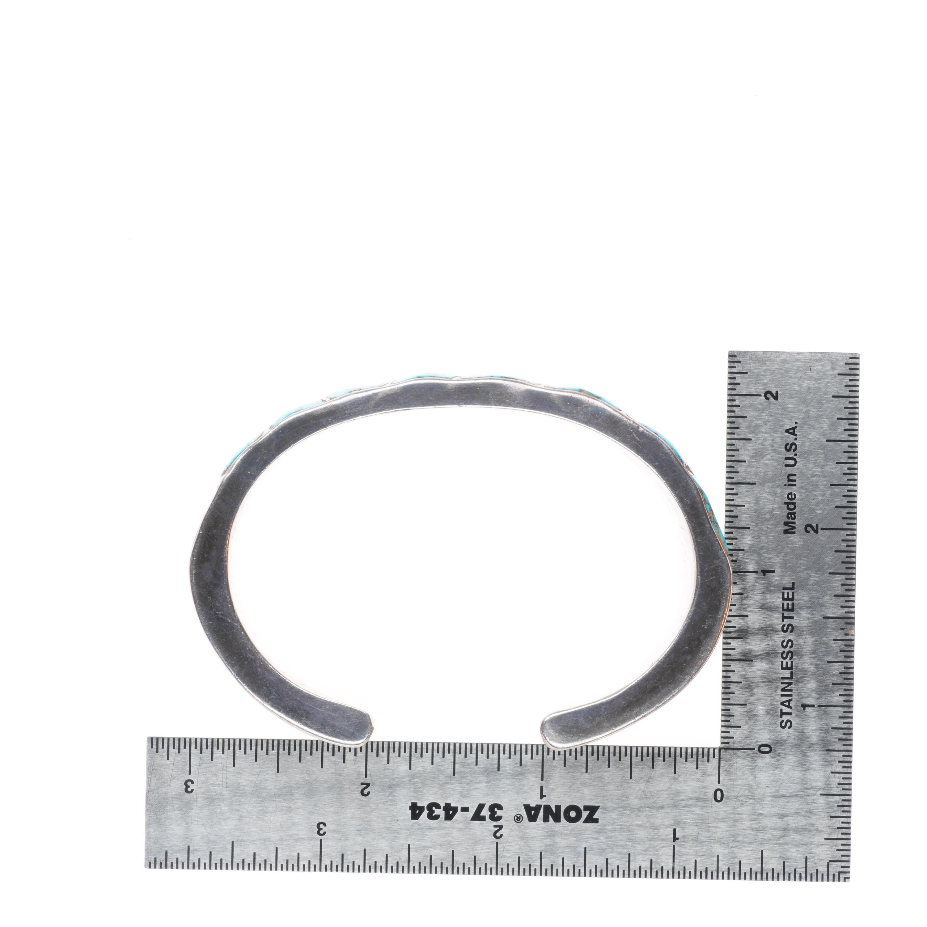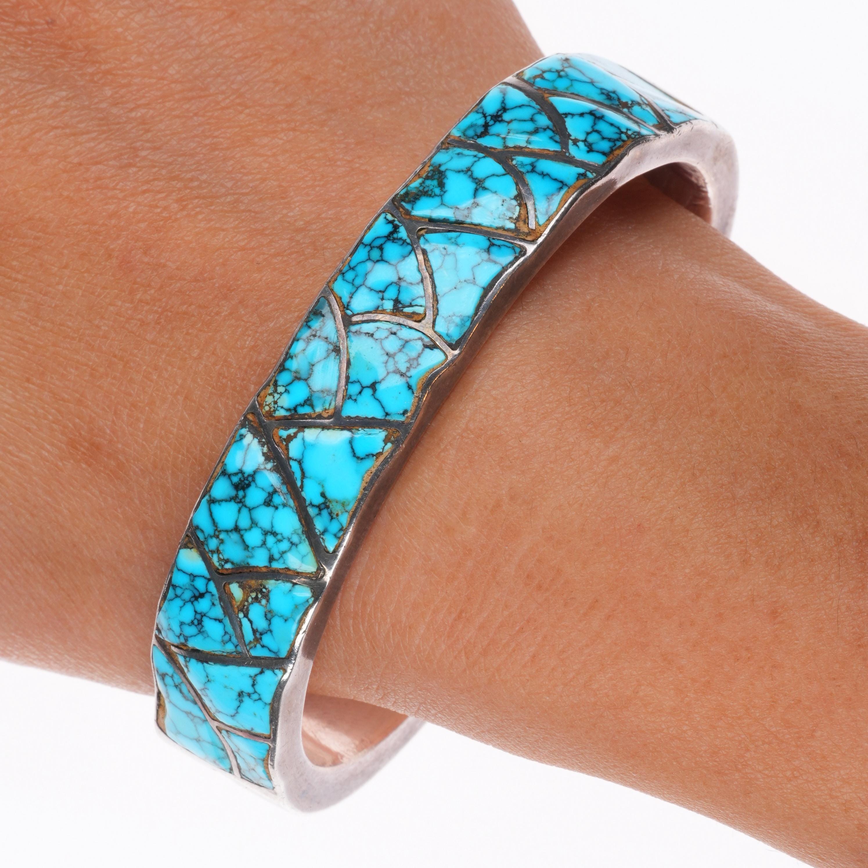 c1940 Zuni #8 spiderweb Turquoise sterling silver channel inlay cuff bracelet. Tested and guaranteed solid sterling silver with weight and measurements in pictures. Circa second quarter of the 20th century with age appropriate wear..