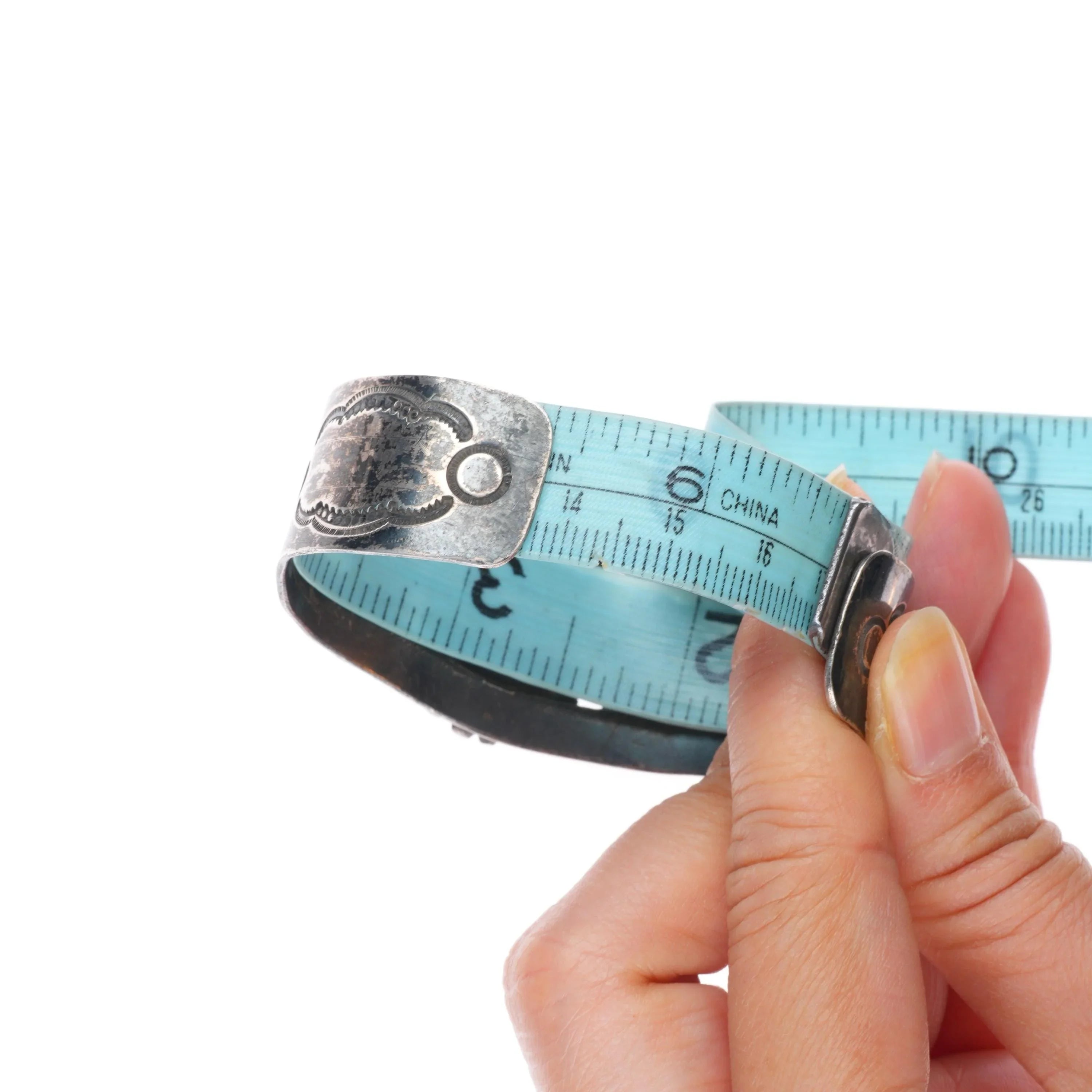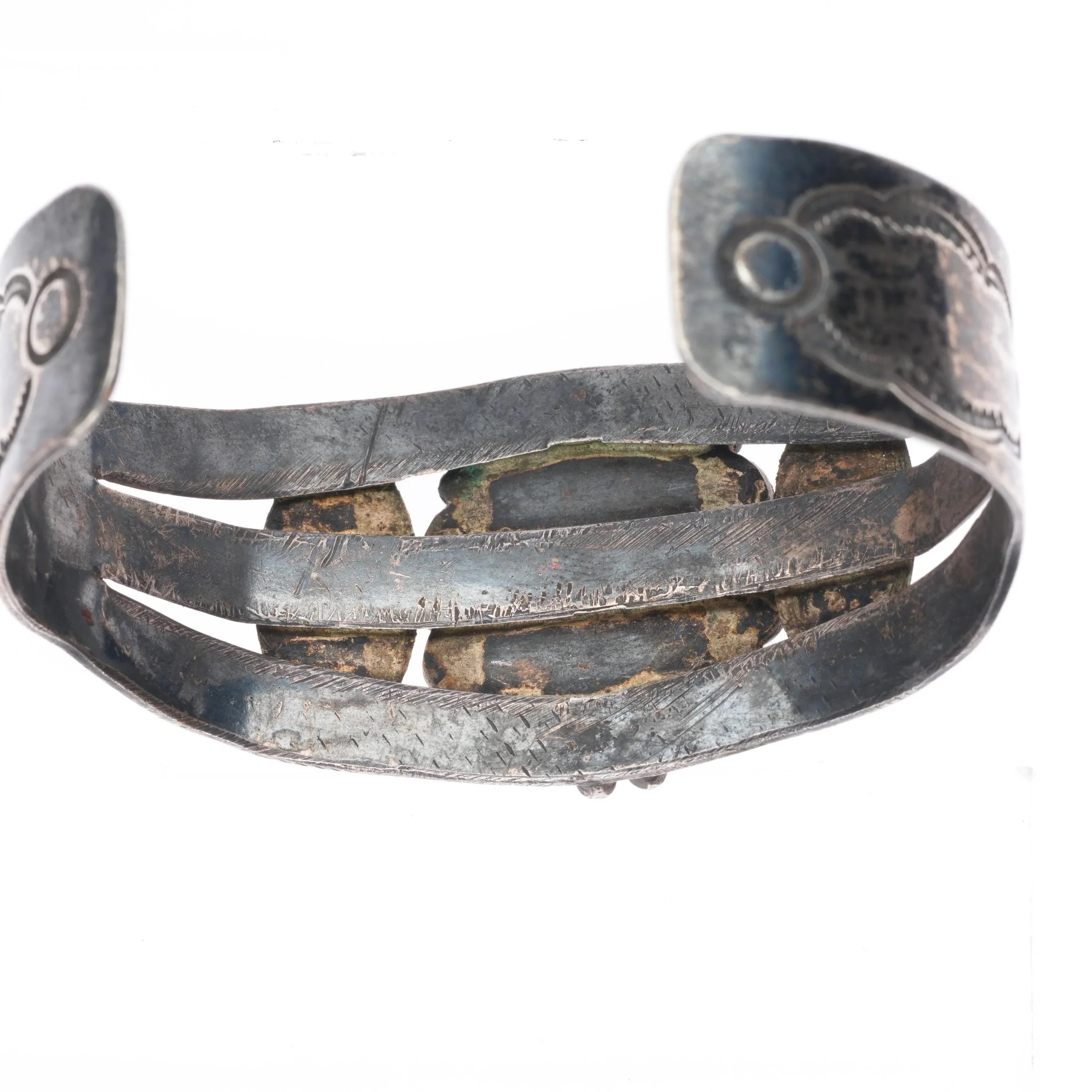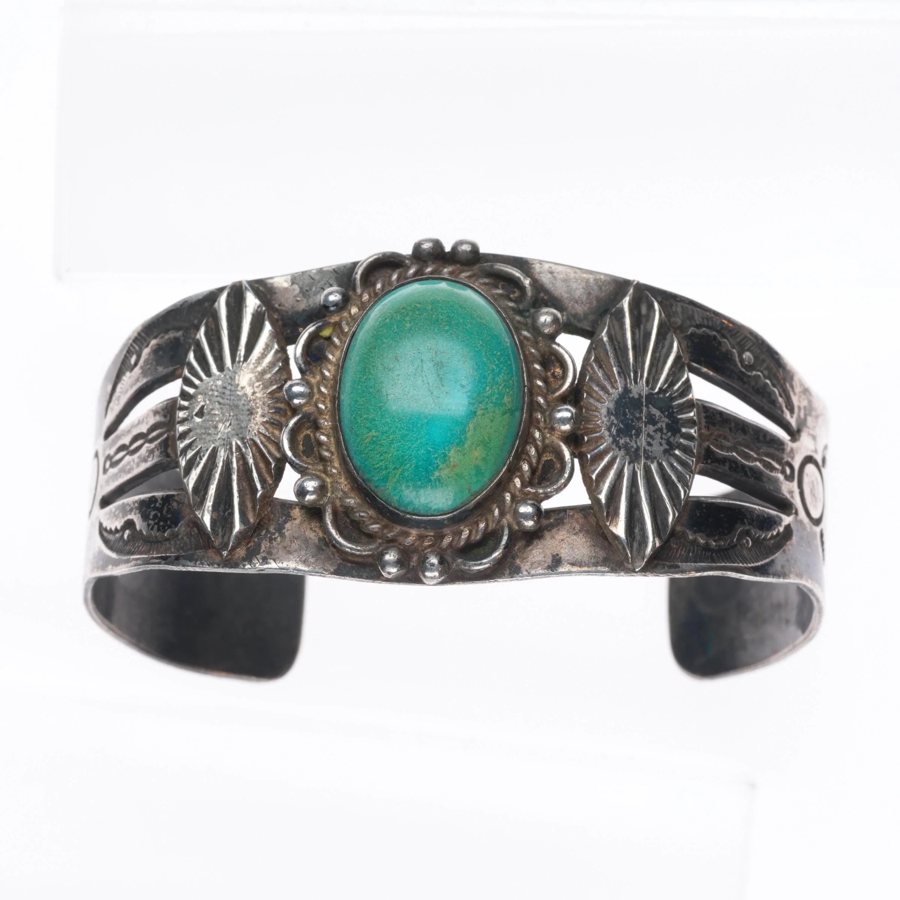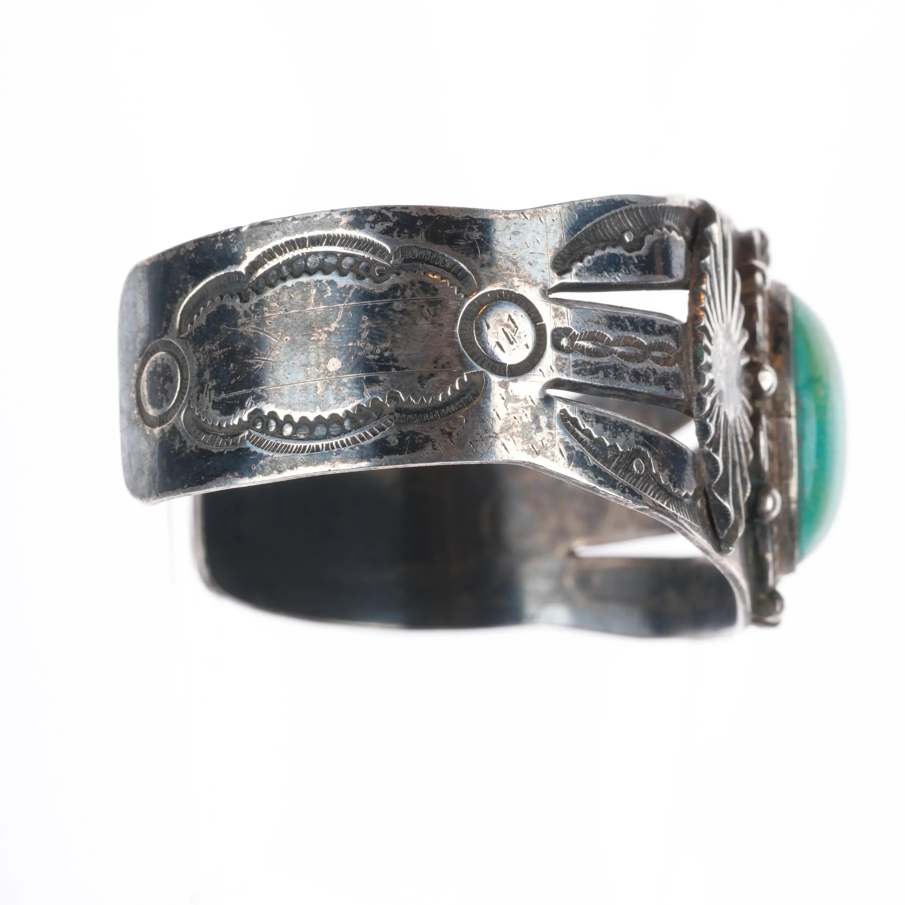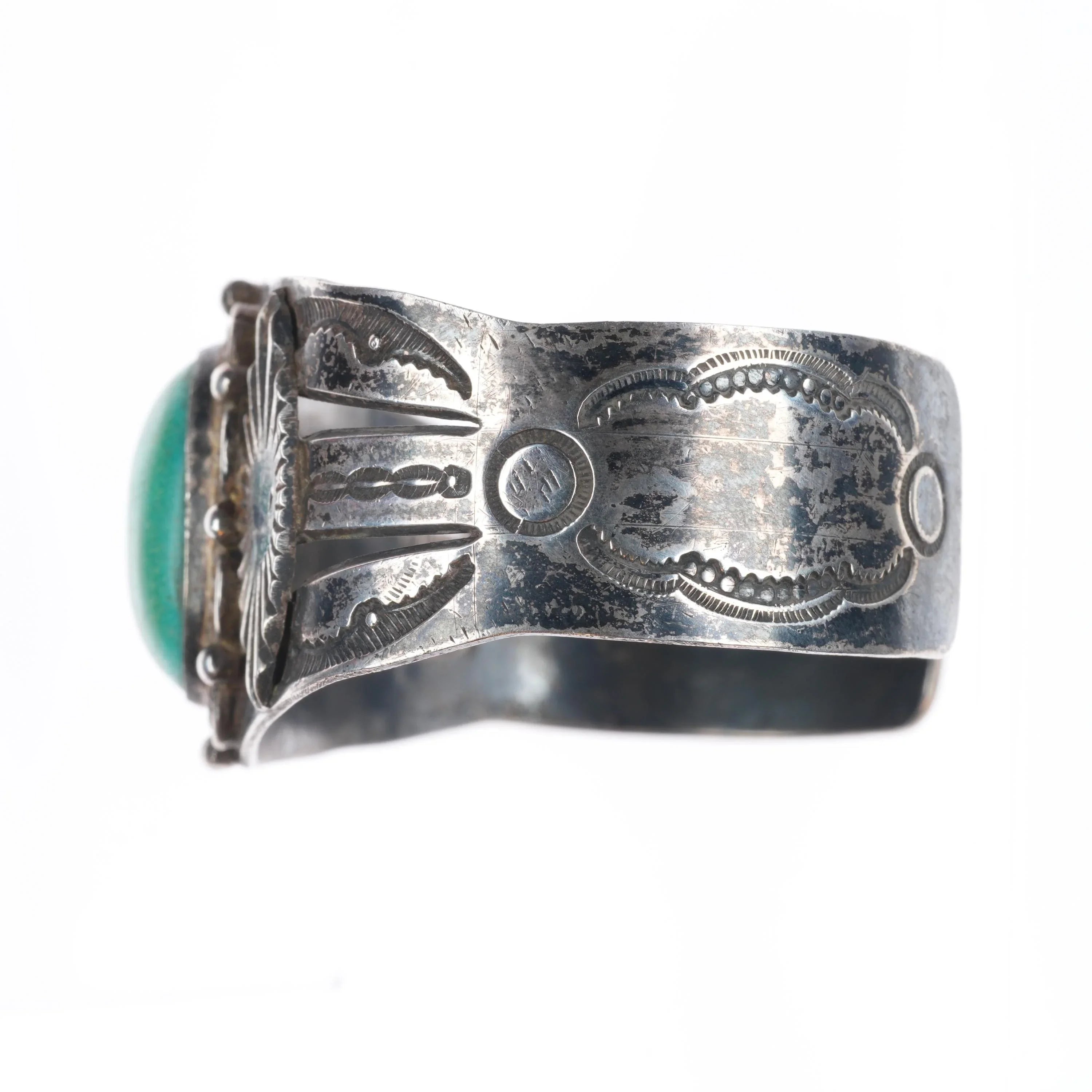 6.6" c1940‘s Navajo sterling silver turquoise wide hand stamped cuff bracelet. Tested and guaranteed solid sterling silver with weight and measurements in pictures. No damage or significant wear, circa second quarter of the 20th century, unmarked.