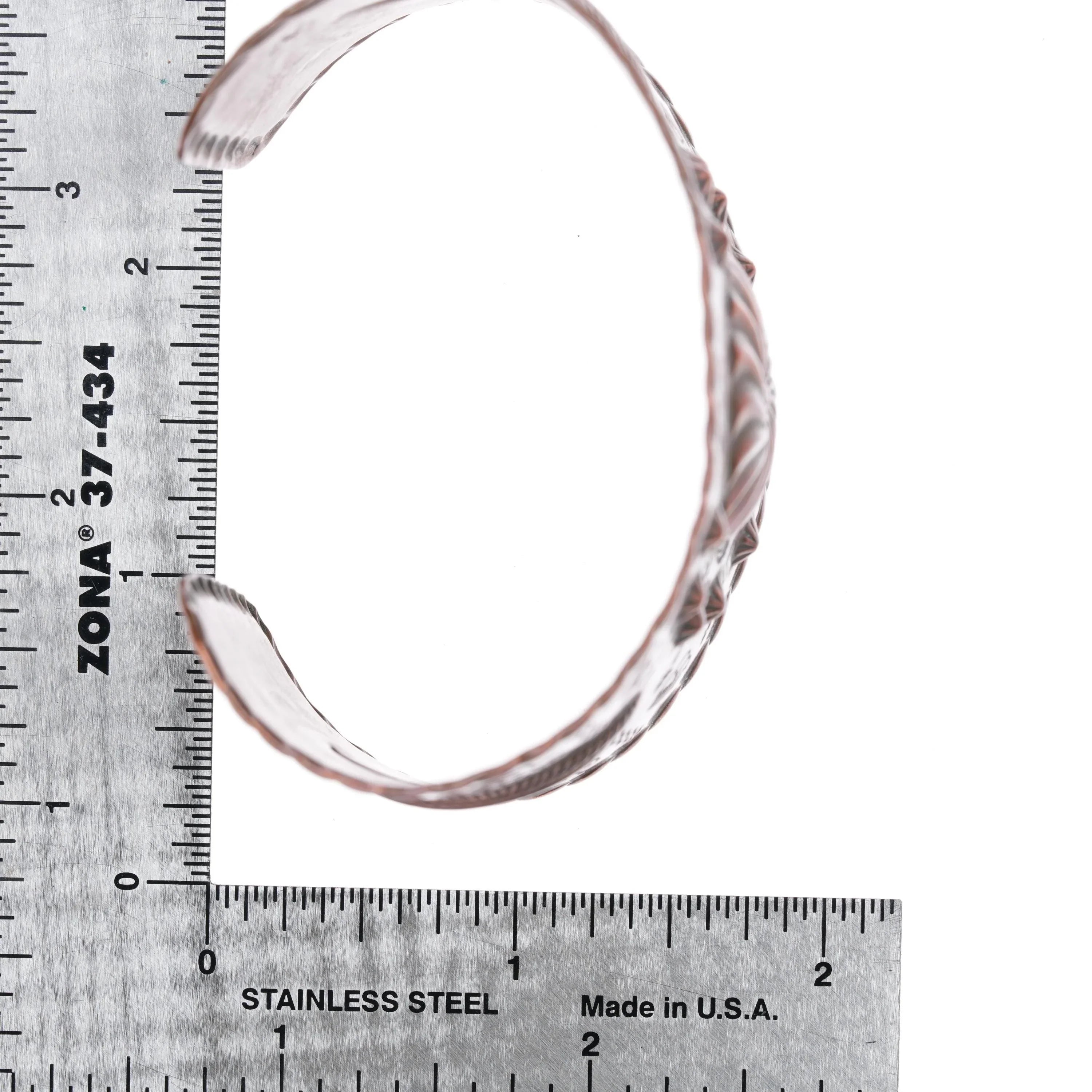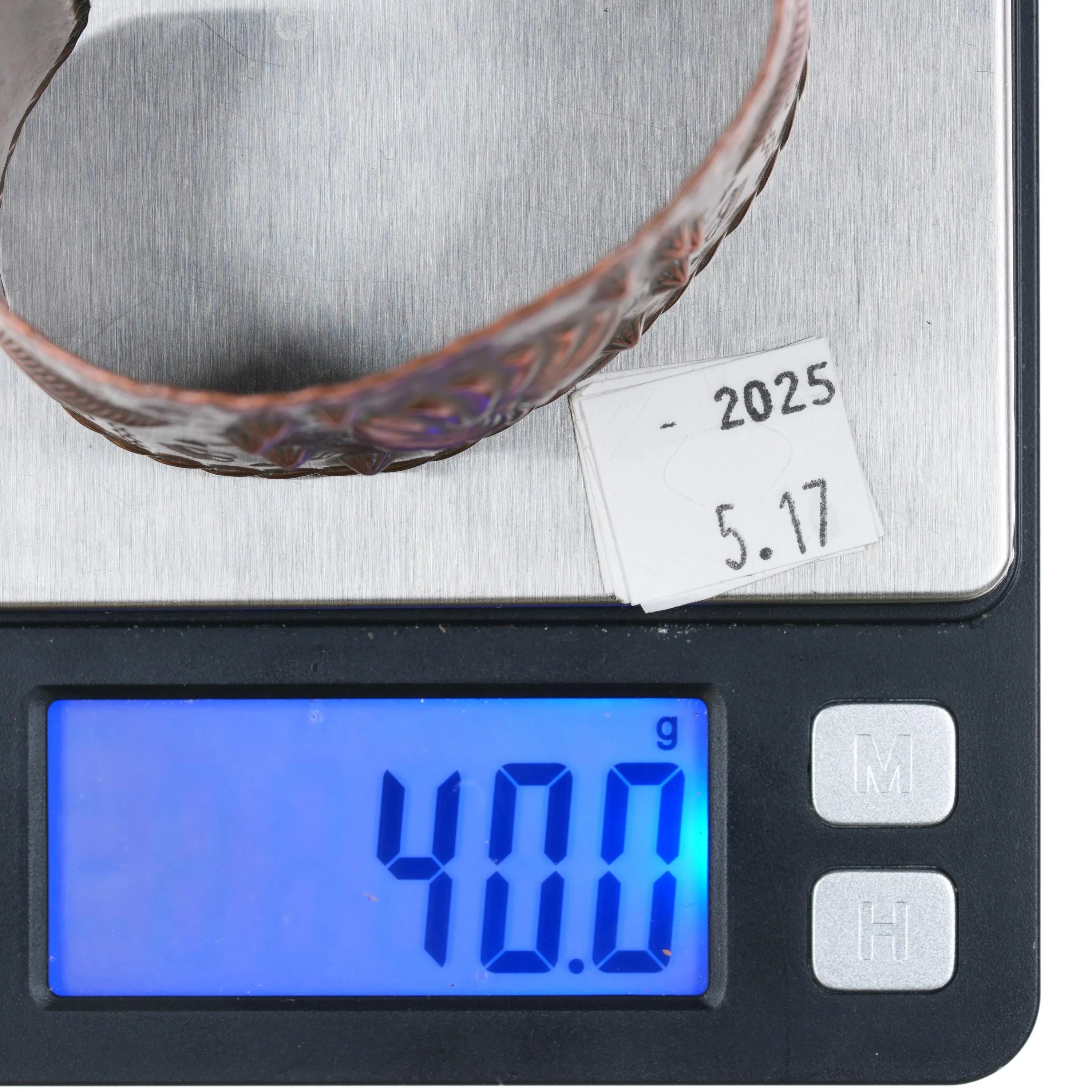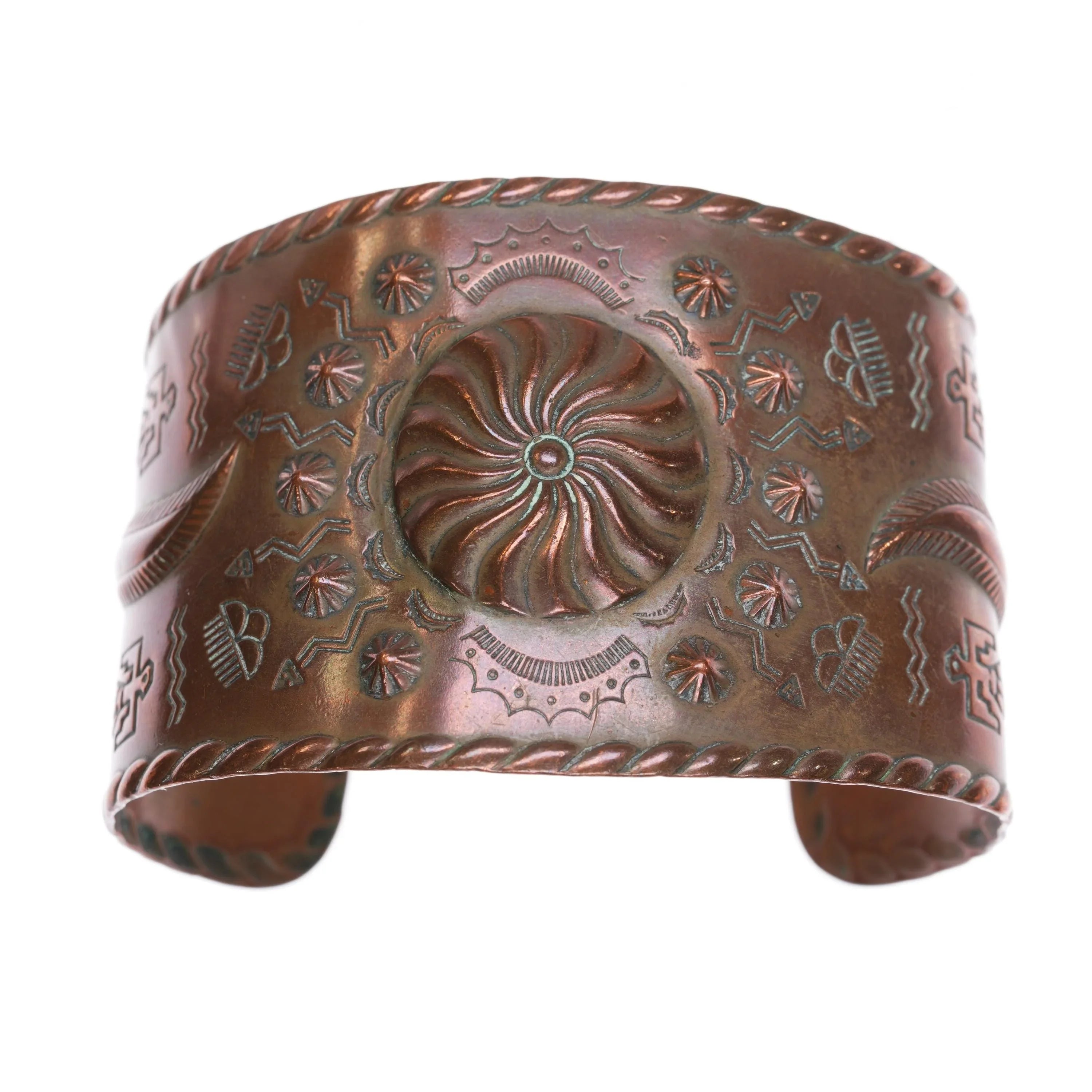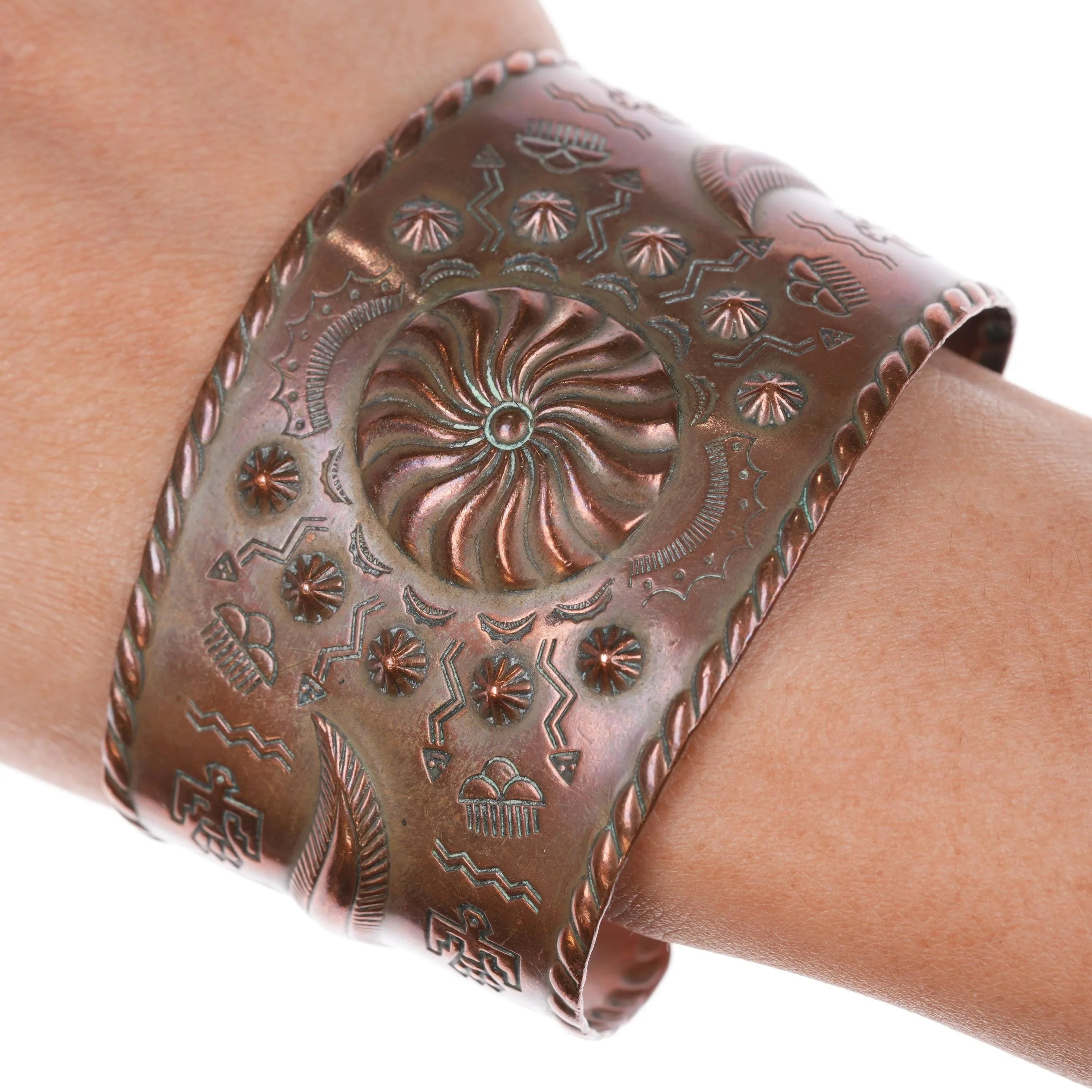 6.6" c1950‘s Large Bell Trading Post copper repousse Southwestern cuff bracelet. Weight and measurements in pictures, marked as shown. Mid 20th century with appropriate wear.