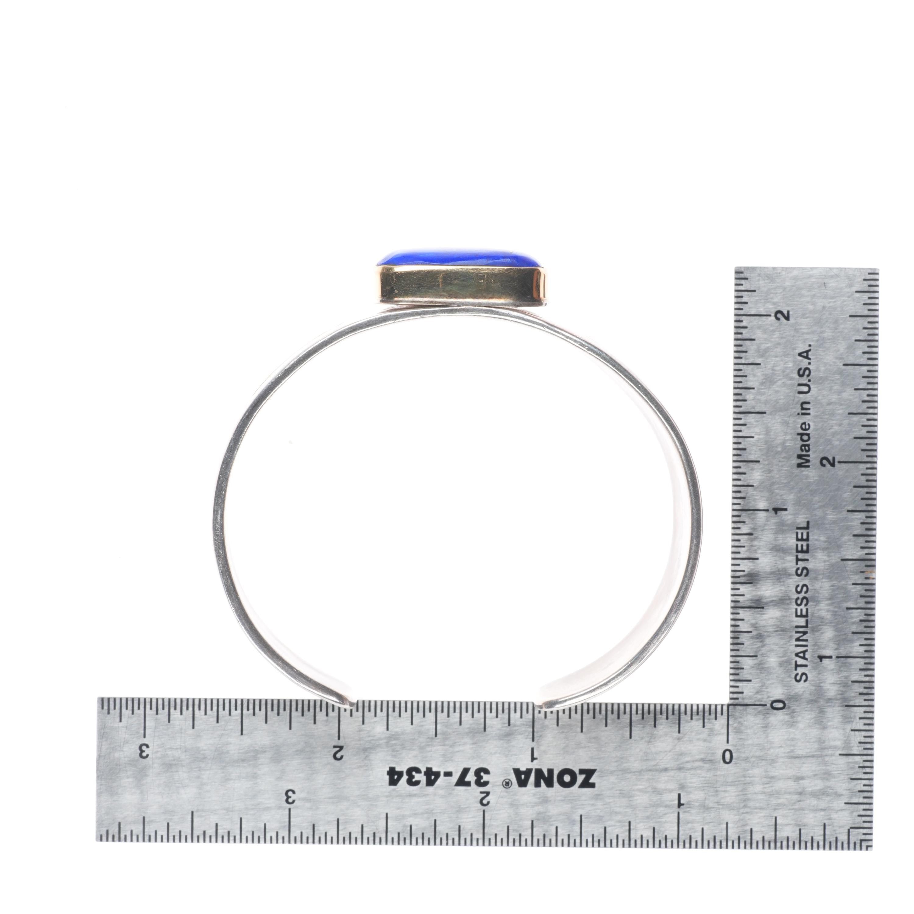 6.6" Dina Huntinghorse 14k gold/sterling silver Lapis cuff bracelet Kiowa. Tested and guaranteed solid sterling silver with weight and measurements in pictures. Circa last quarter of the 20th century to early 21st century with age appropriate wear.. Clean condition, pics don‘t do it justice.