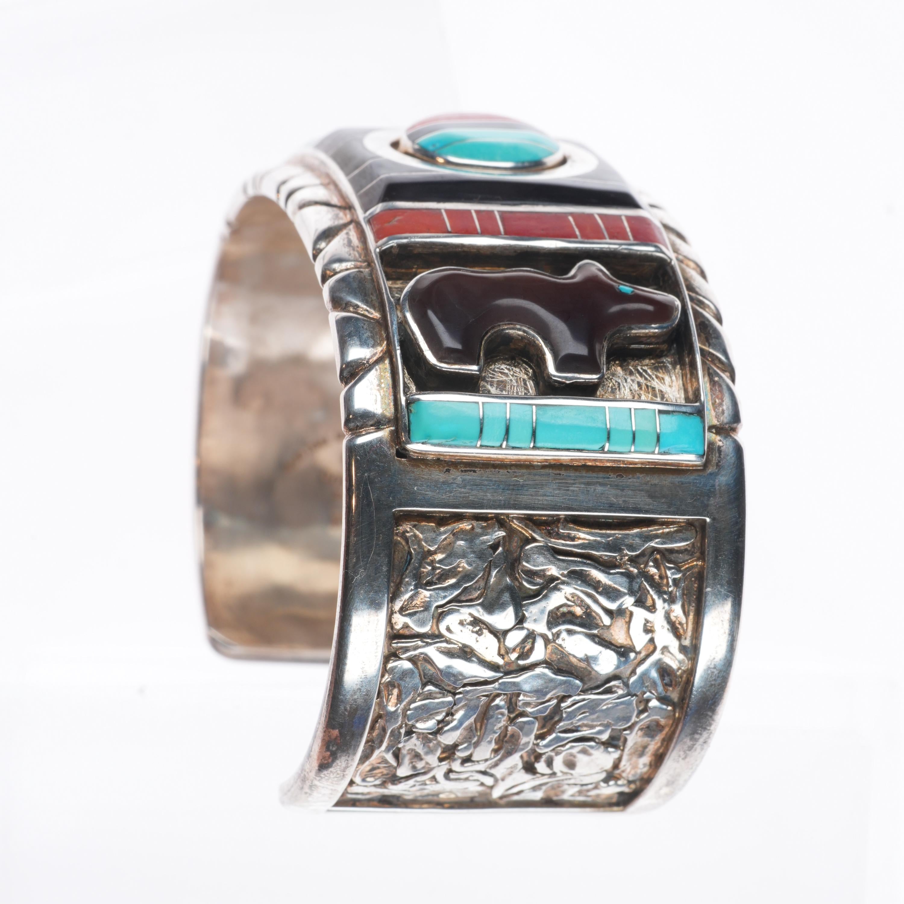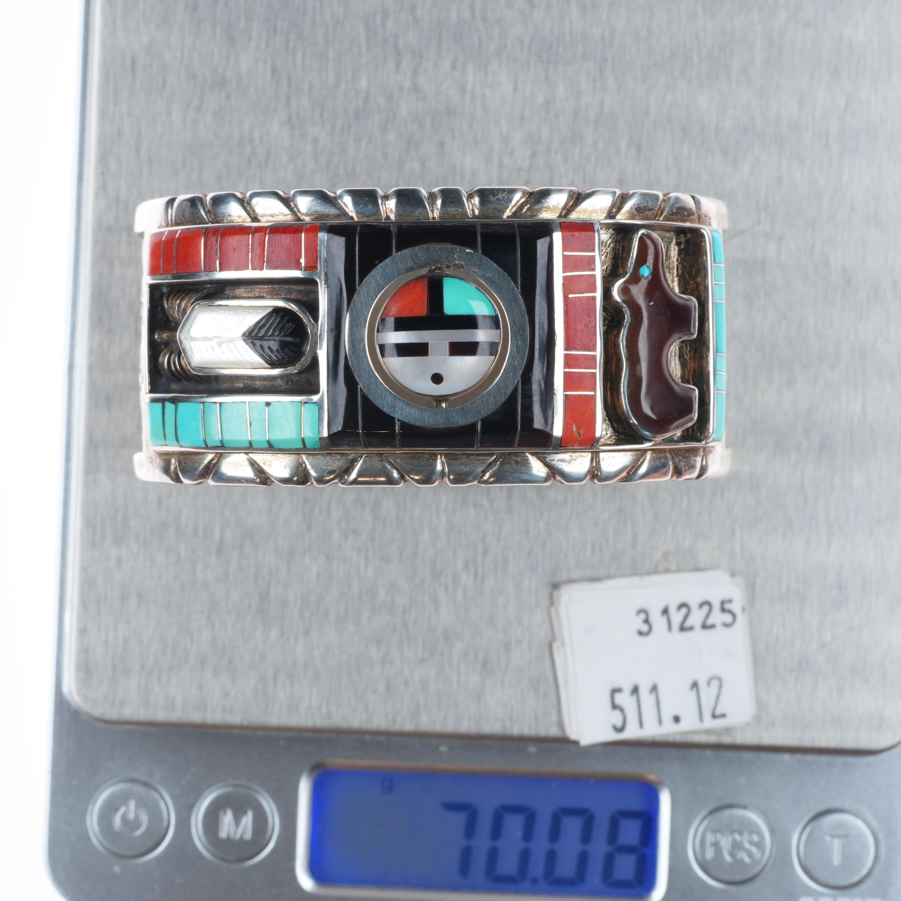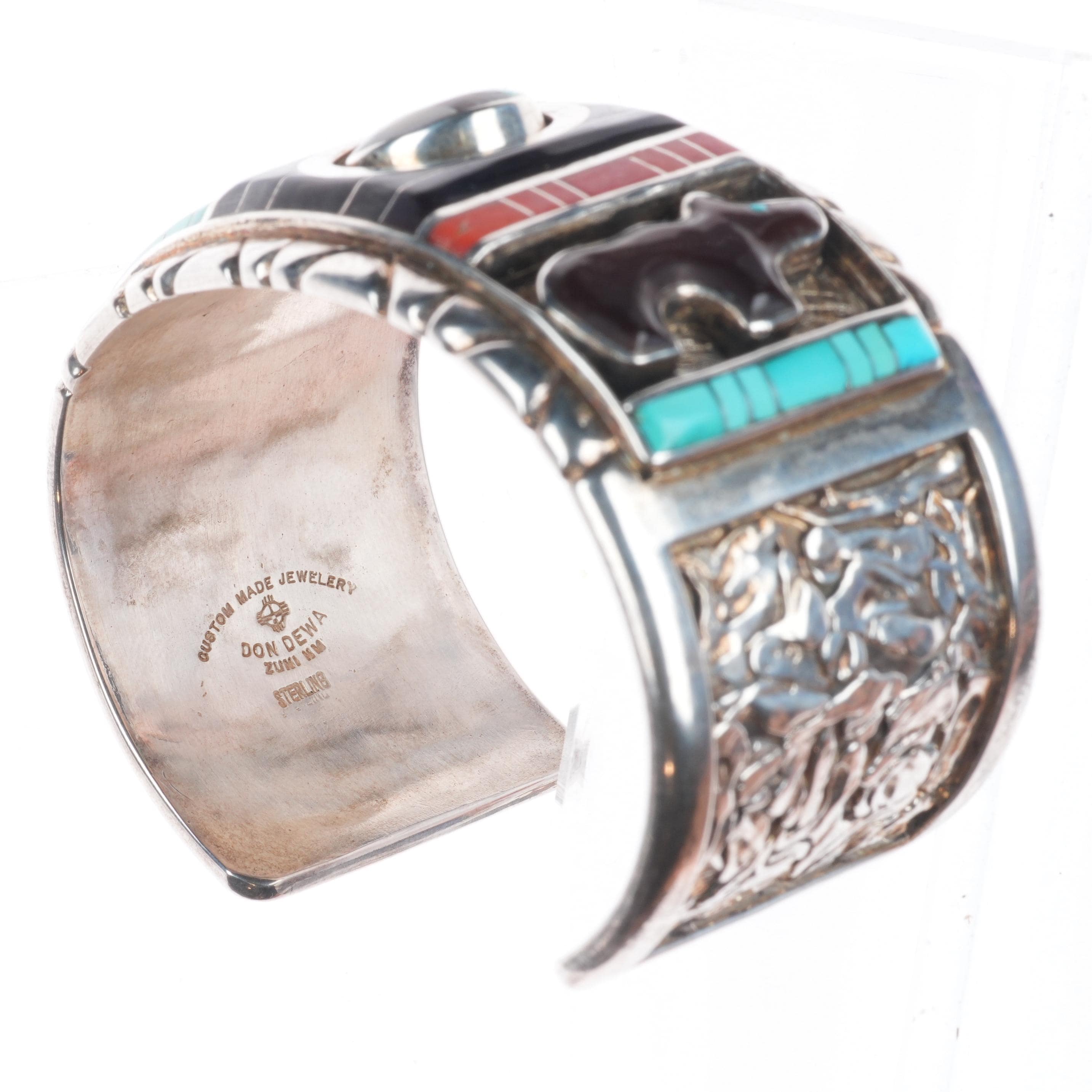 6.6" Don Dewa Zuni sunface spinner sterling silver coral/turquoise cuff bracelet. Tested and guaranteed solid sterling silver with weight and measurements in pictures. Circa last quarter of the 20th century with no apparent wear.