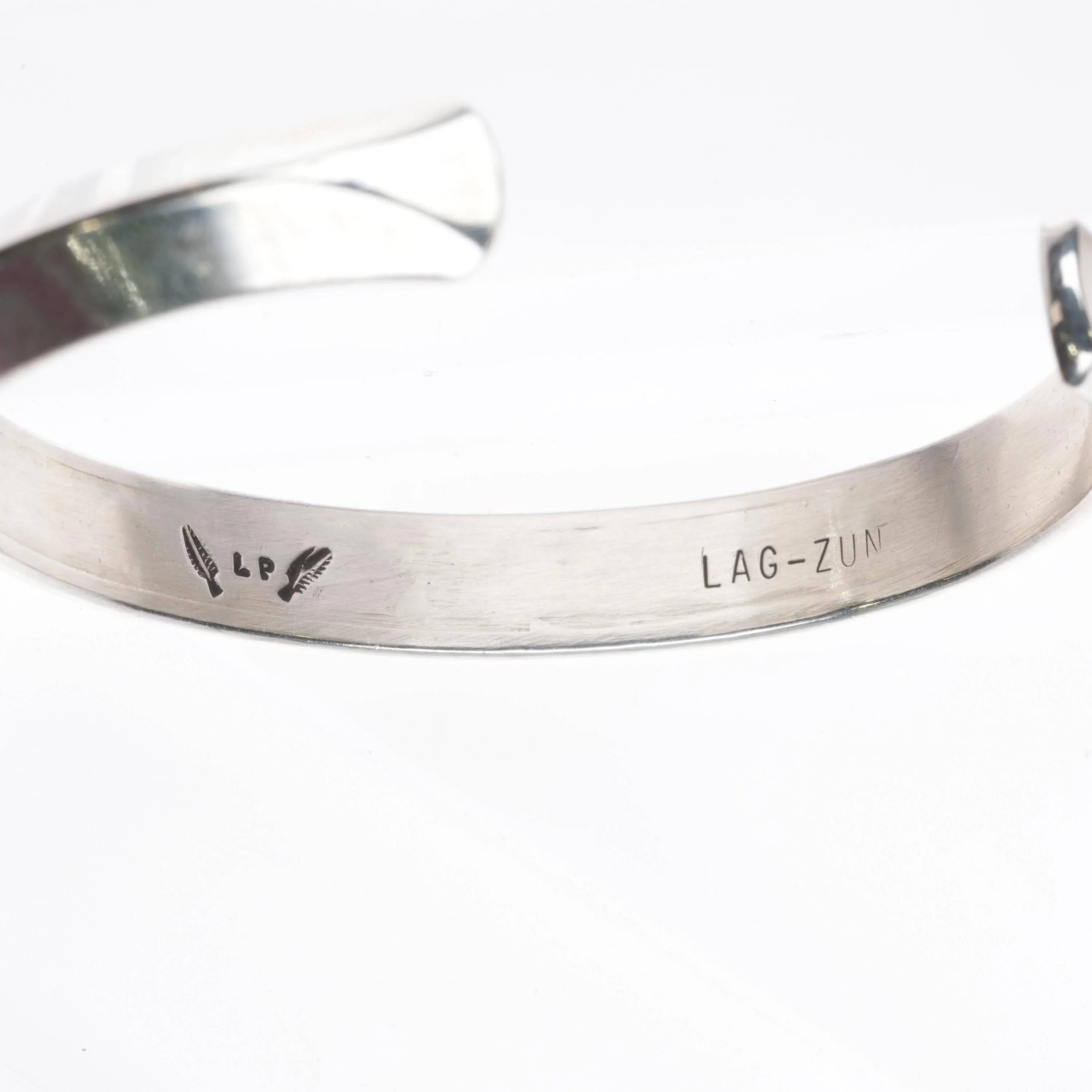 6.6" Leonard Paquin Laguna Zuni Carinated sterling silver stamped cuff bracelet. Tested and guaranteed solid sterling silver with the markings shown.. Weight and measurements in pictures. Some expected wear, no cracks or breaks. Circa last quarter of the 20th century.