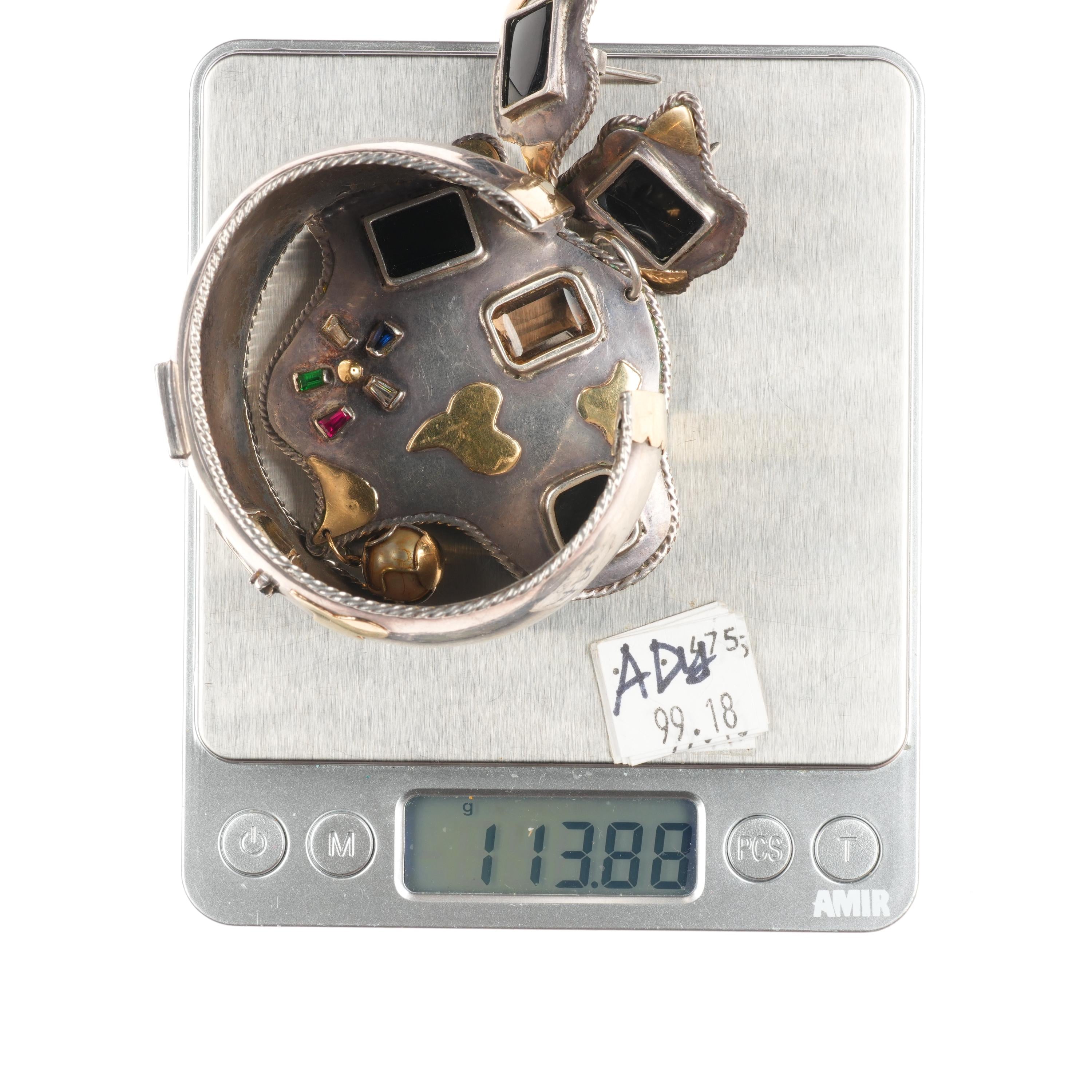 6.75" 14k gold/Sterling silver Gemset cuff bracelet, earrings, pendant set. Bracelet fits up to a 6.75" wrist. Weight and measurements in pictures, solid 14k gold accents on sterling silver no issues.. No apparent markings, gemstones untested but I believe they are all natural as it‘s a quality set.
