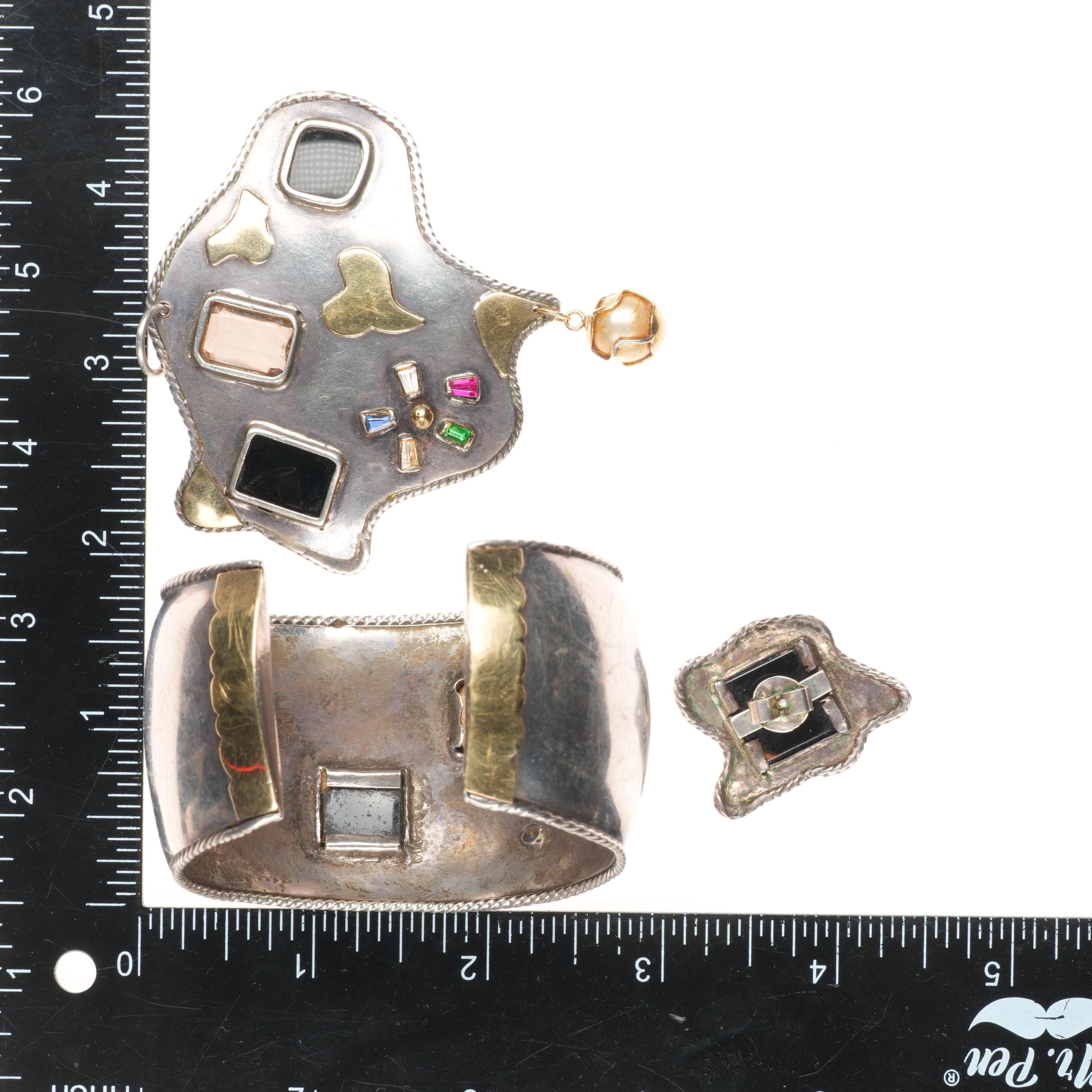 6.75" 14k gold/Sterling silver Gemset cuff bracelet, earrings, pendant set