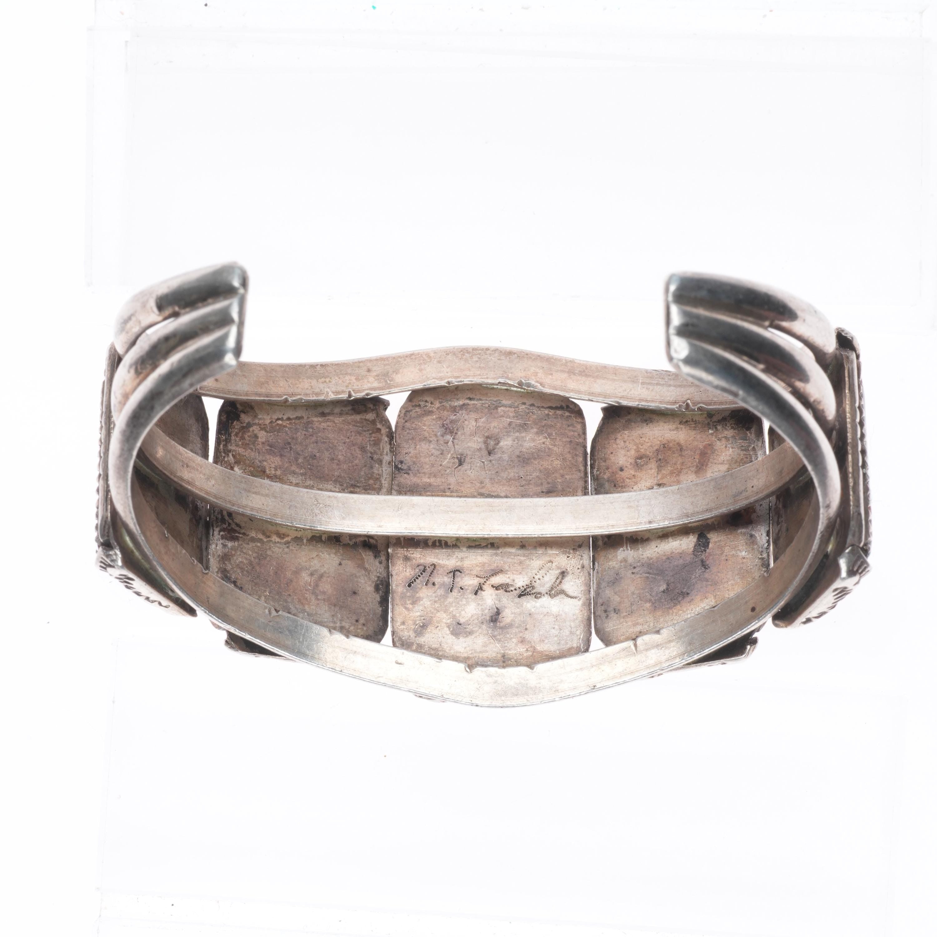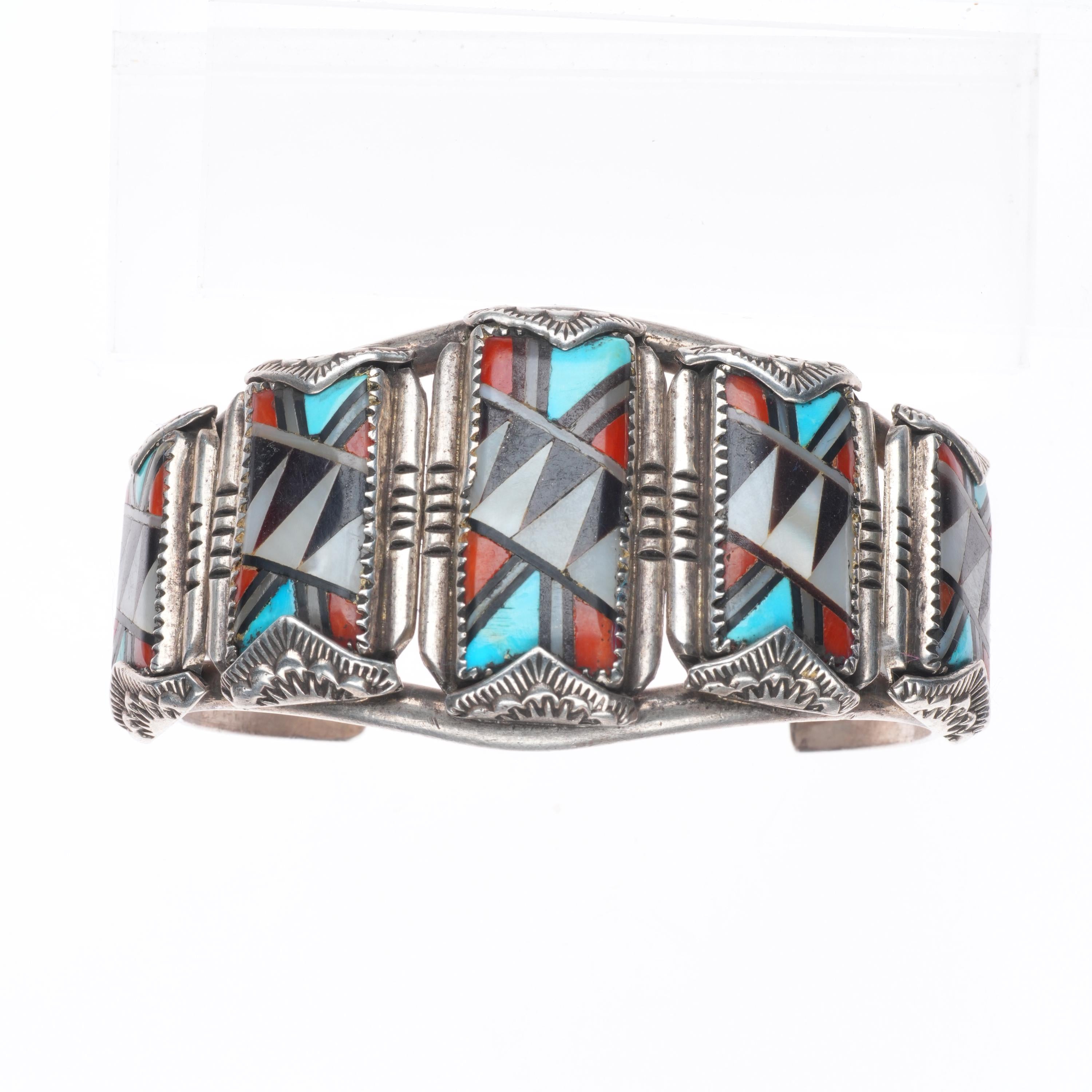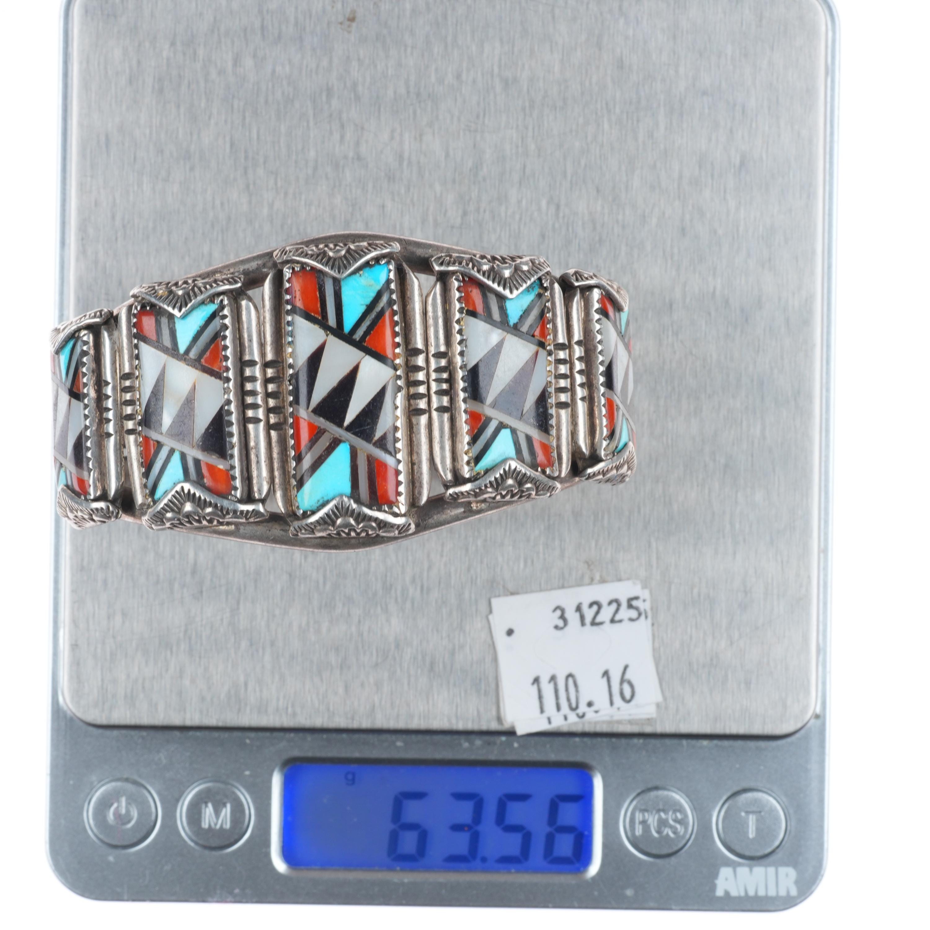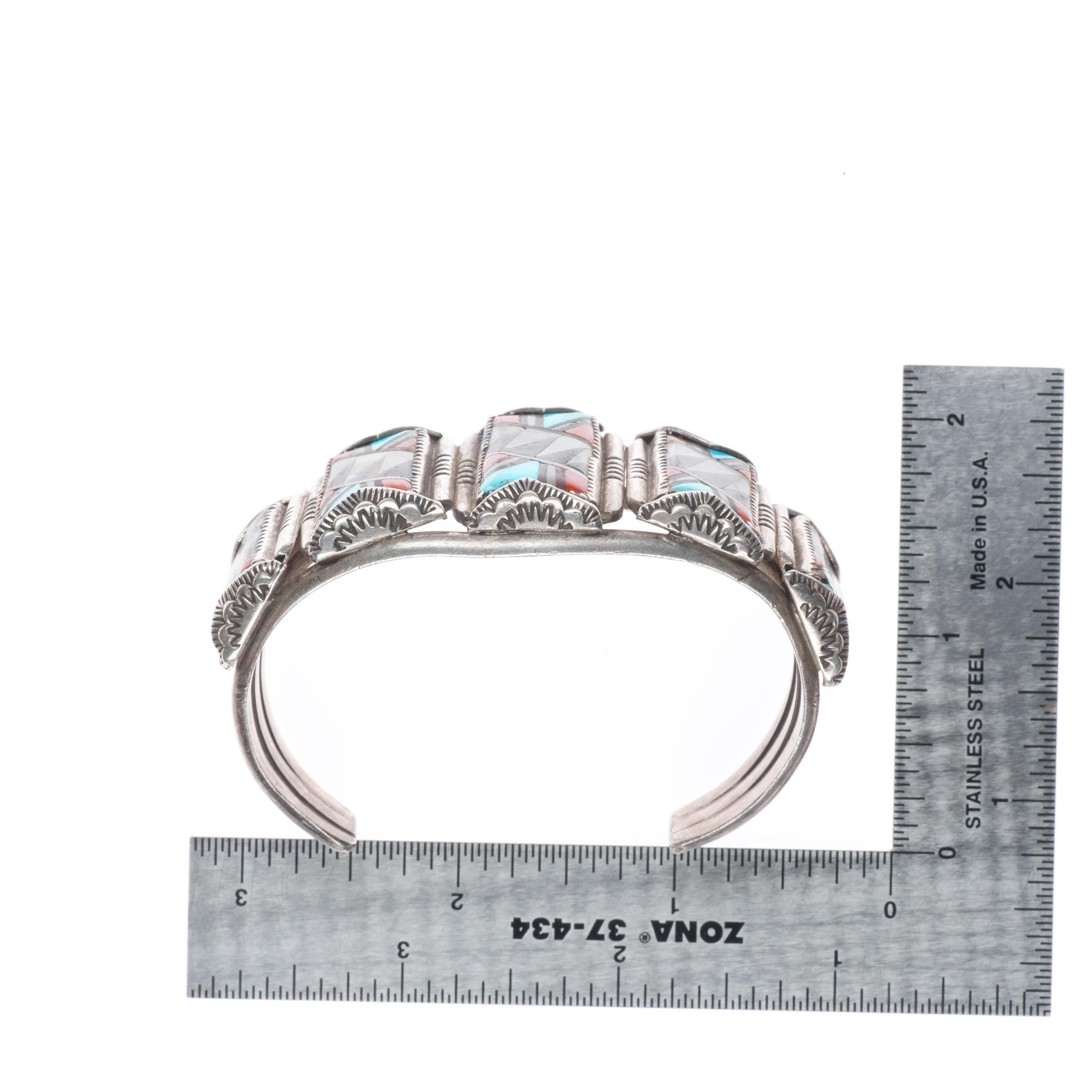 6.75" Nicholas-Theresa Leekela Zuni intarsia inlay sterling silver cuff bracelet. Tested and guaranteed solid sterling silver with weight and measurements in pictures. Circa fourth quarter of the 20th century with age appropriate wear..