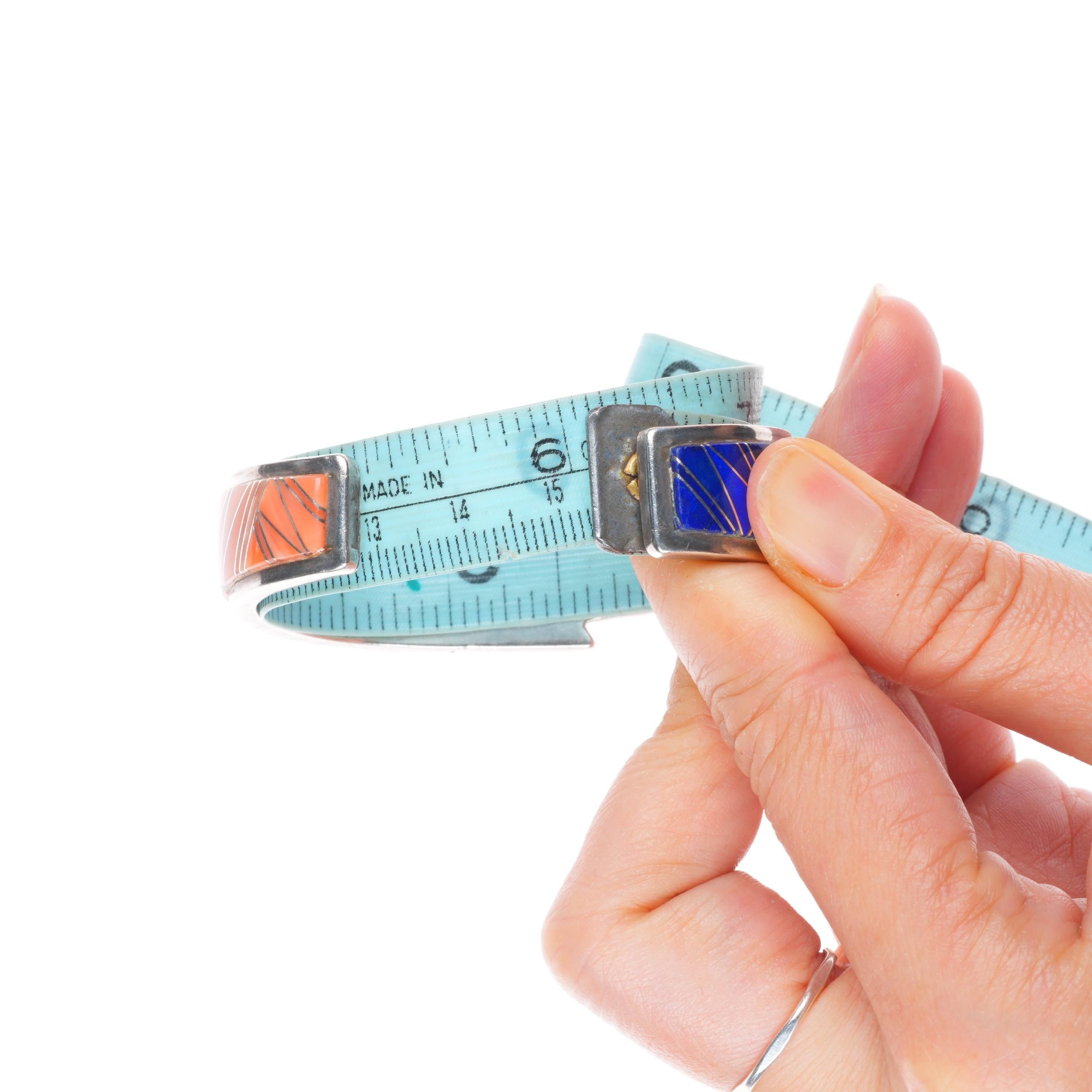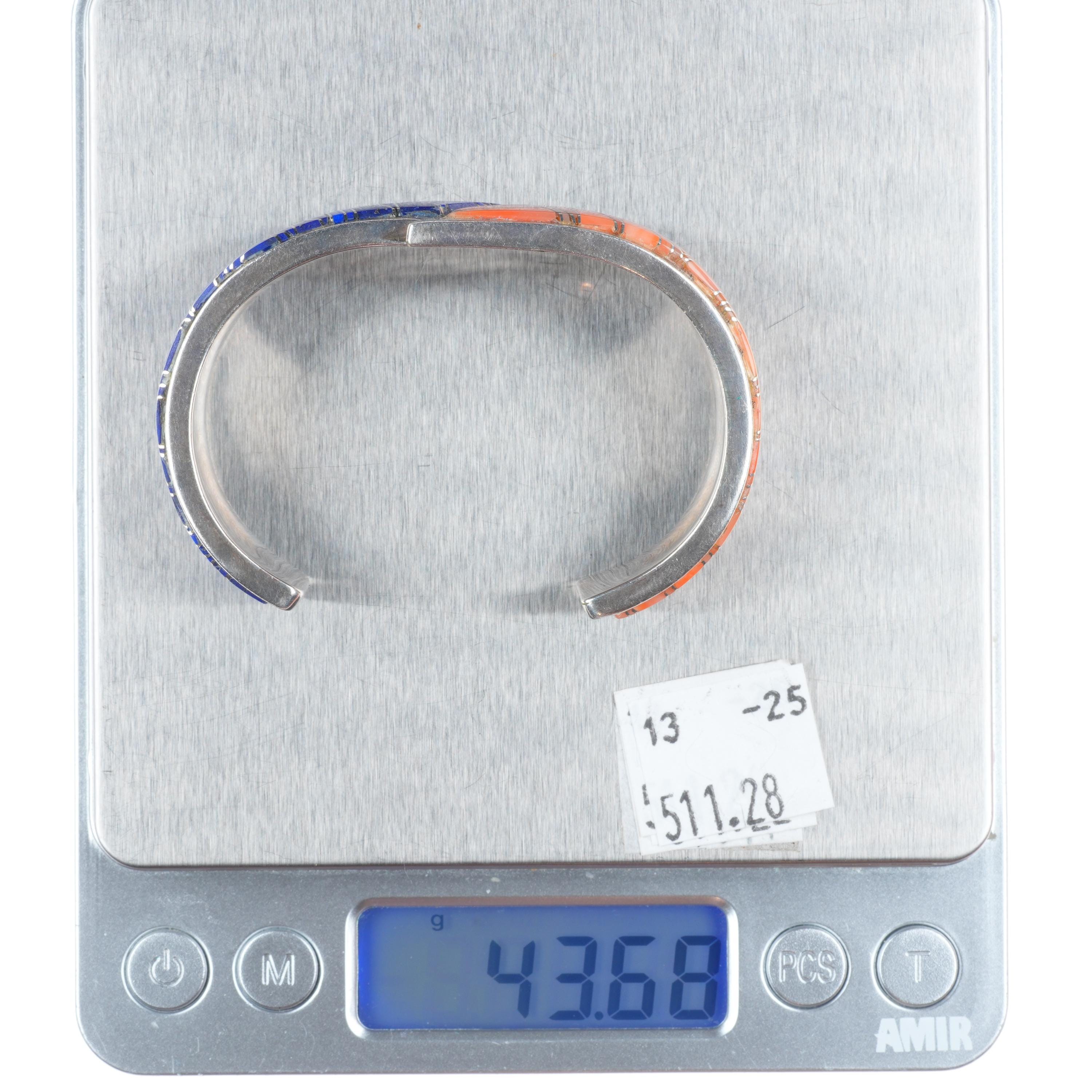 6" Bennie Bowekaty Zuni sterling silver coral/lapis channel inlay cuff bracelet. Tested and guaranteed solid sterling silver with weight and measurements in pictures. Circa last quarter of the 20th century with some expected age appropriate wear.