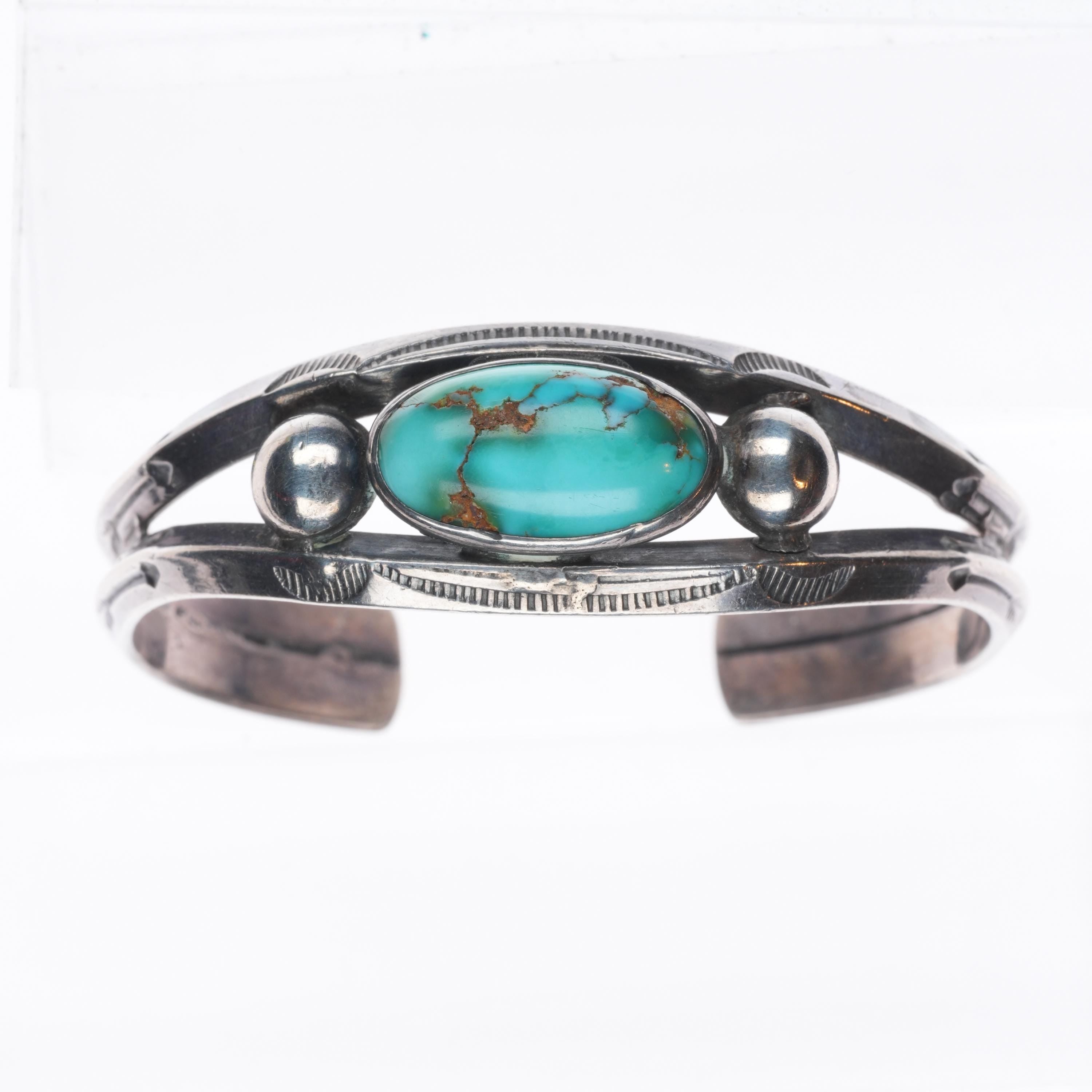 6" c1940‘s Navajo Royston turquoise carinated sterling silver cuff bracelet. Tested and guaranteed solid sterling silver with weight and measurements in pictures. Circa second quarter of the 20th century.