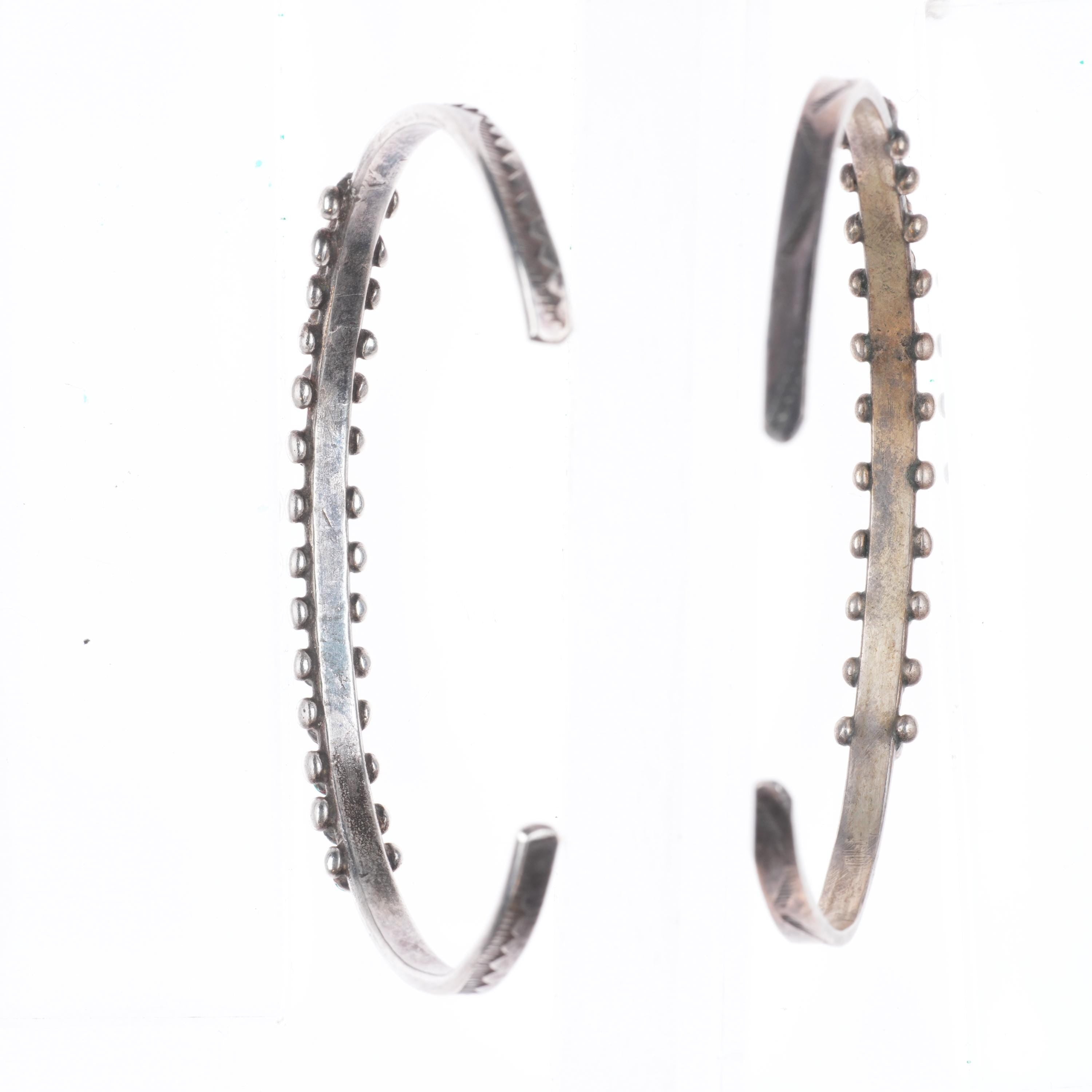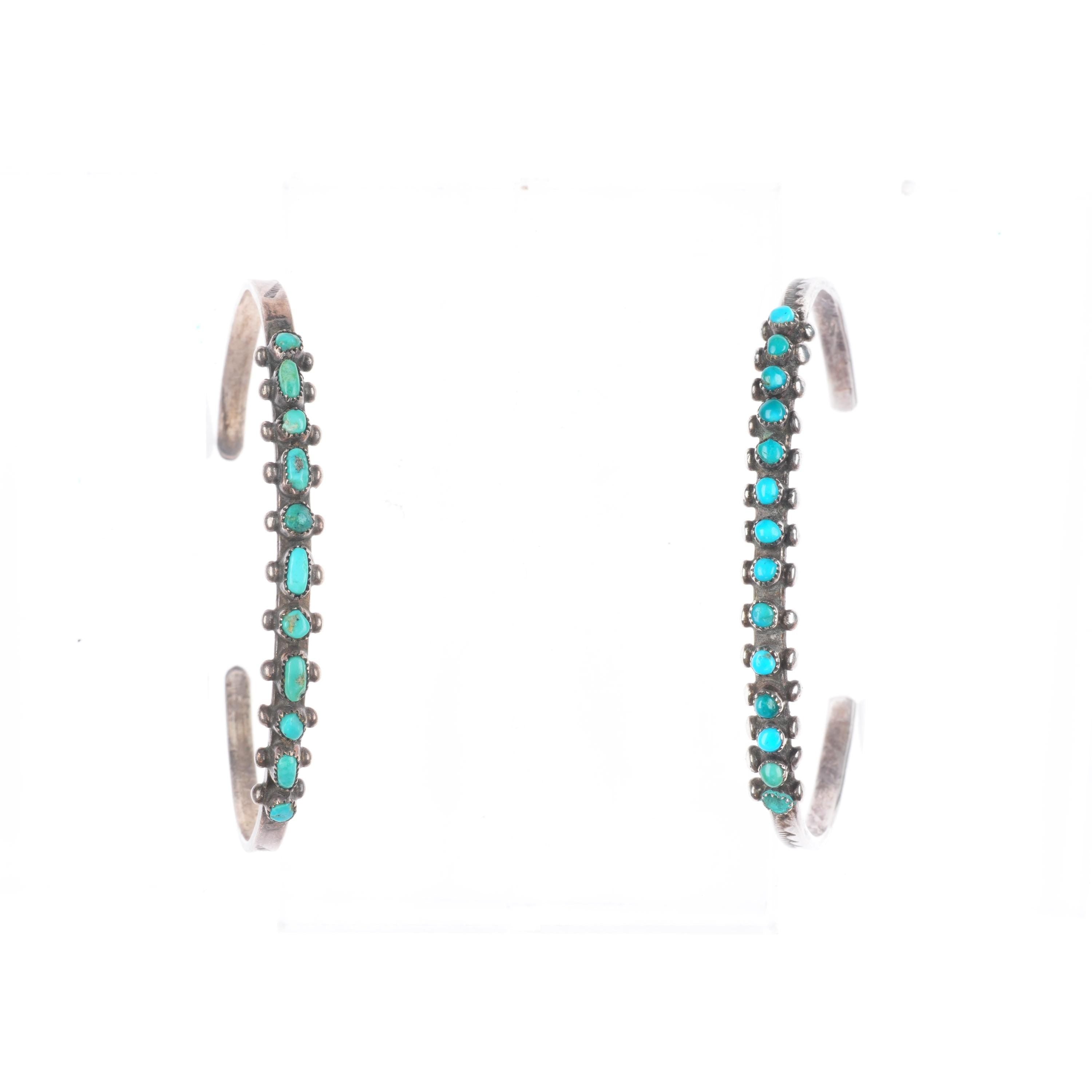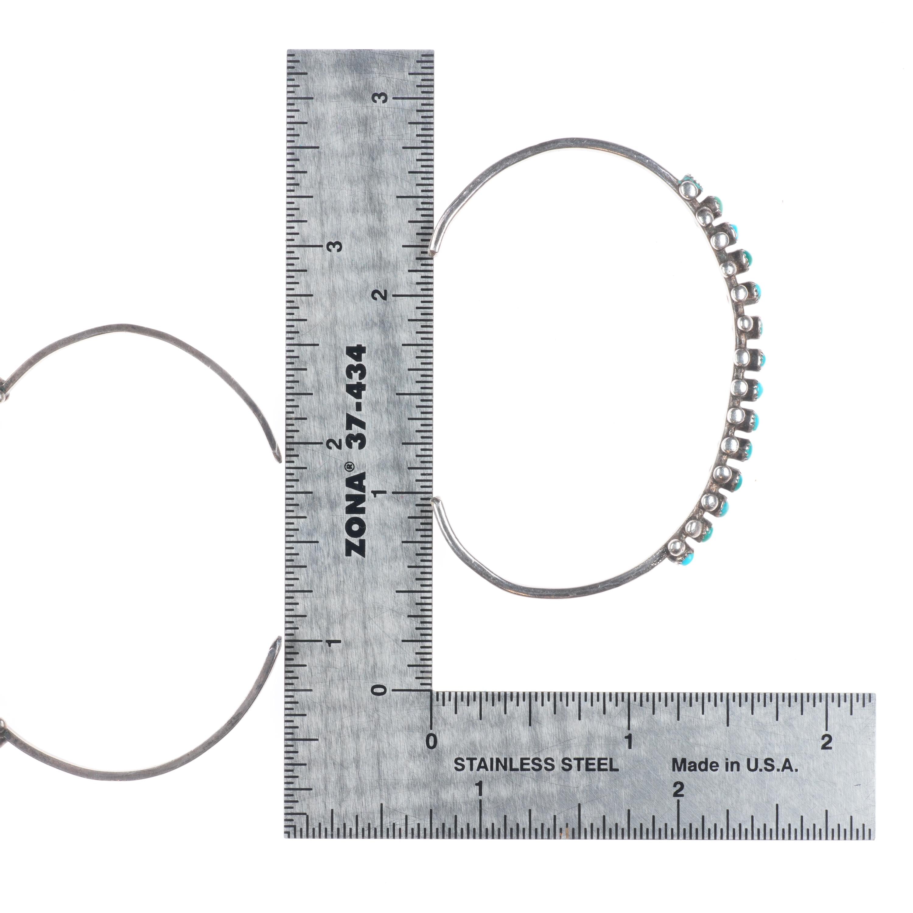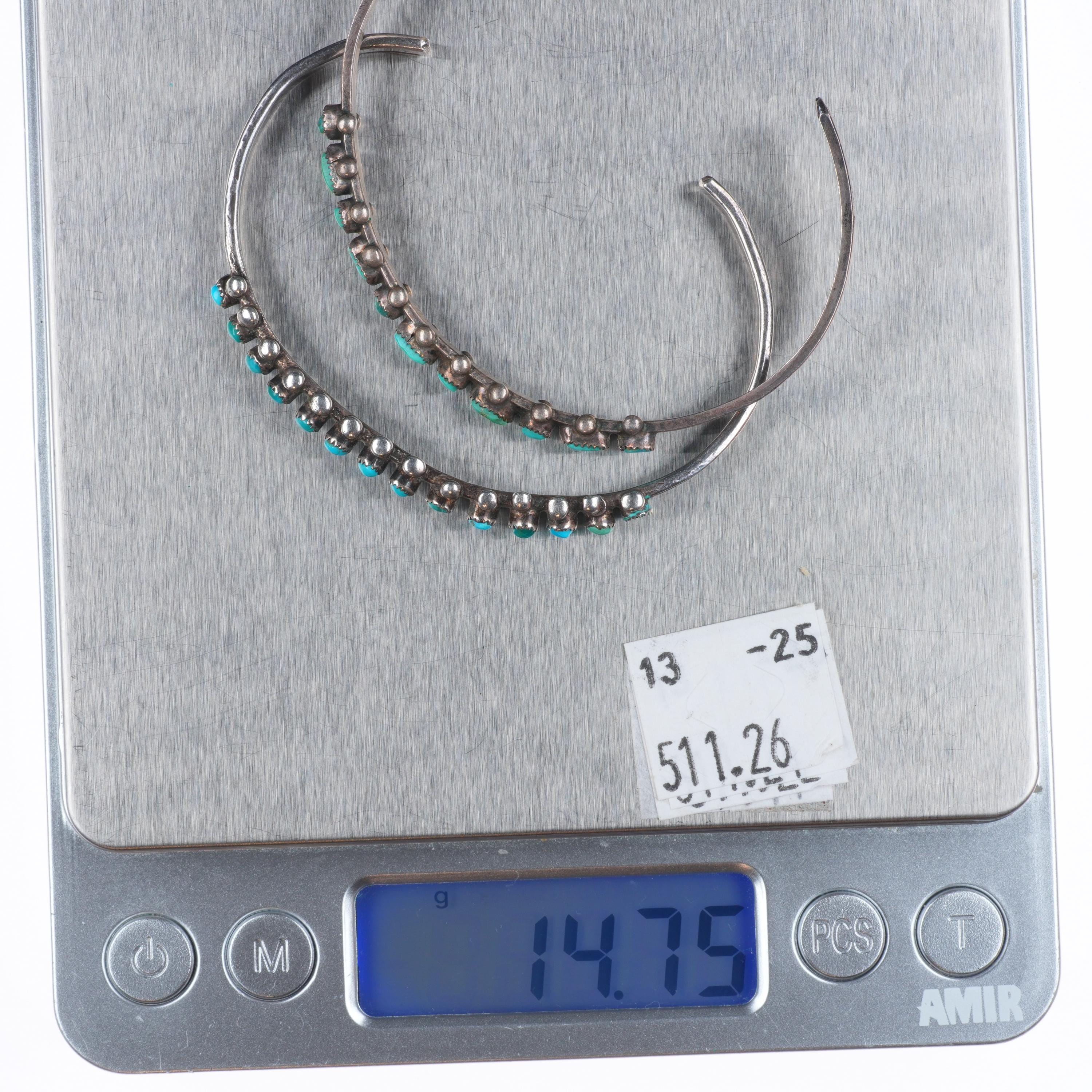 6" c1940‘s Zuni dot-dot-dash/Snake eye turquoise sterling silver cuff bracelets. Tested and guaranteed solid sterling silver with weight and measurements in pictures. Circa second quarter of the 20th century with some expected age appropriate wear. Selling both bracelets shown.