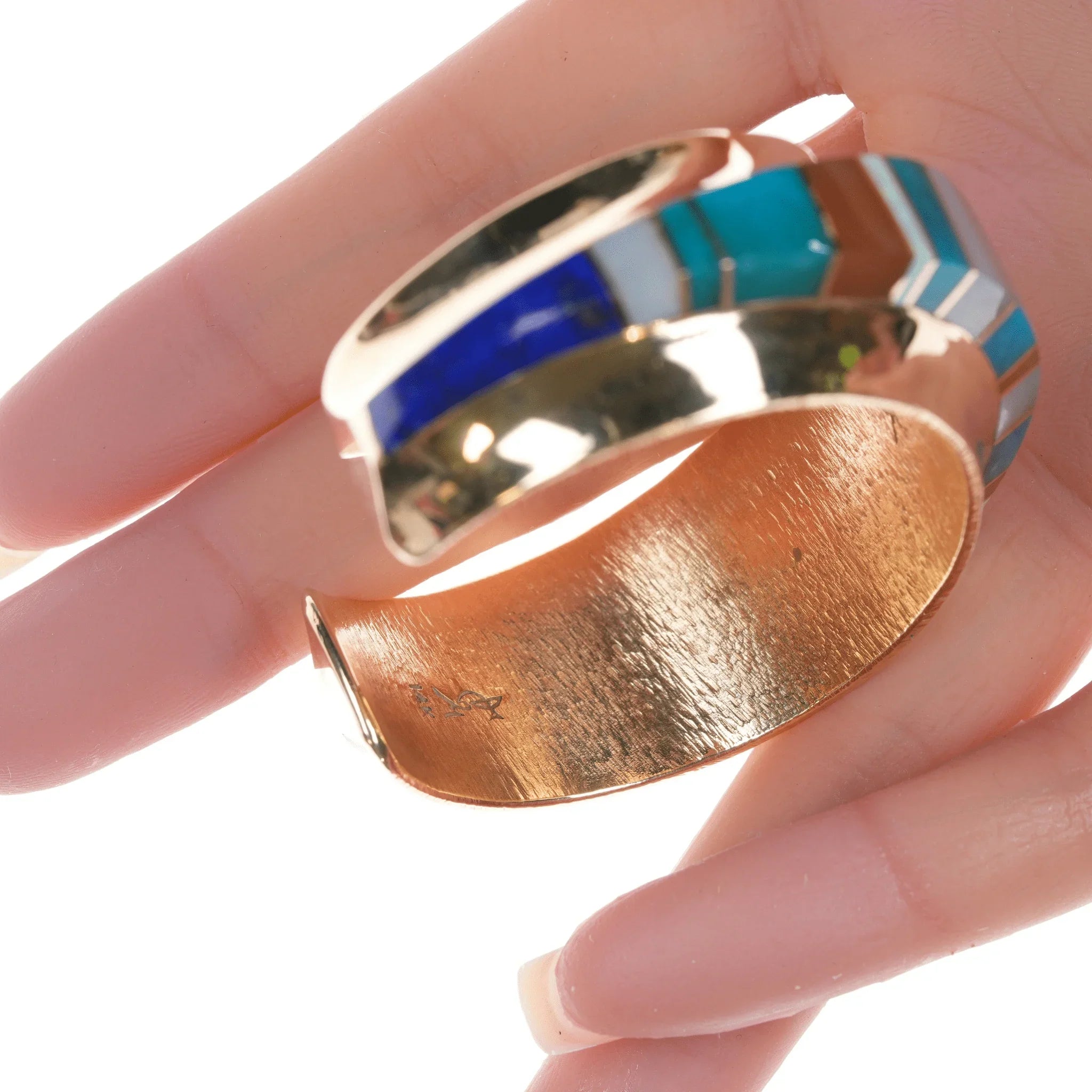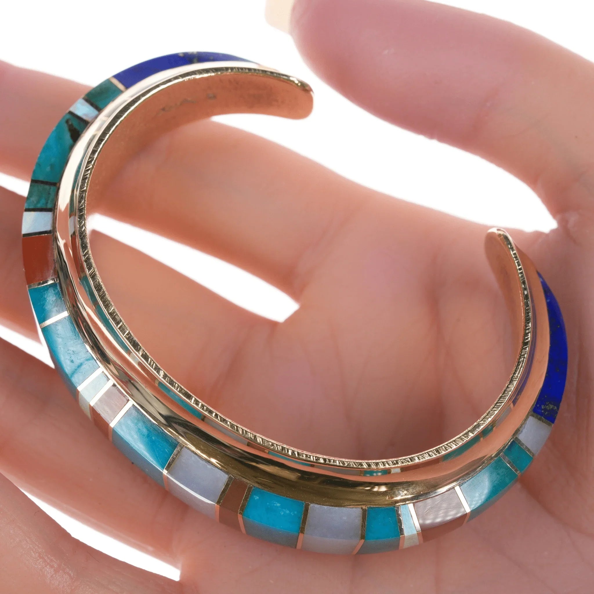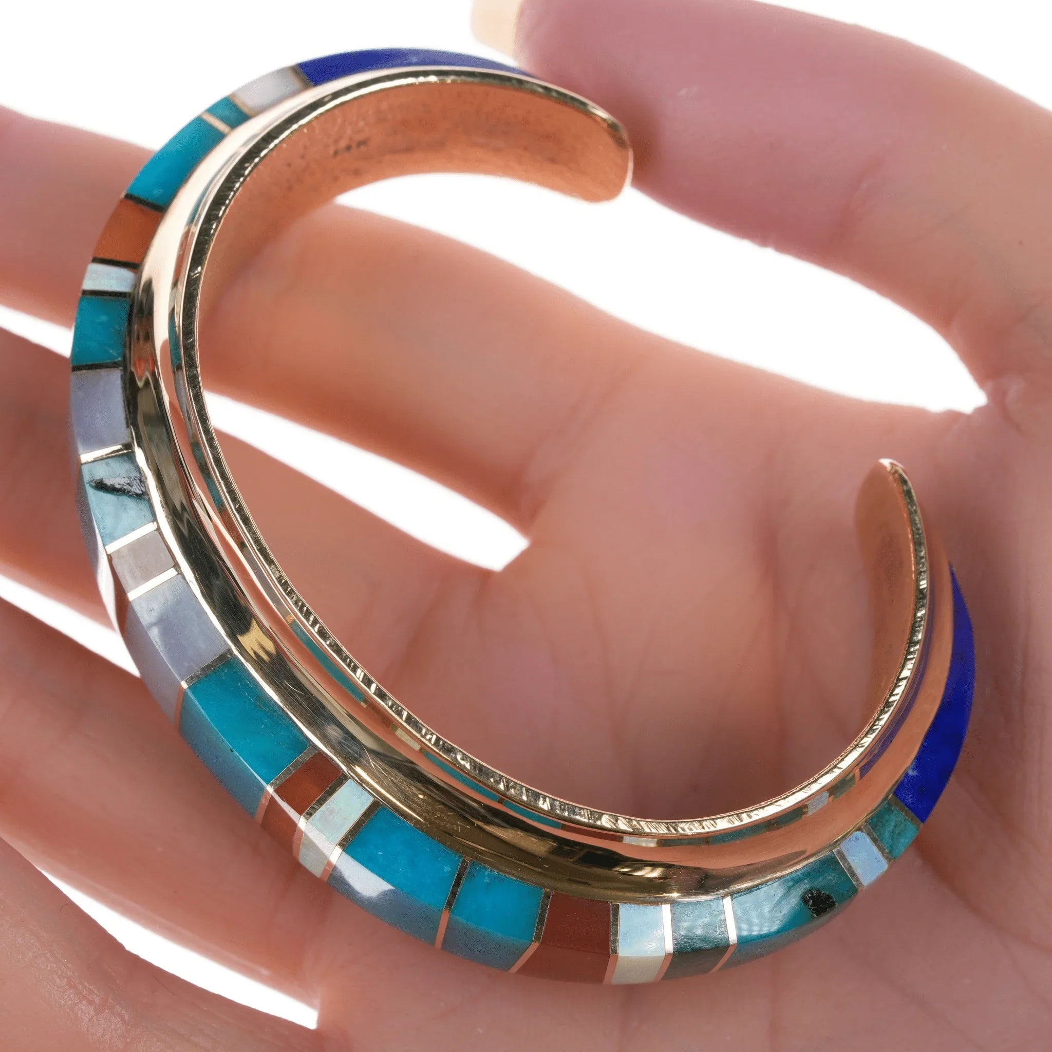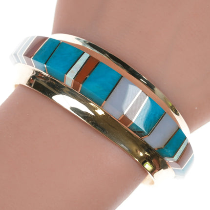 6" Duane Makitma Hopi 14k gold Multi-stone channel inlay cuff bracelet. 5" plus 1" gap, 6" total inside including gap. 25mm wide in center tapering down to 15mm on the tips, 10mm tall, 64.2 grams. Super clean with no detectable damage or wear inside or out. I don't believe it has ever been worn. Hallmarked by artist twice in interior, hallmarked 14k 3 times in interior. A very well respected artisan, at the time of listing this is arguably the best piece of his being offered for sale online. Comparable silver bracelets by this artisan retail for around 3-4k. This would probably retail for 25k+ with current gold and material prices directly from the Artisan or at a gallery.