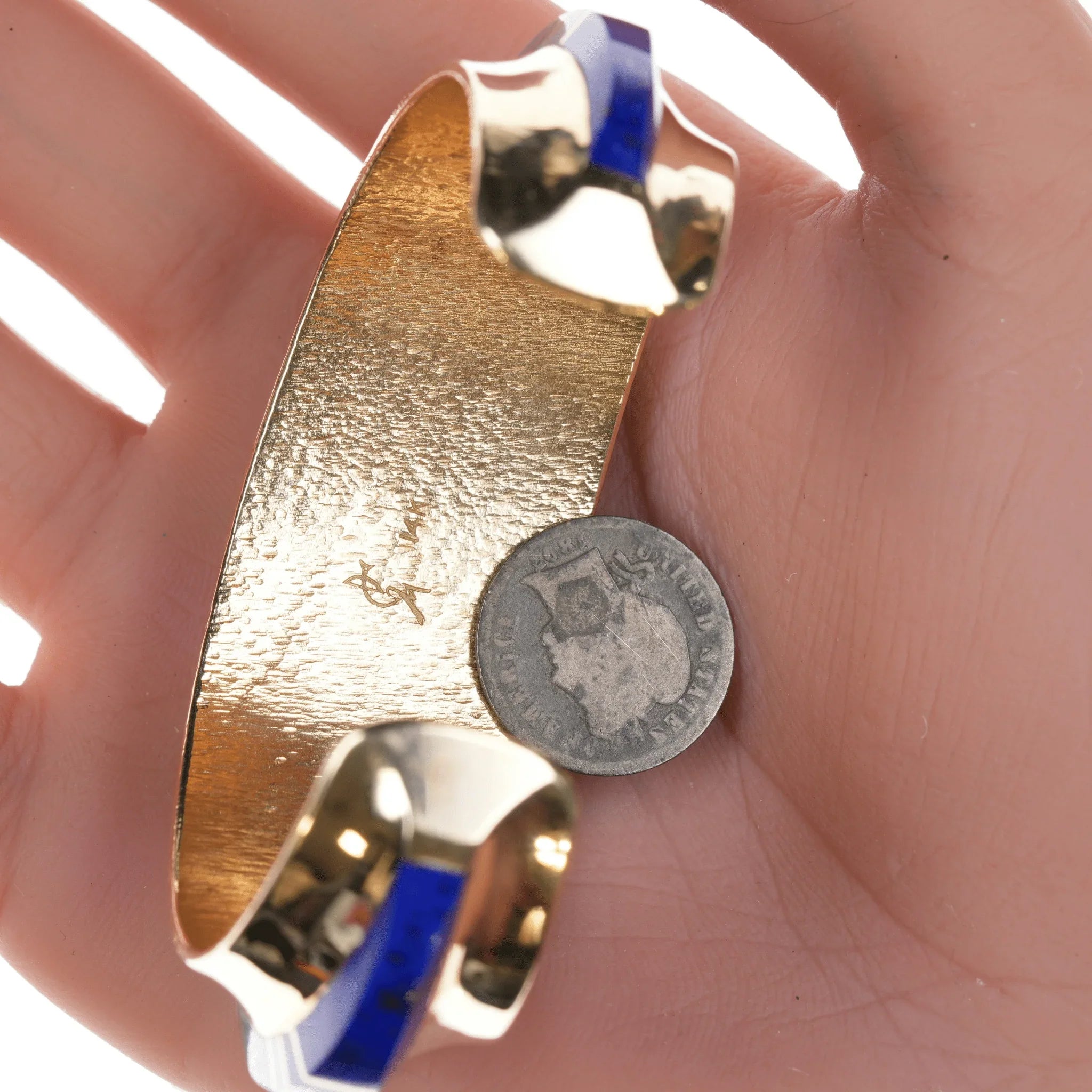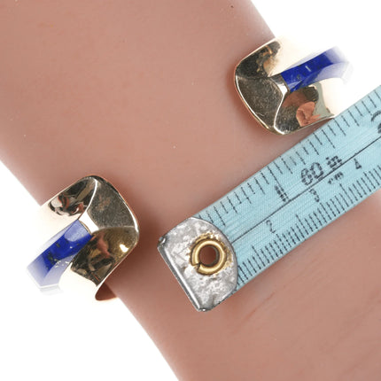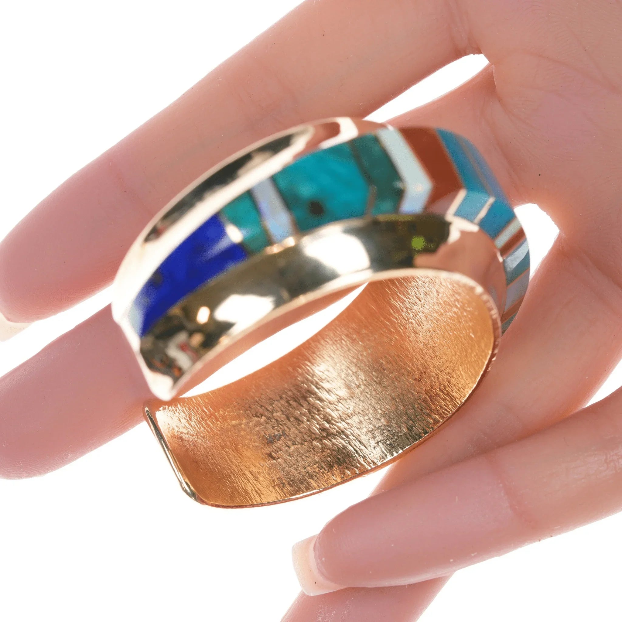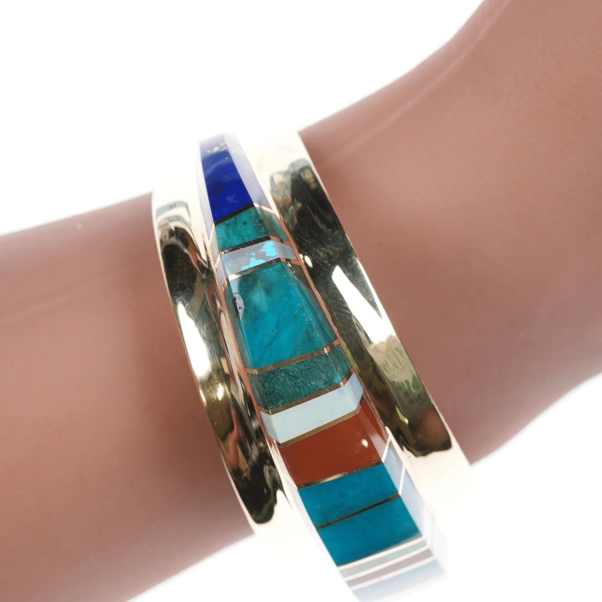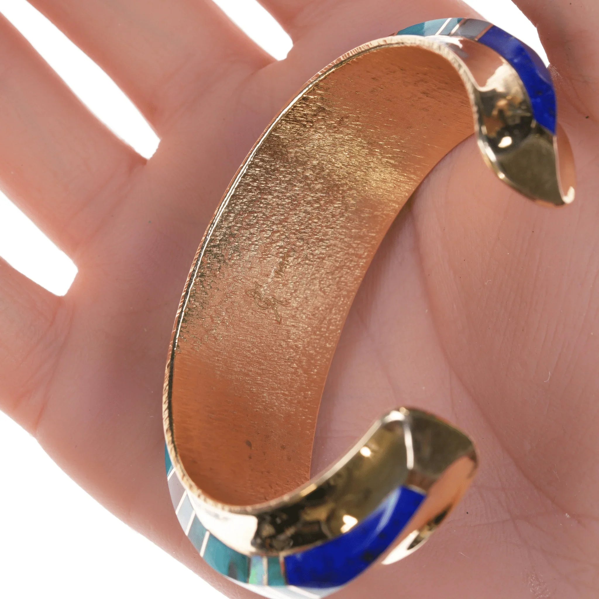 6" Duane Makitma Hopi 14k gold Multi-stone channel inlay cuff bracelet. 5" plus 1" gap, 6" total inside including gap. 25mm wide in center tapering down to 15mm on the tips, 10mm tall, 64.2 grams. Super clean with no detectable damage or wear inside or out. I don't believe it has ever been worn. Hallmarked by artist twice in interior, hallmarked 14k 3 times in interior. A very well respected artisan, at the time of listing this is arguably the best piece of his being offered for sale online. Comparable silver bracelets by this artisan retail for around 3-4k. This would probably retail for 25k+ with current gold and material prices directly from the Artisan or at a gallery.