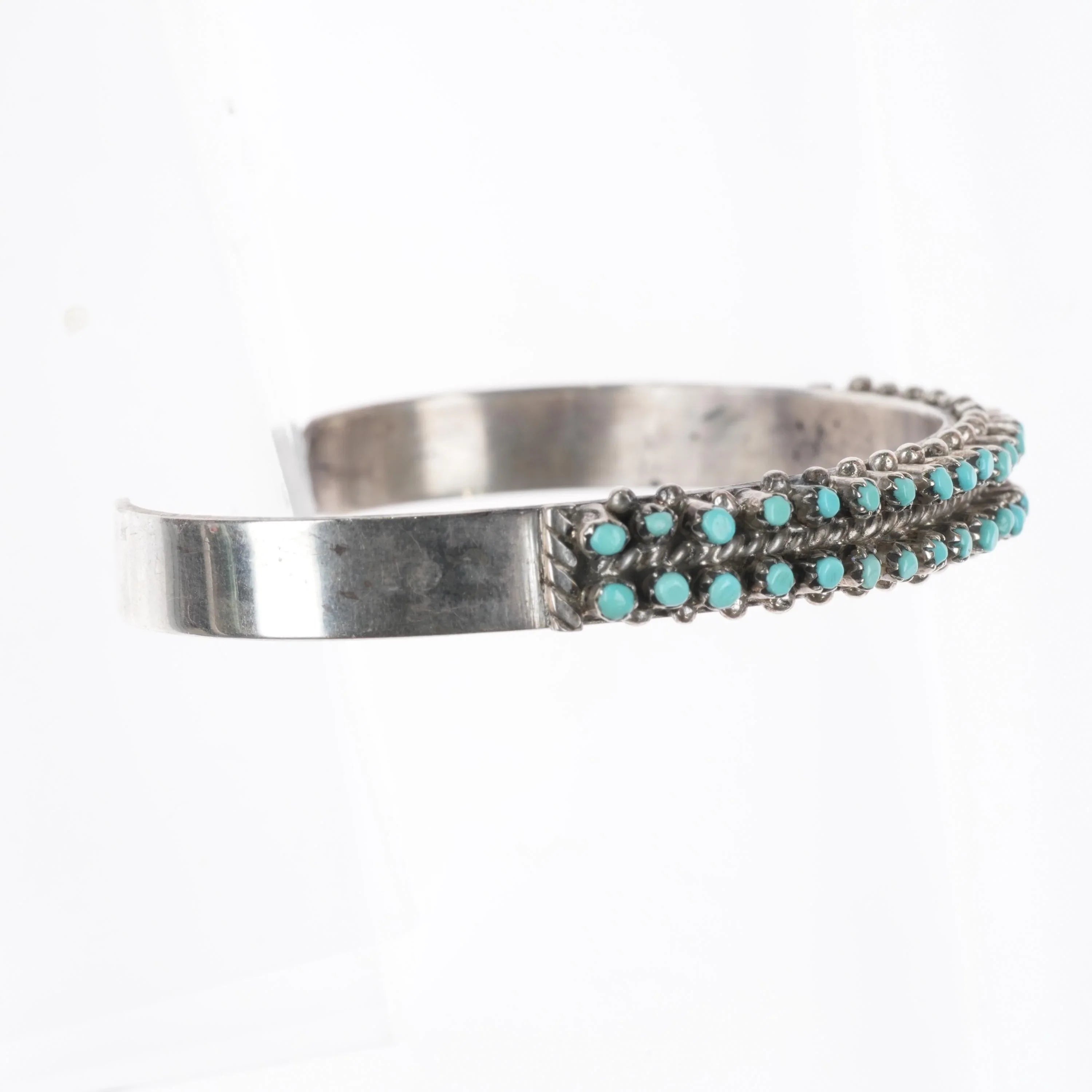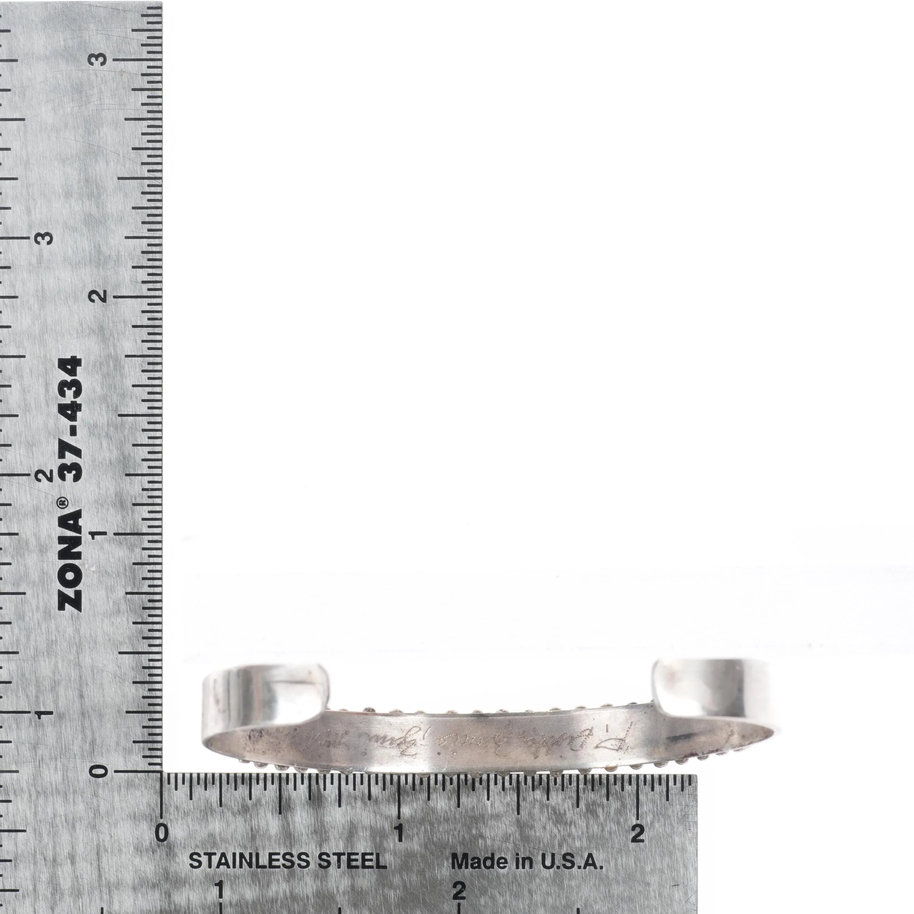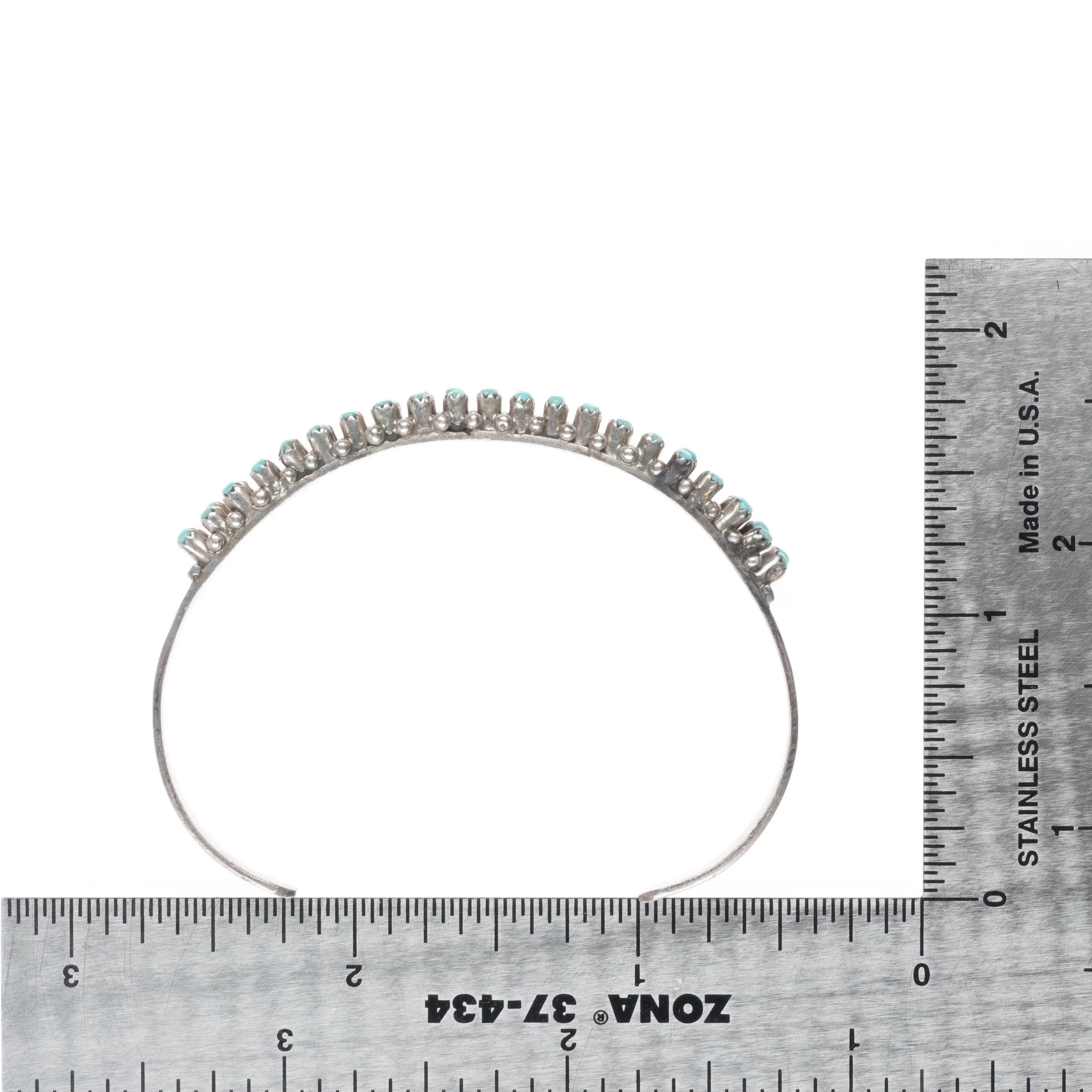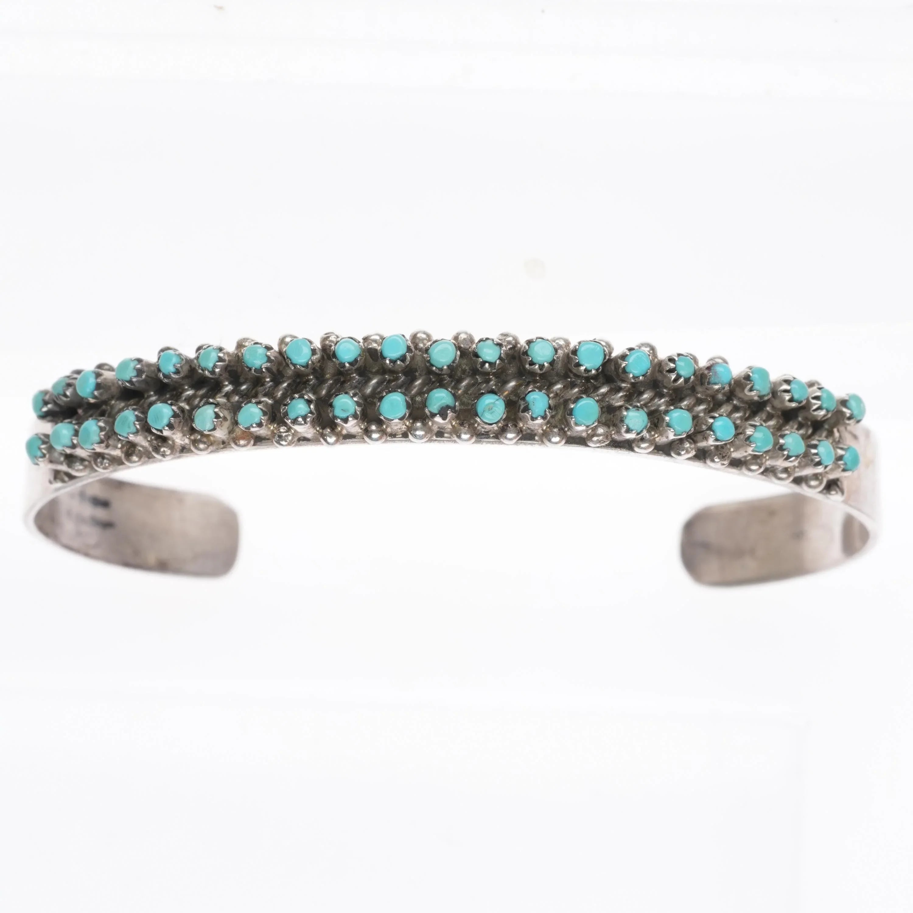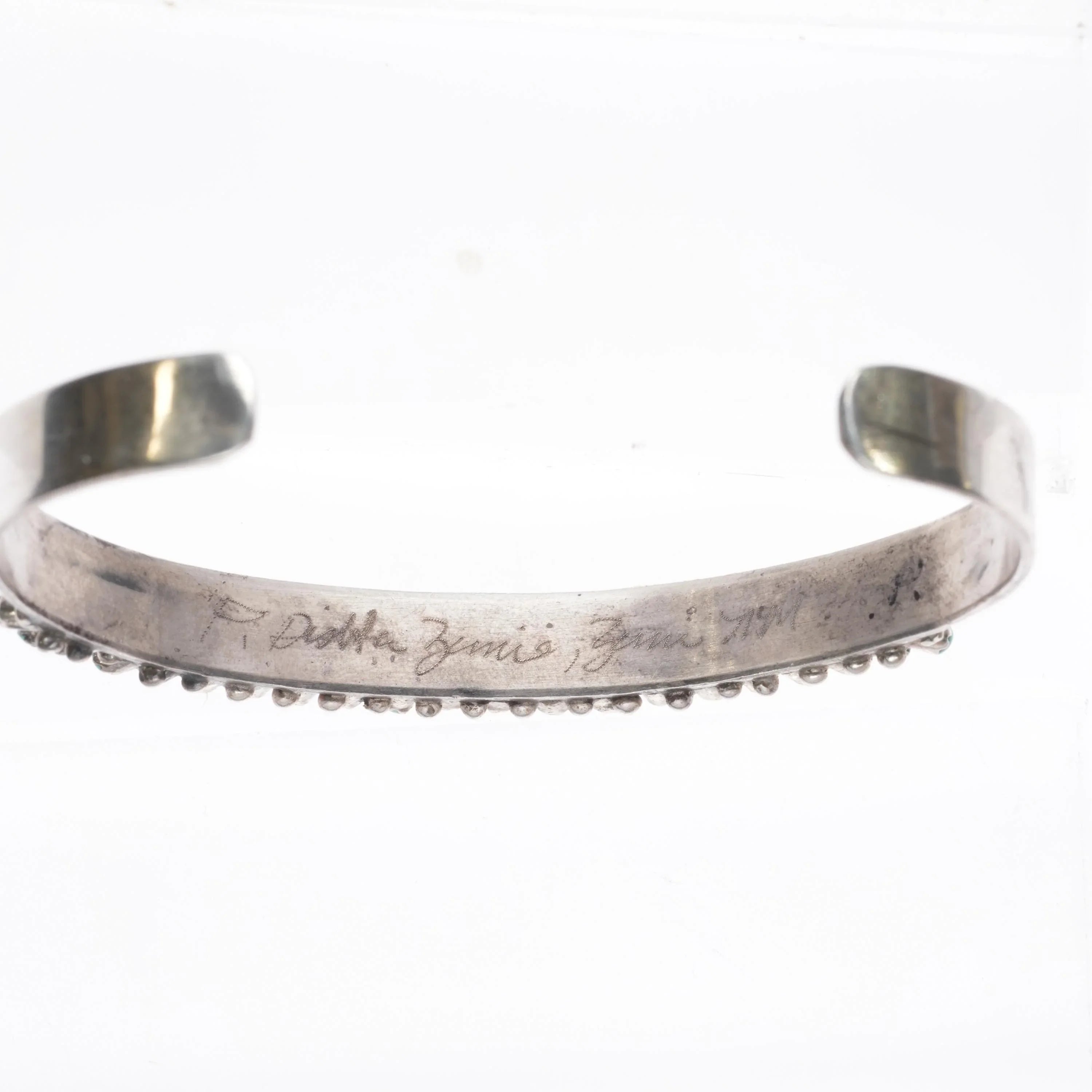 6" P Dishta Zuni Snake Eye turquoise double row cuff bracelet sterling silver. Tested and guaranteed solid sterling silver with weight and measurements in pictures. Good condition, circa last quarter of the 20th century with no damage.