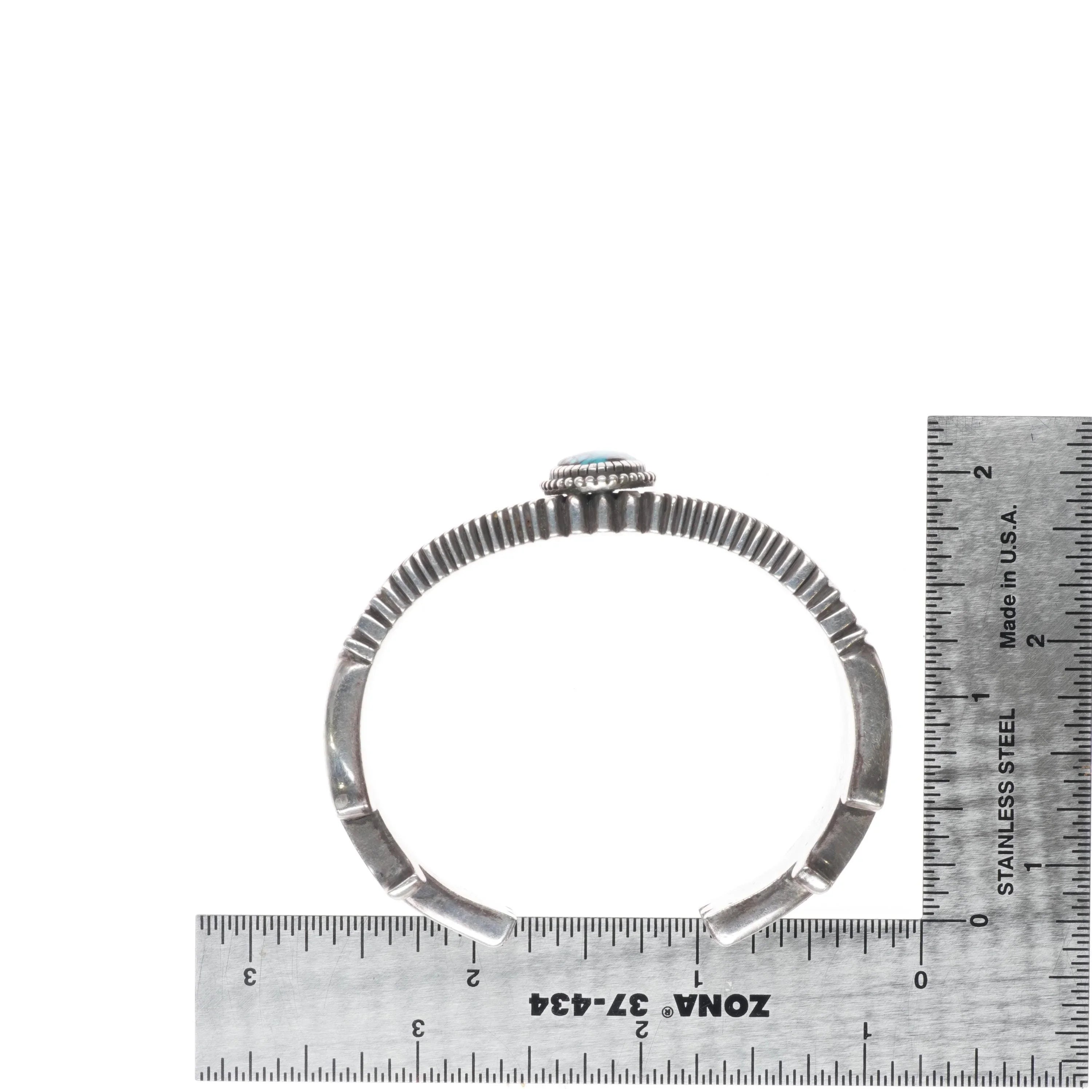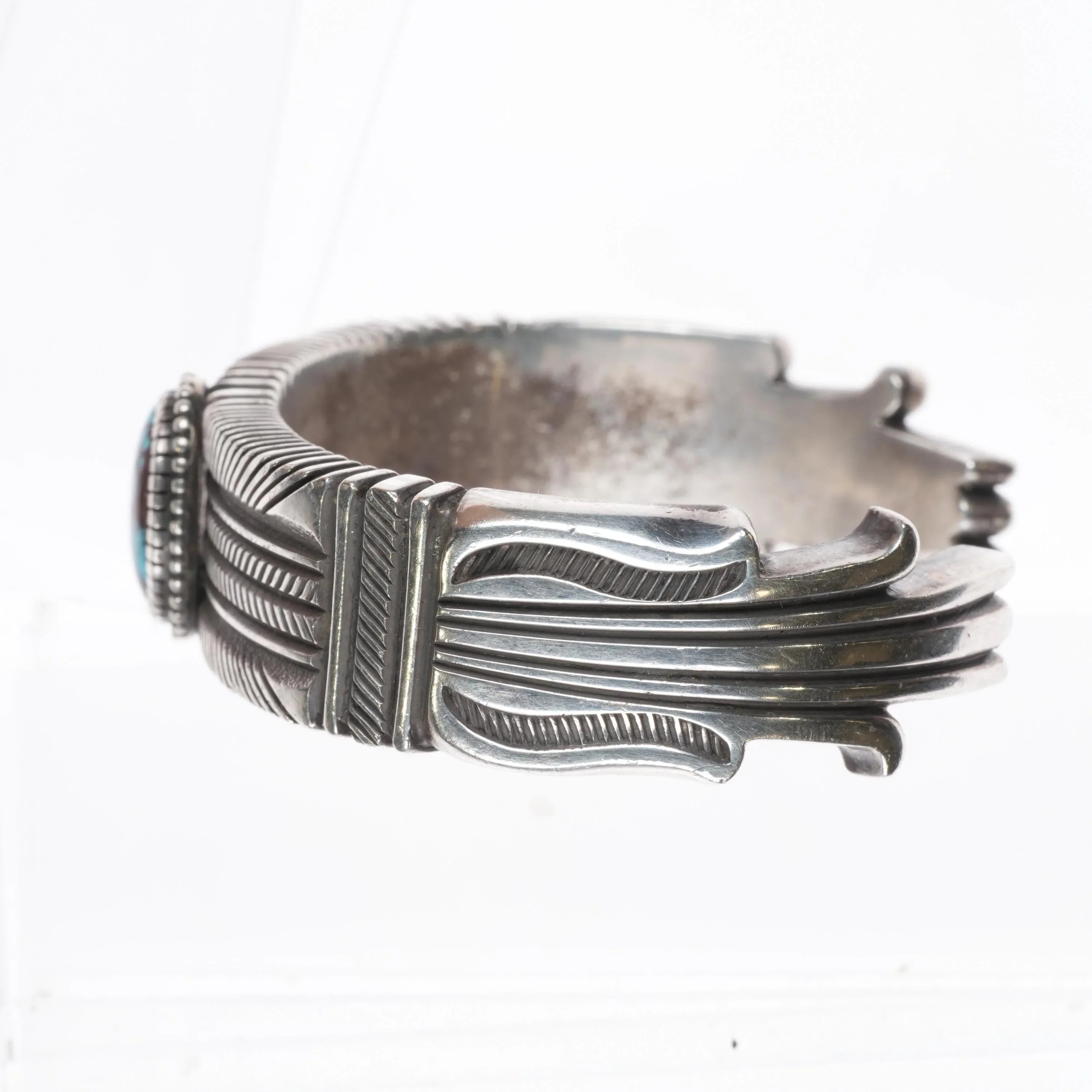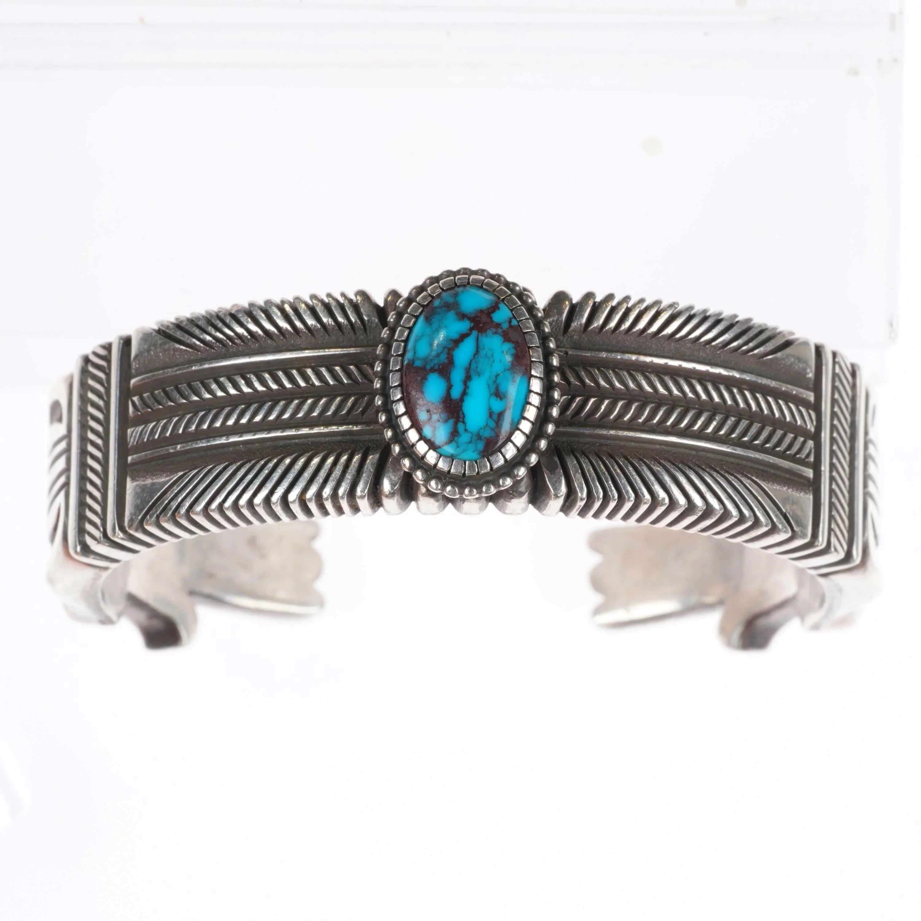 6" Ron Bedonie Navajo Intricately stamped sterling silver turquoise cuff bracelet. Tested and guaranteed solid sterling silver. Weight and measurements in pictures. Very clean with no significant wear, very high grade turquoise stone with a beautiful chocolate matrix. Could be Bisbee.