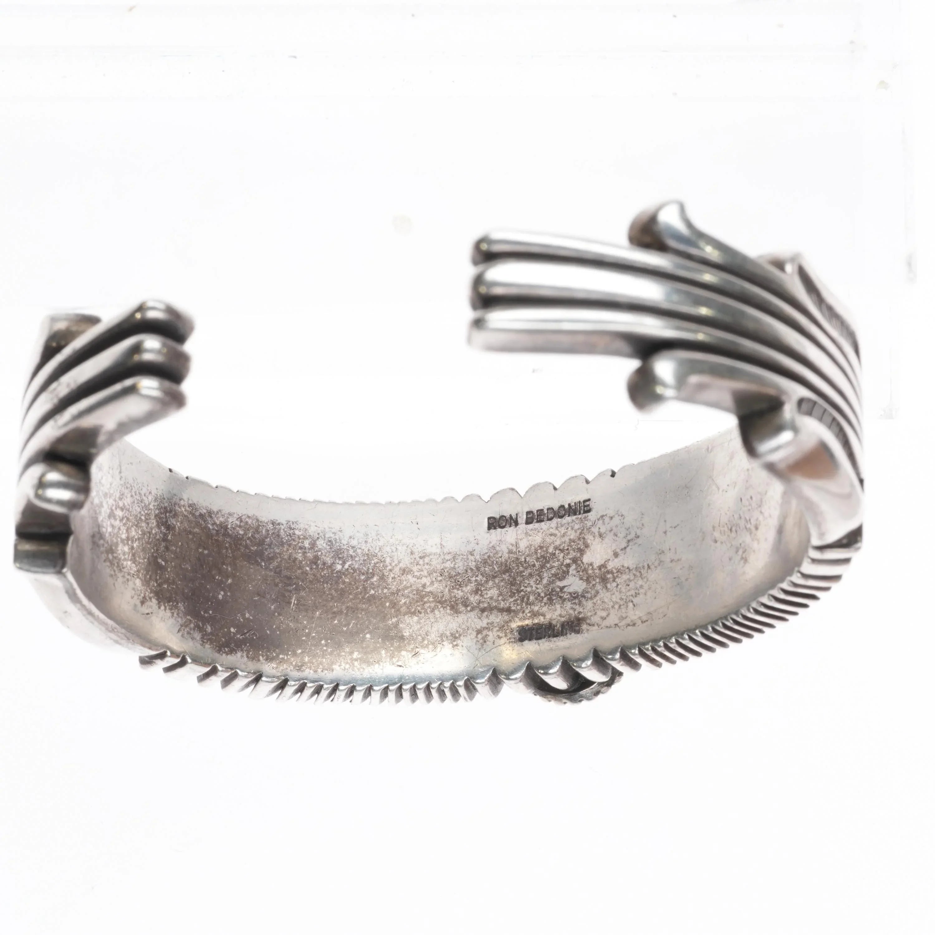 Ron Bedonie began working with silver when he was 20 years old, having learned sliversmithing techniques from his parents, Lutricia Yellowhair and John Bedonie Sr. Rons mother Lutricia (d. 2021) was especially a major support and influence in his life. She was a highly-skilled silversmith who specialized in the feather design.
