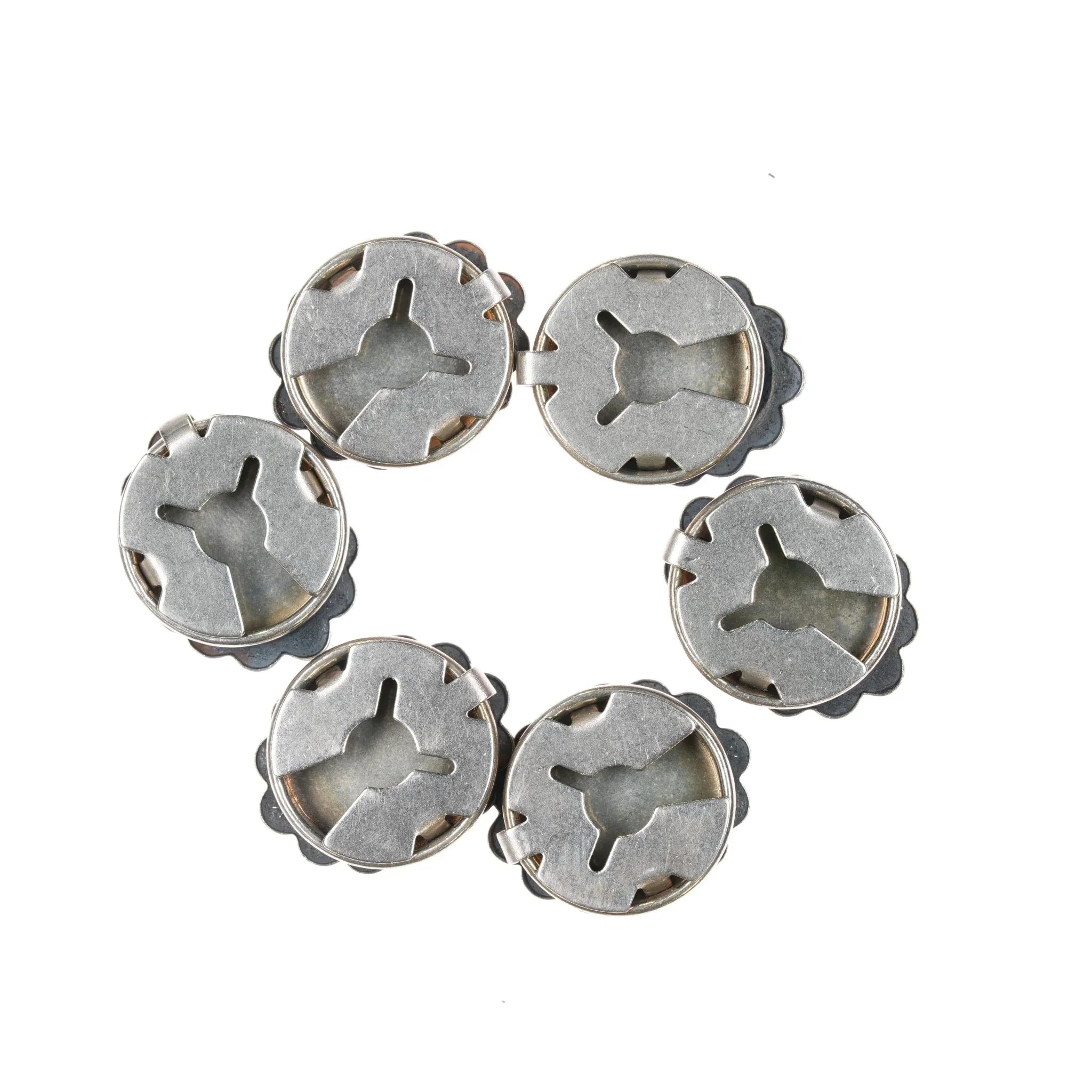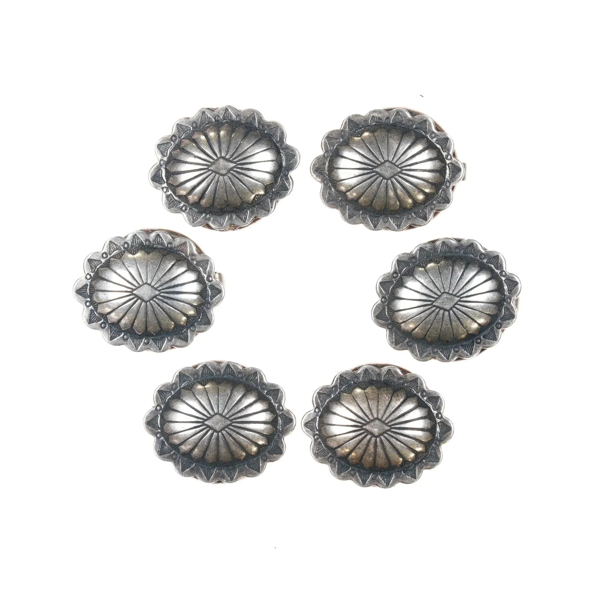 6 Sterling button covers with concho designs. Sterling fronts, the clip mechanism isn‘t sterling, never is. Weight and measurements in pics, no issues. These are made to clip on your existing buttons.