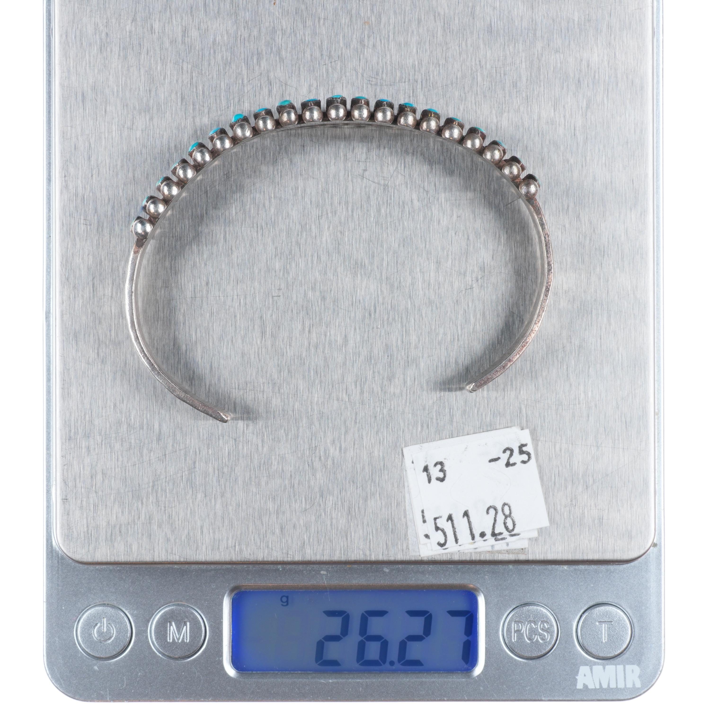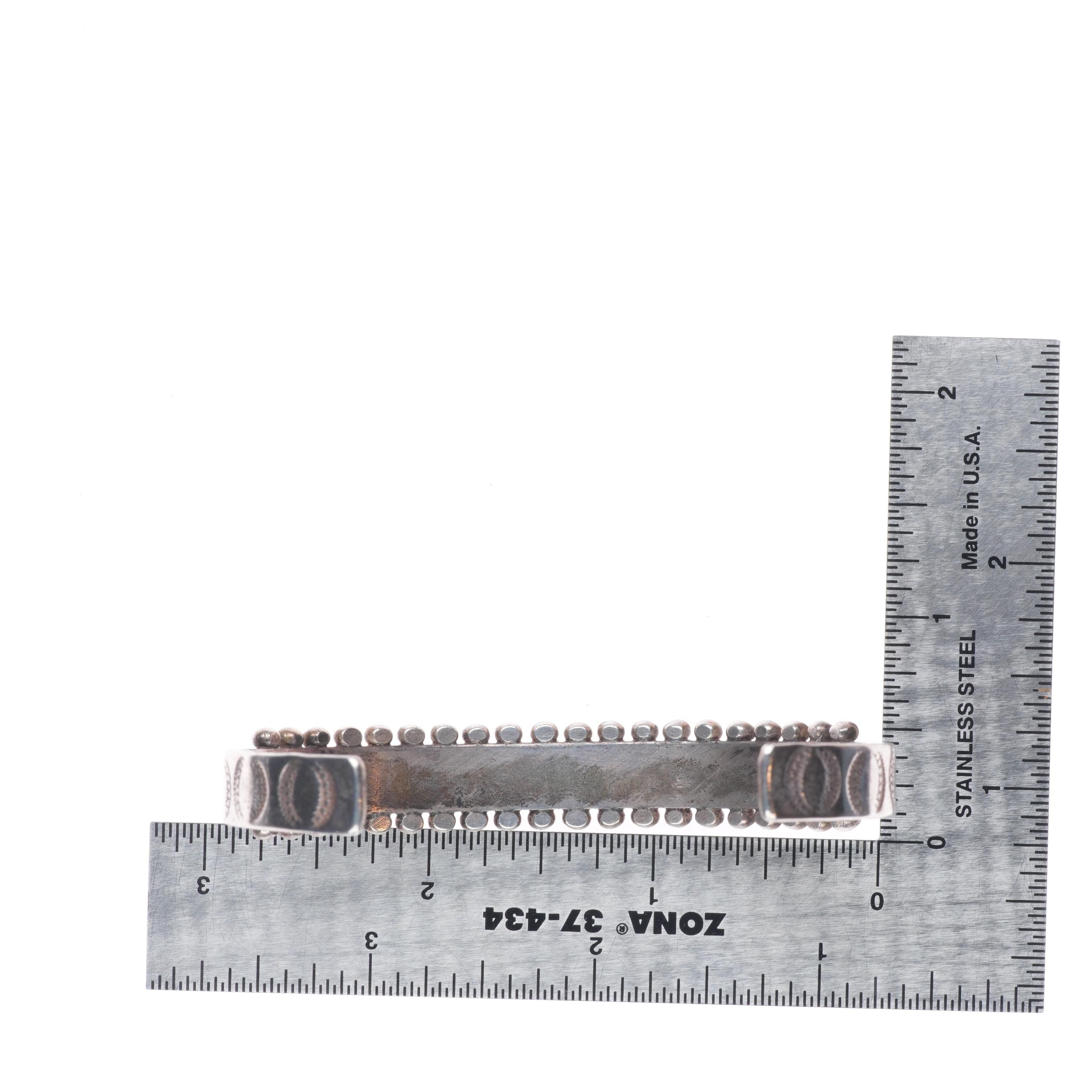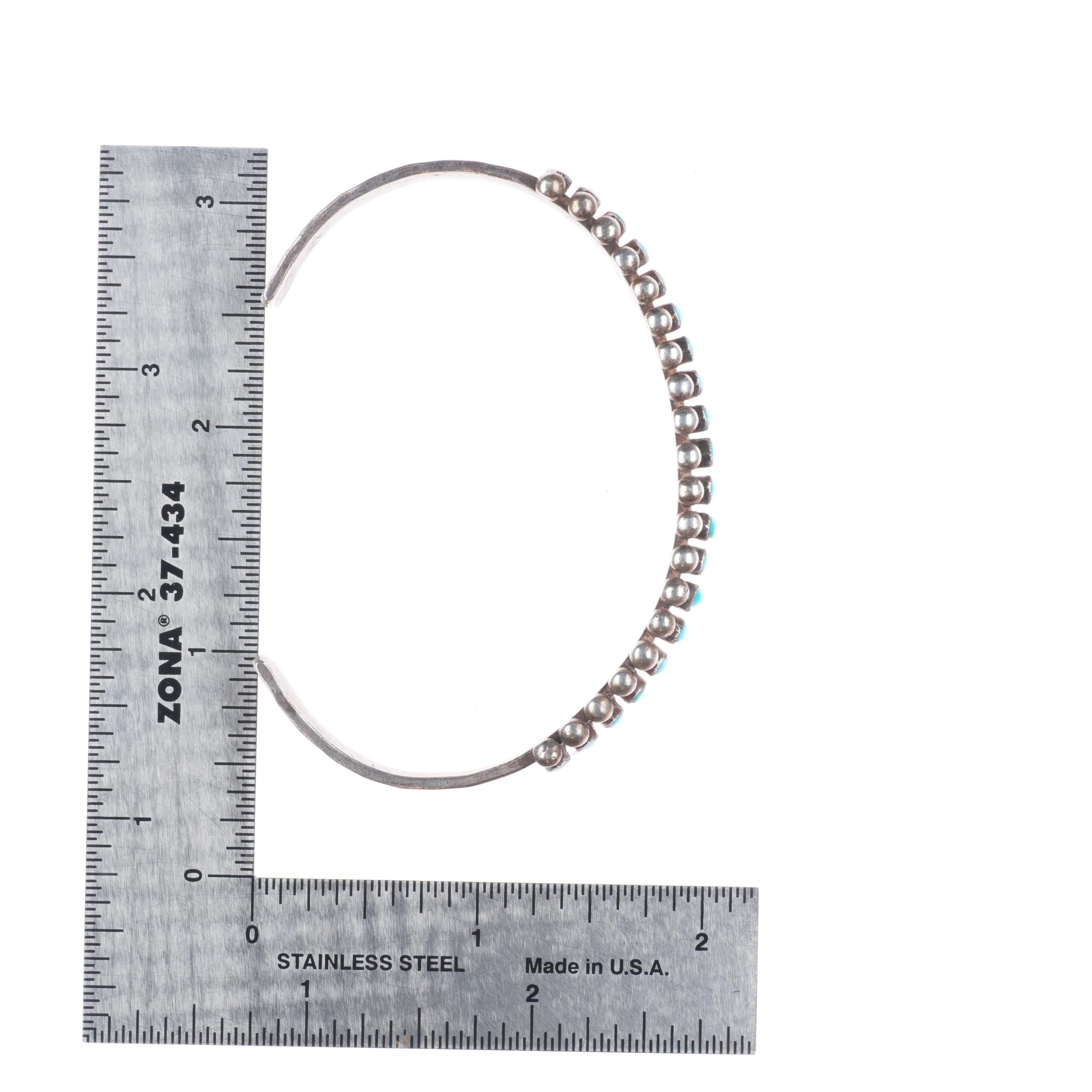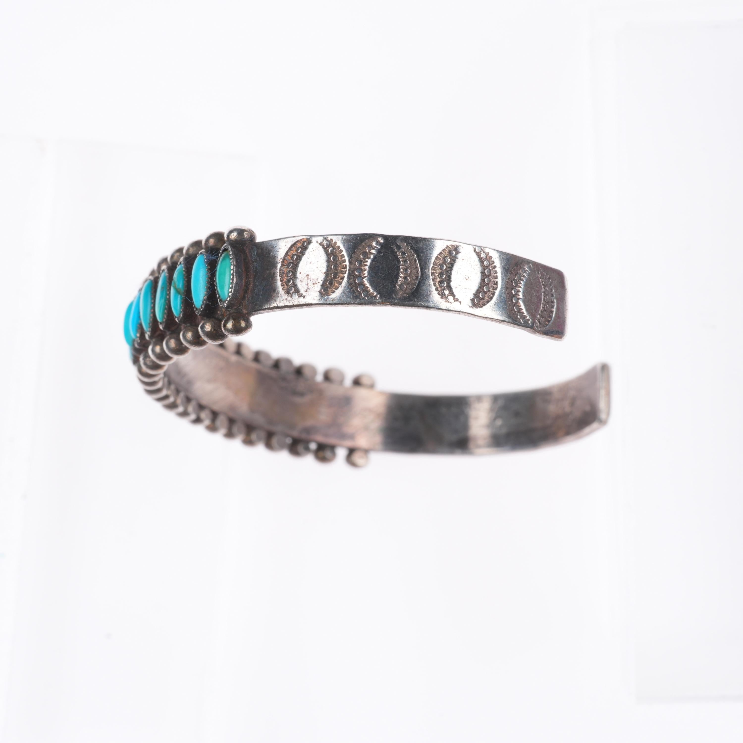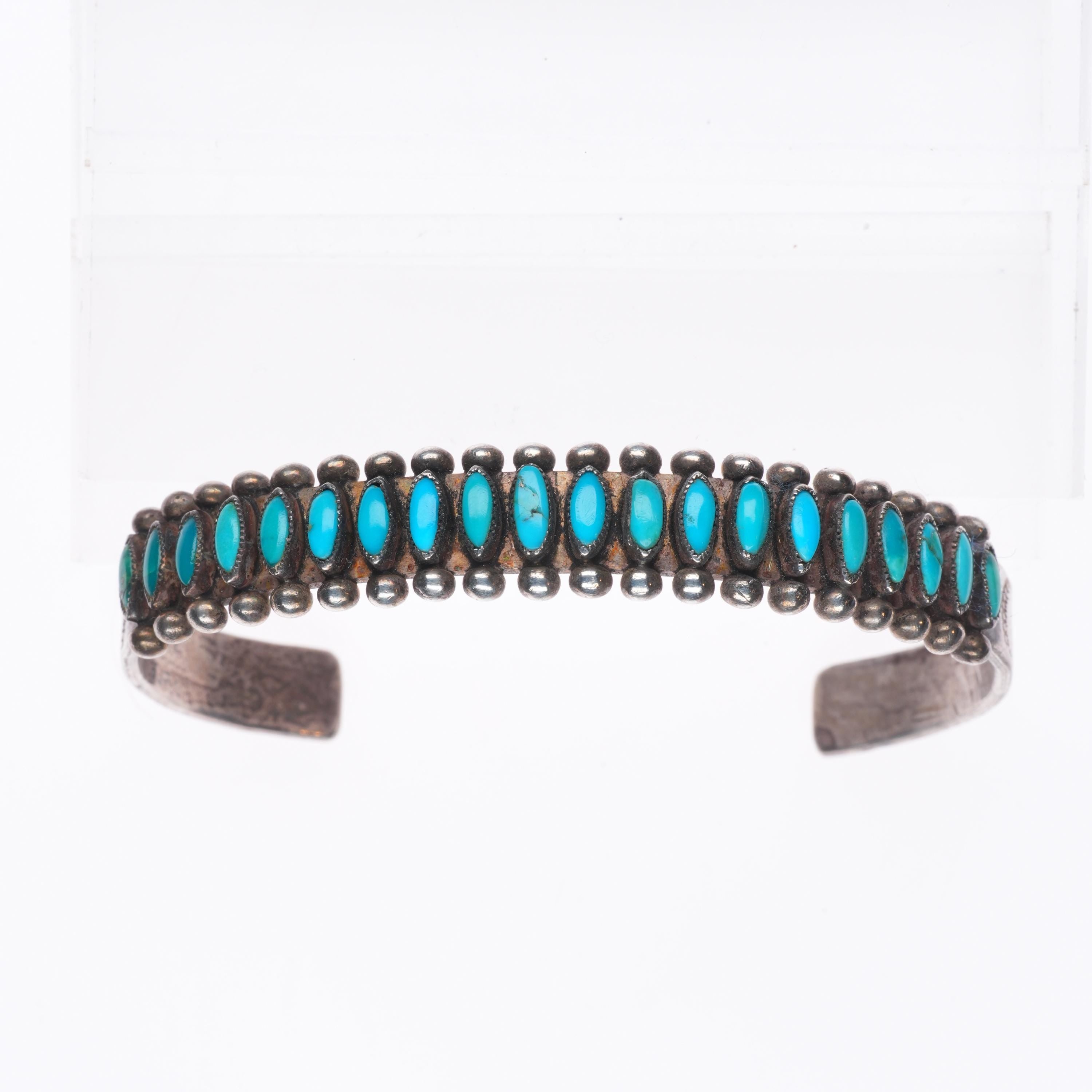7.1" 30's-40's Zuni sterling silver turquoise row cuff bracelet needlepoint. Tested and guaranteed solid sterling silver with weight and measurements in pictures. Circa second quarter of the 20th century with some expected age appropriate wear. 3 stones with old secure fractures, intact.