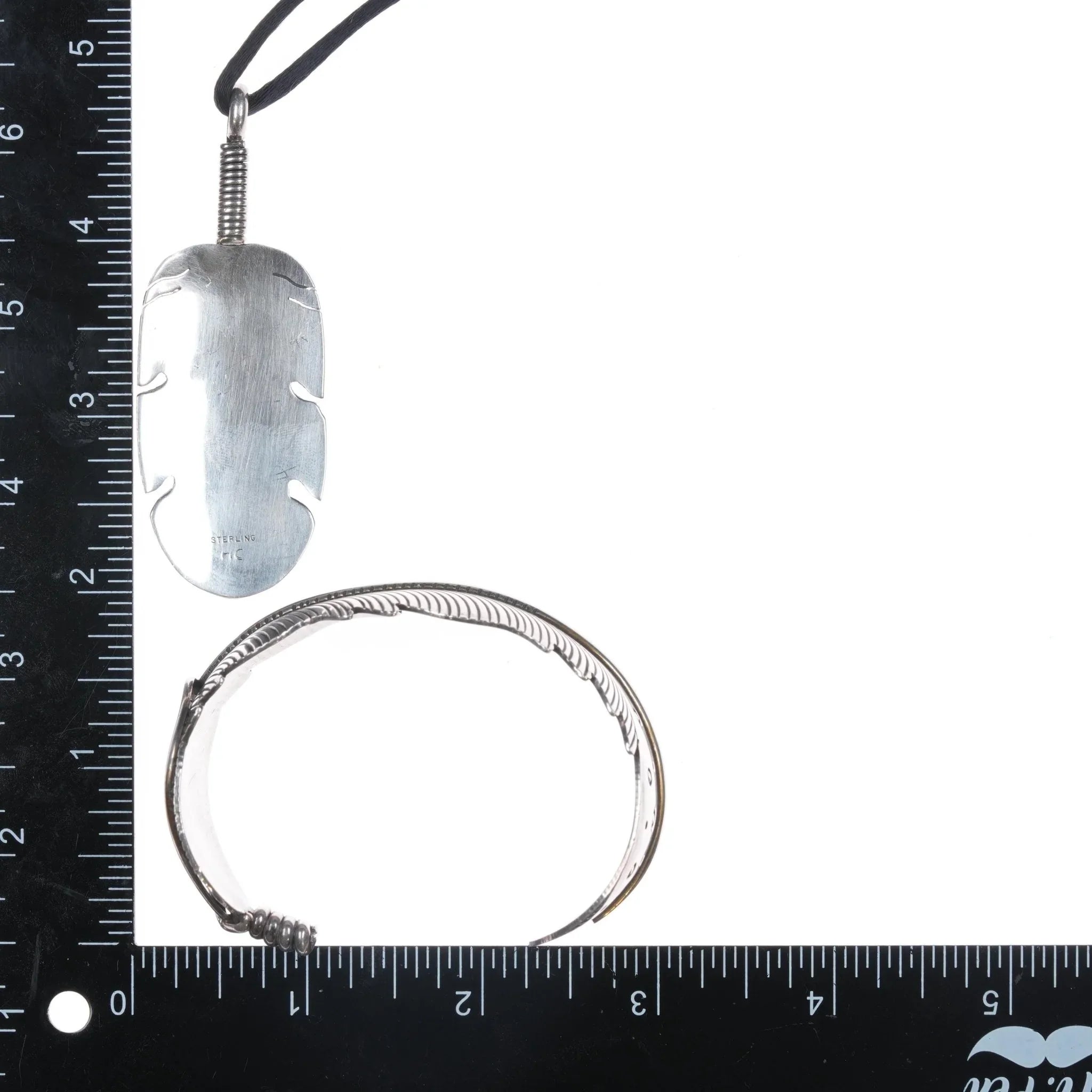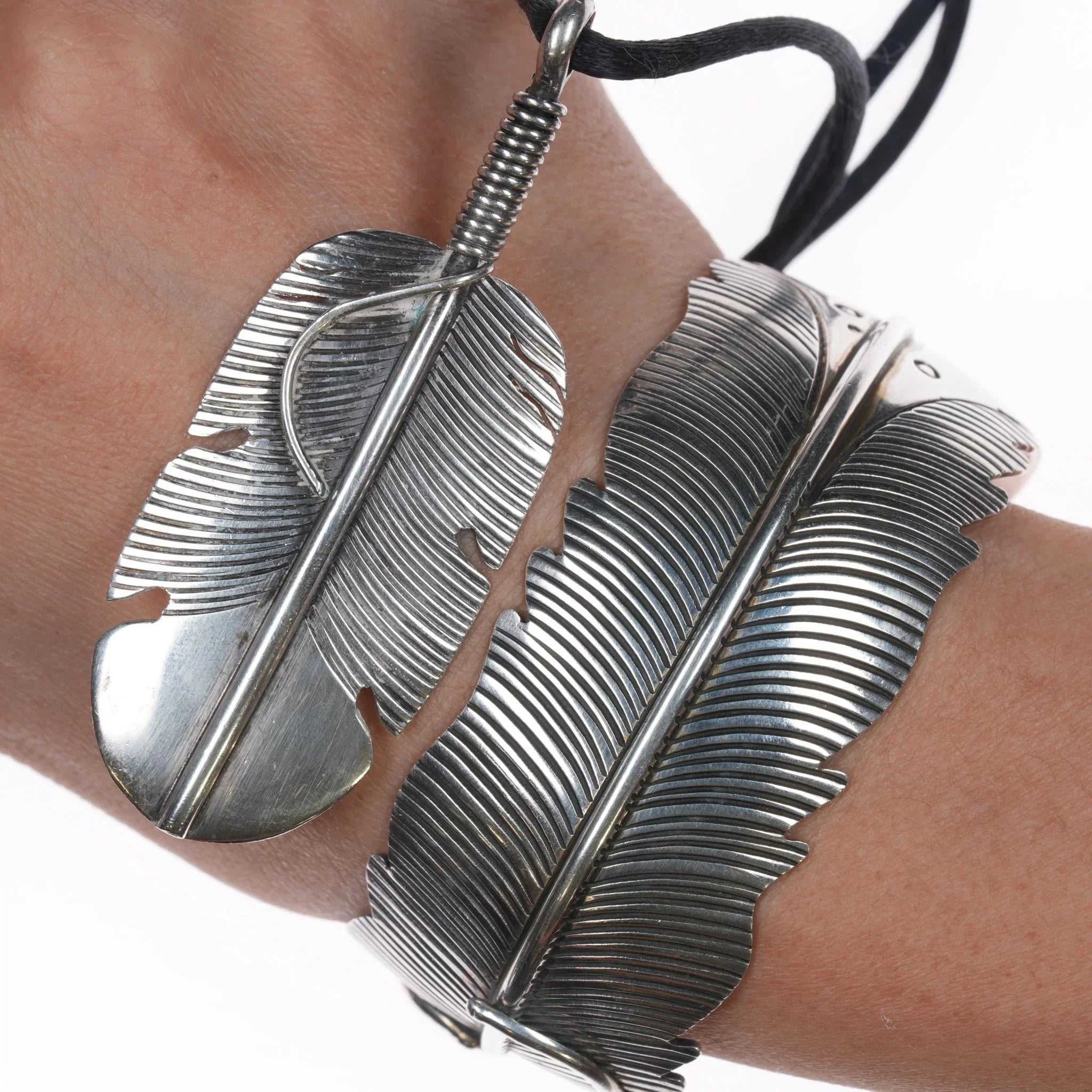 7 1/8" Douglas Etsitty Navajo sterling feather cuff bracelet and pendant. Solid silver, weights and measurements in pics. Both Sturdy, I think the pendant is made by another Navajo silversmith.