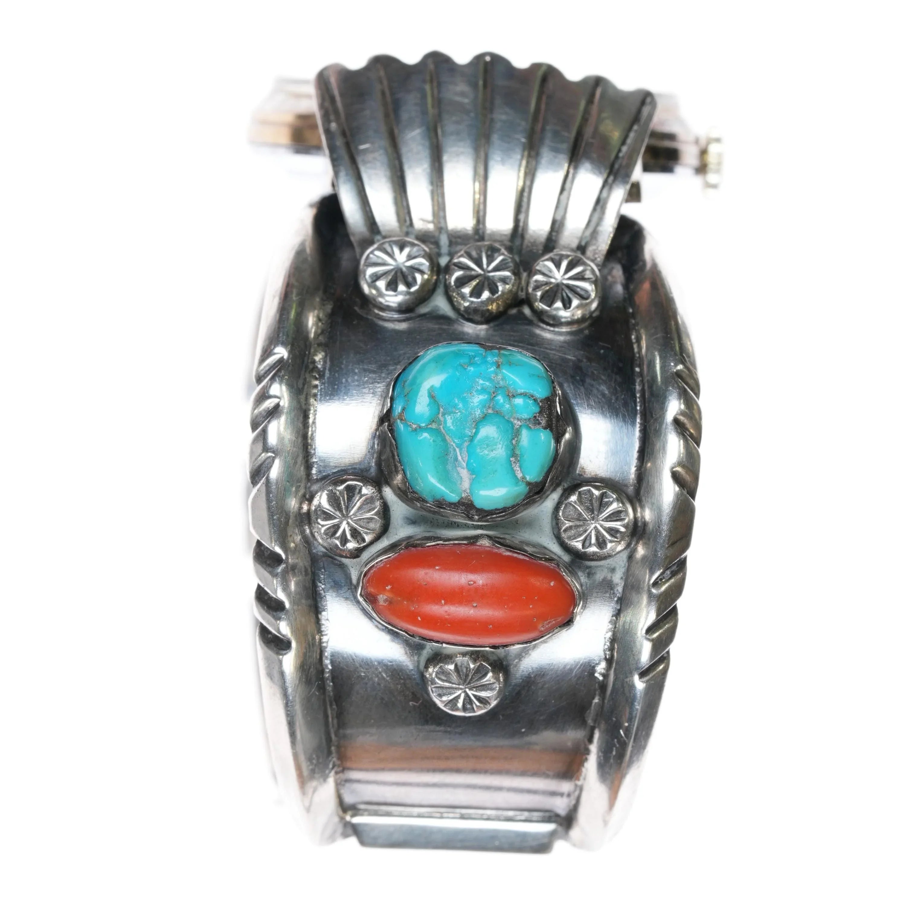 7.1" EPL Navajo Sterling silver, turquoise, coral Watch Cuff bracelet