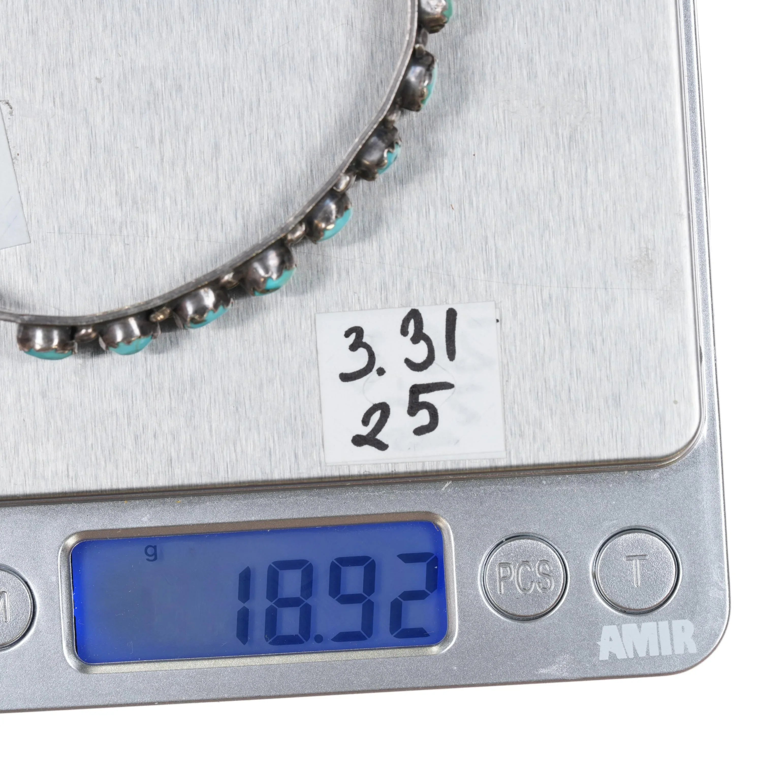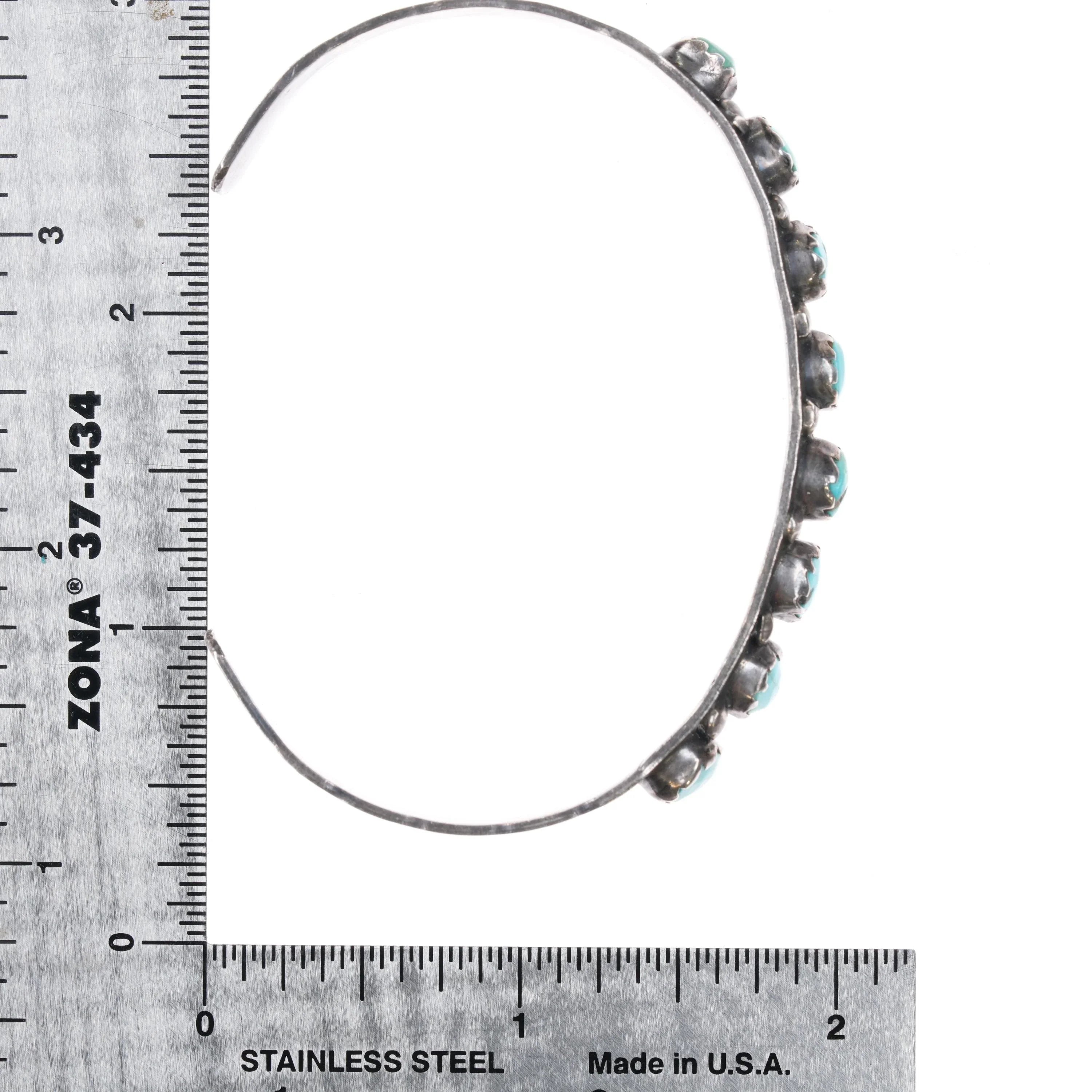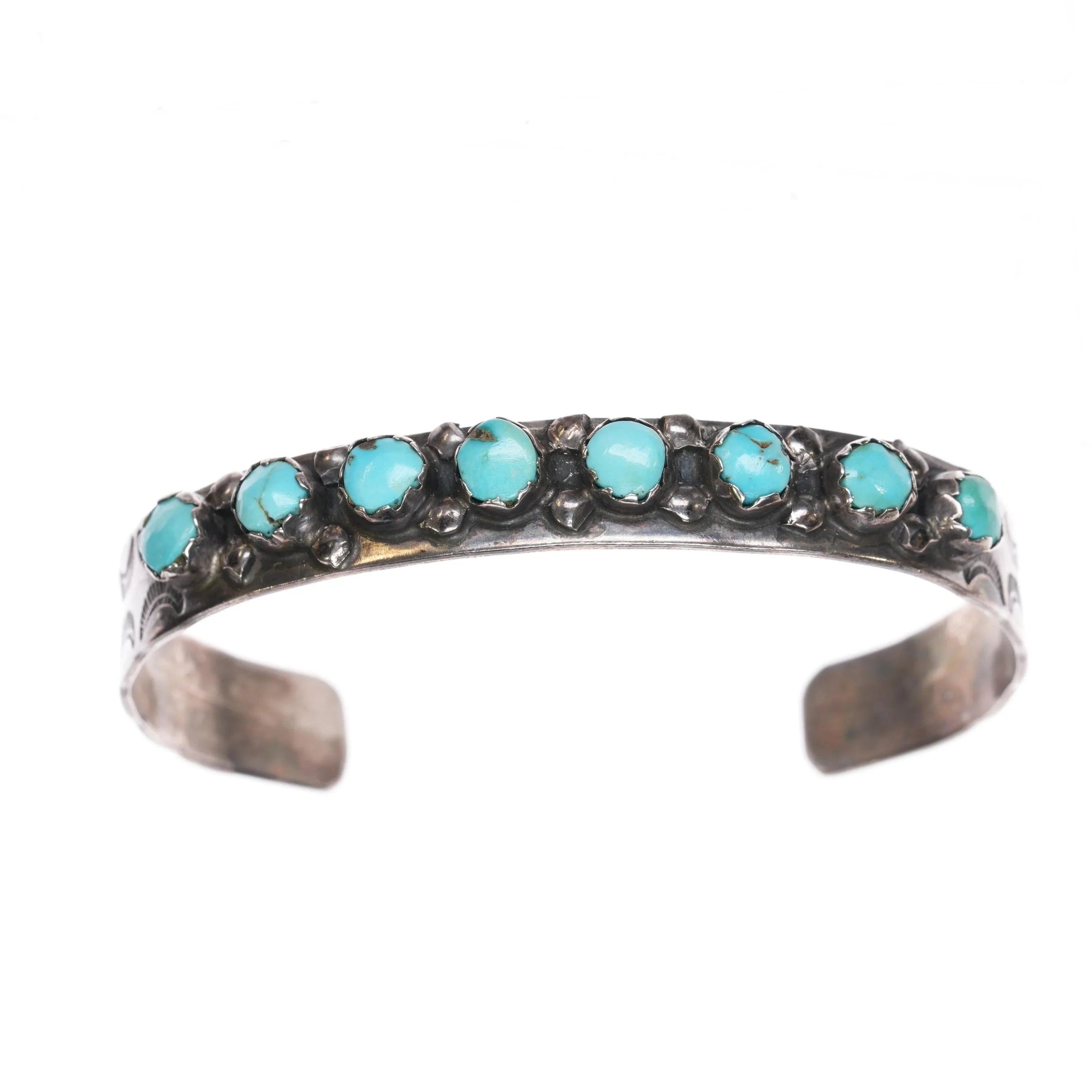 7" 40's-50's Zuni carved turquoise row cuff bracelet w/nice deep stamped sides
