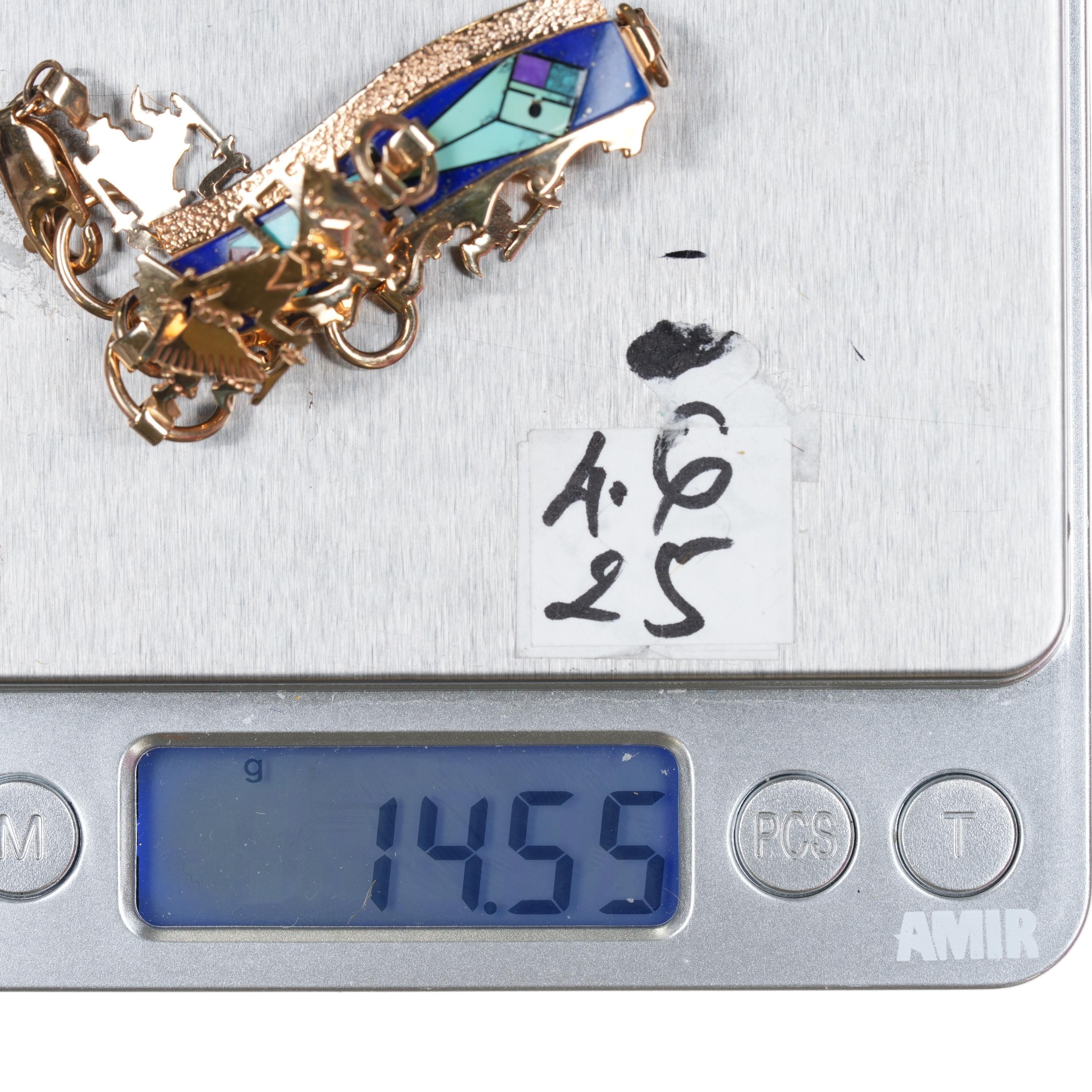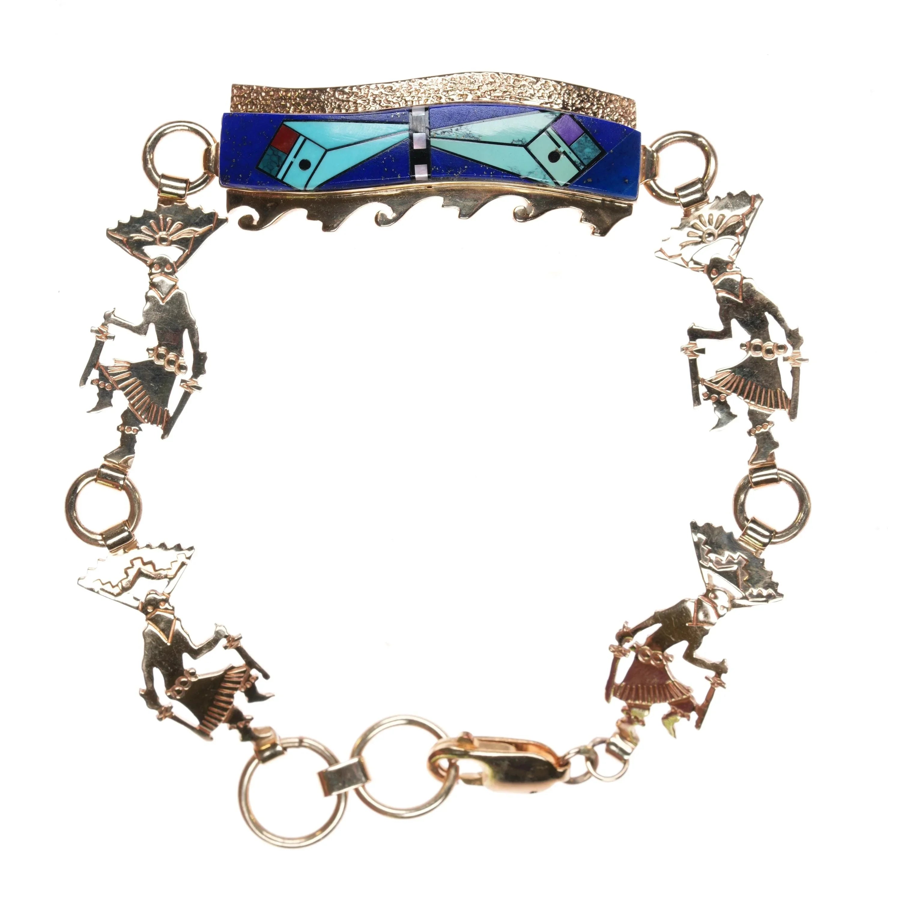 7.75" Herman Hoskie Navajo 14k gold Ghan Dancer turquoise/lapis inlay bracelet