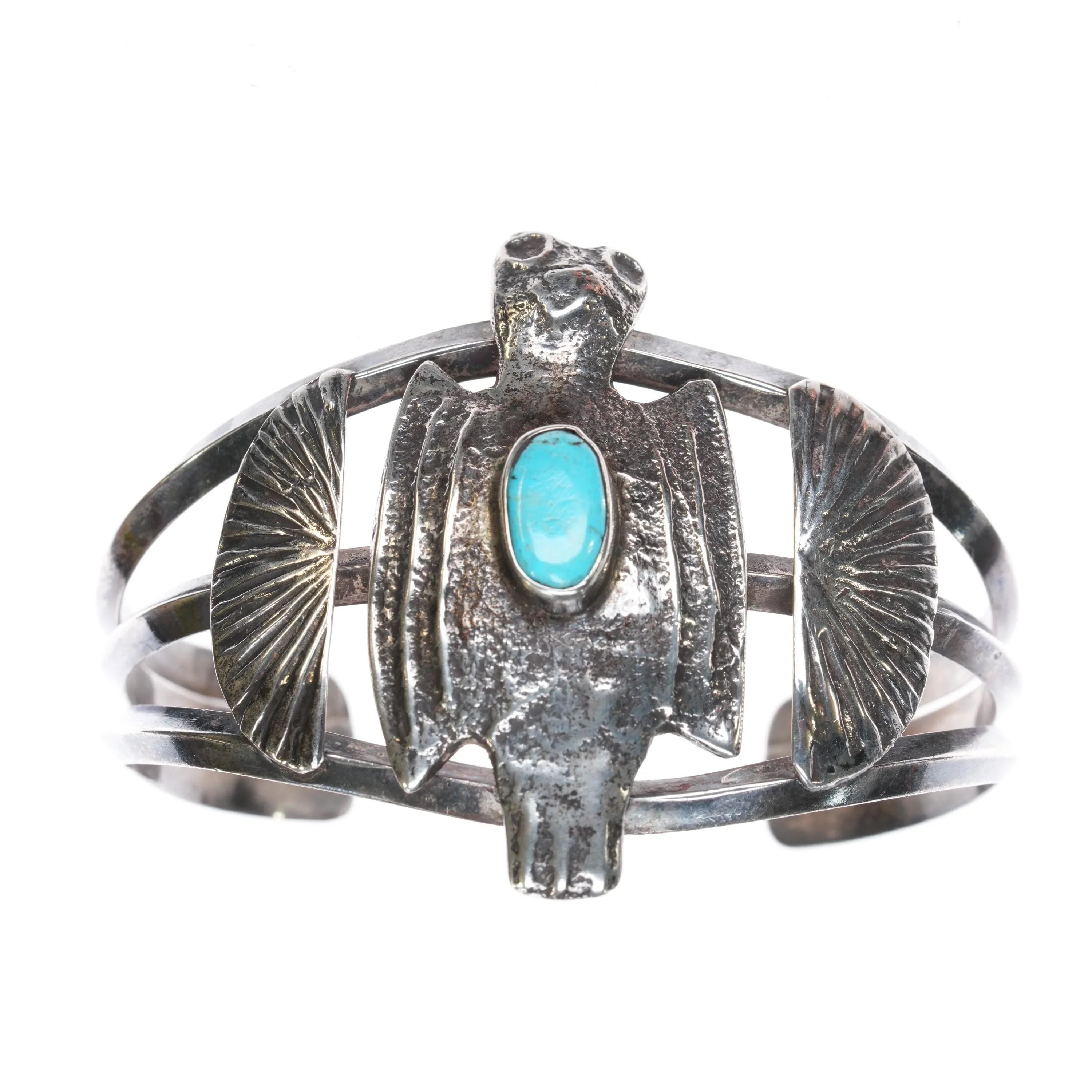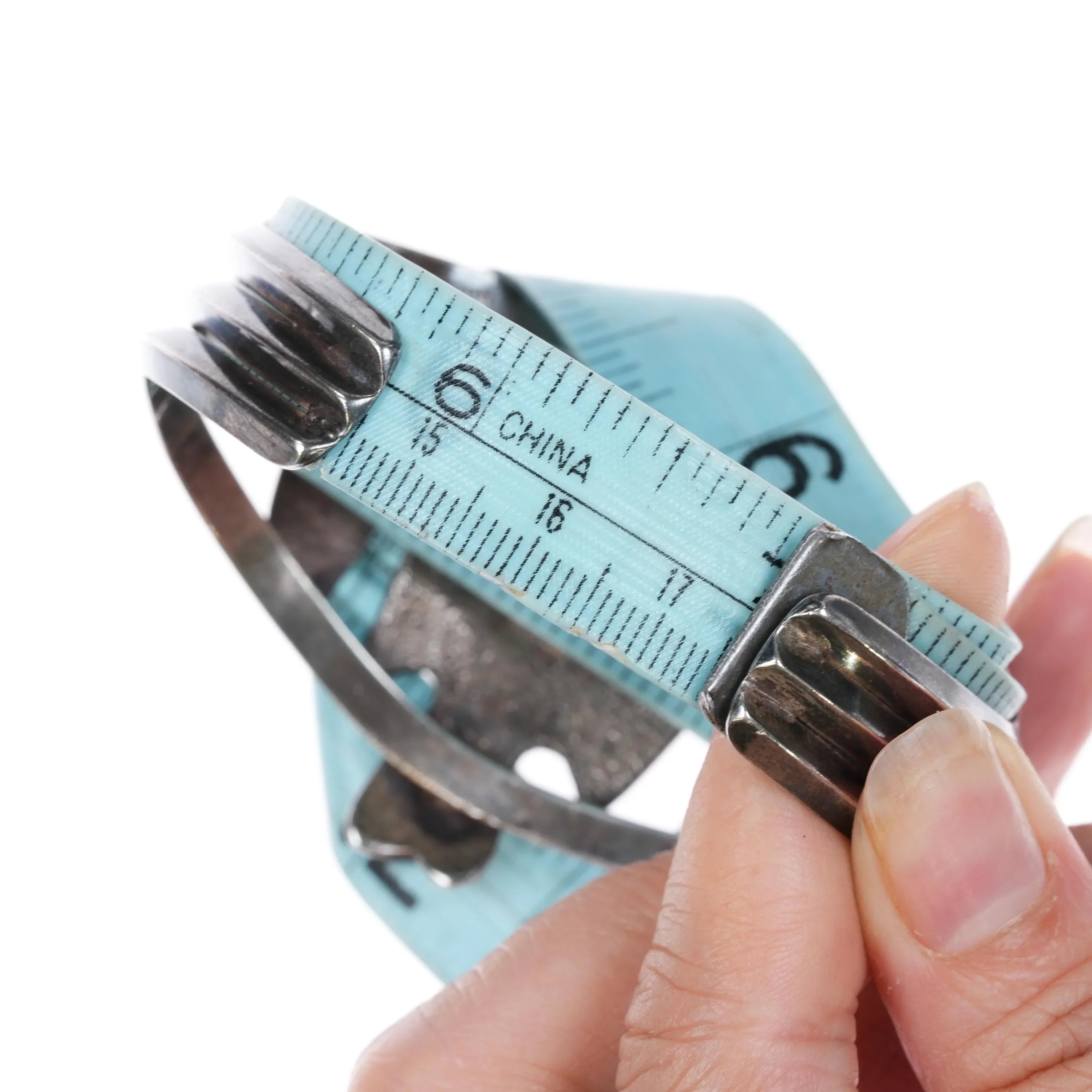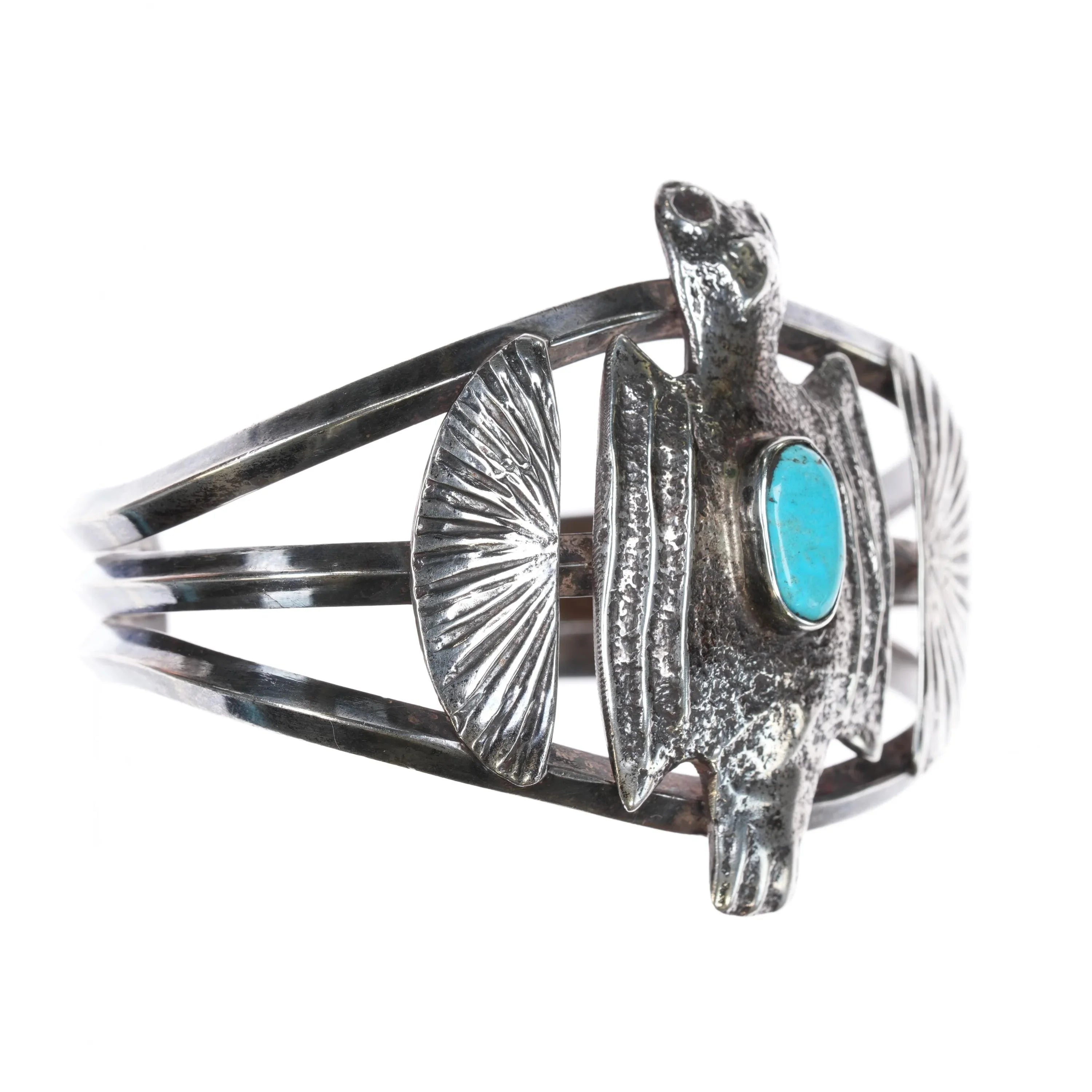7" Leo Coriz Santo Domingo Pueblo tufa cast silver and turquoise cuff bracelet. Solid sterling silver. Will fit up to a 7 wrist, gap size and other measurements in pictures. Nice, well made bracelet. Contemporary bracelet, hardly worn.