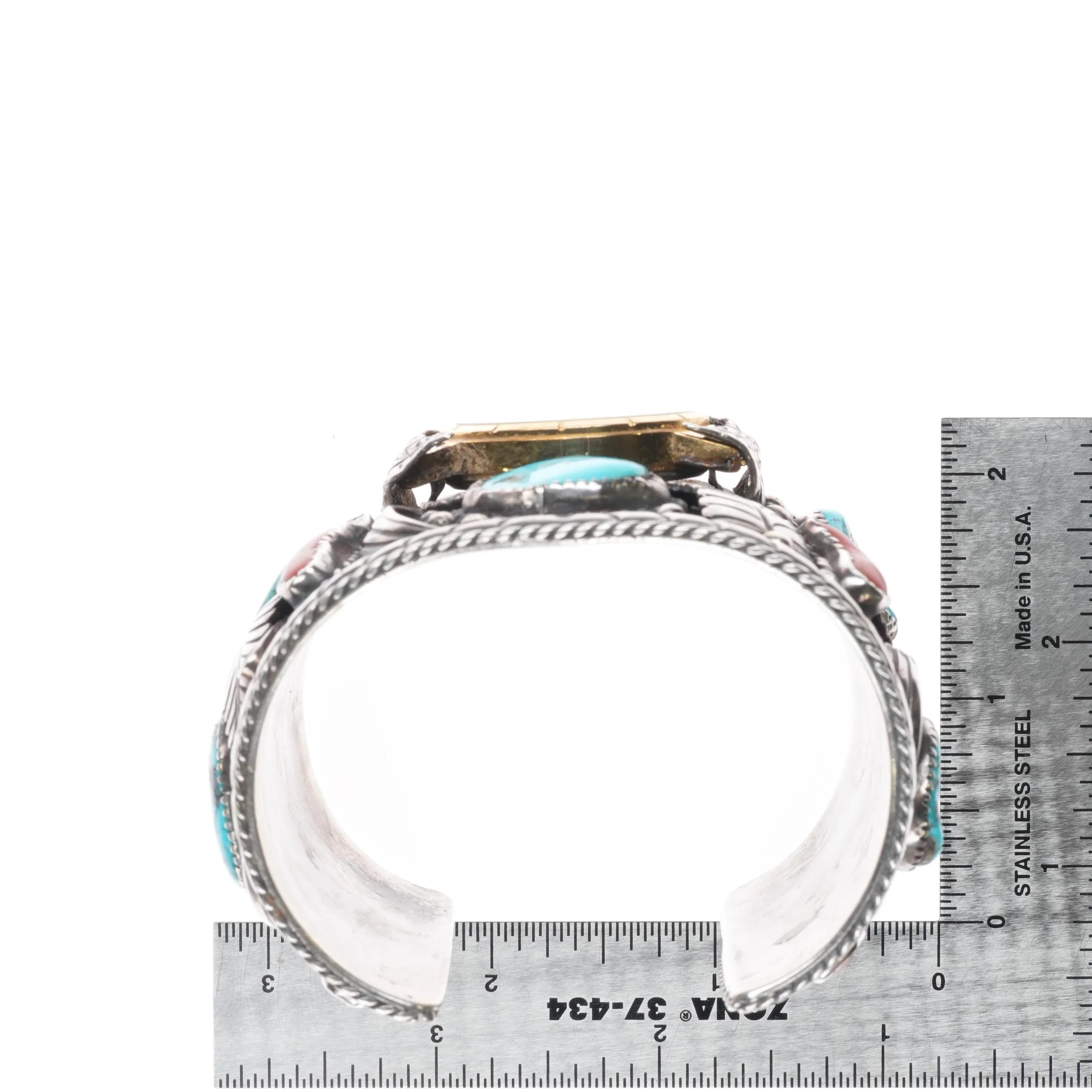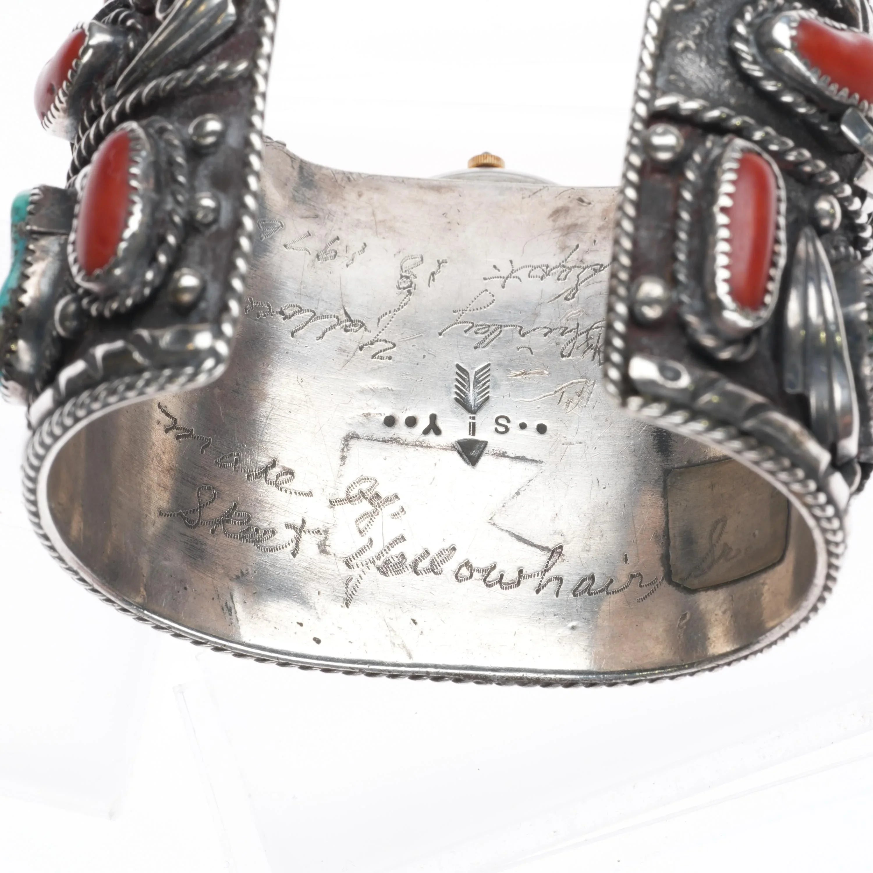 7" Skeet Yellowhair Sr Navajo Huge sterling, turquoise/coral watch cuff bracelet. Selling the watch bracelet shown, tested and guaranteed solid sterling silver c1976 . Weight and measurements in pictures. Has a clean Disney Lorus watch in it. Appears to have been made by him as a gift to his wife or daughter. Possibly never worn. Watch needs a battery.
