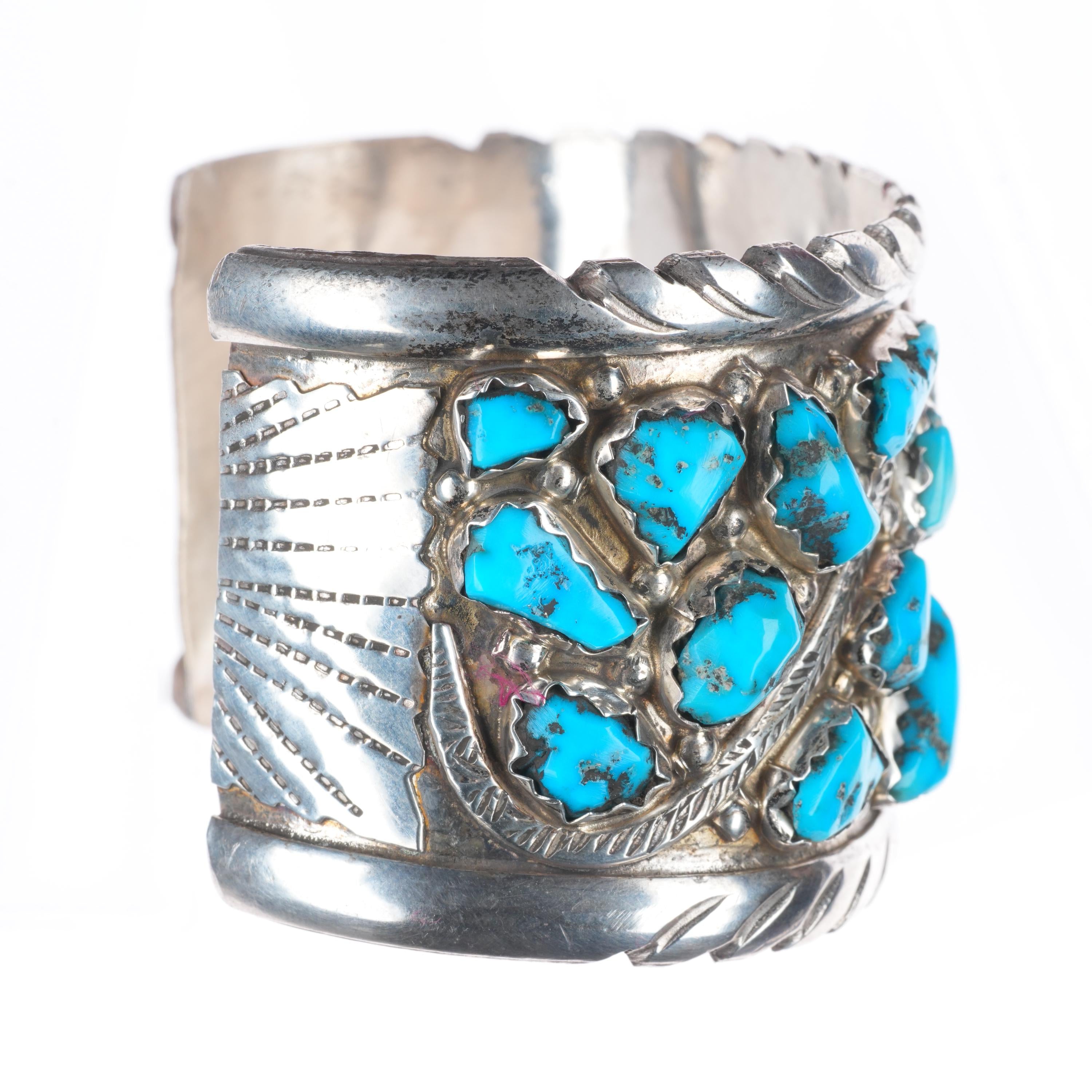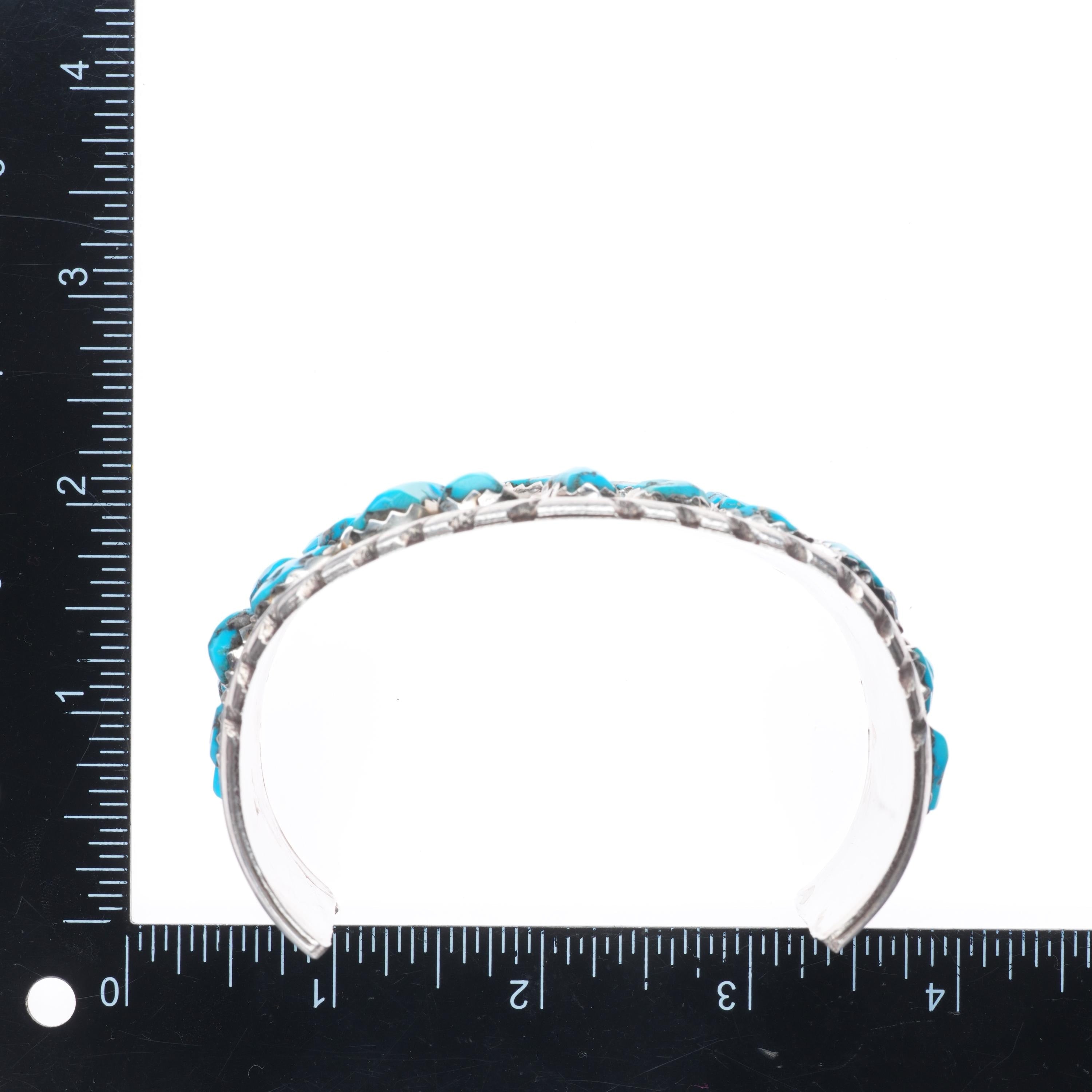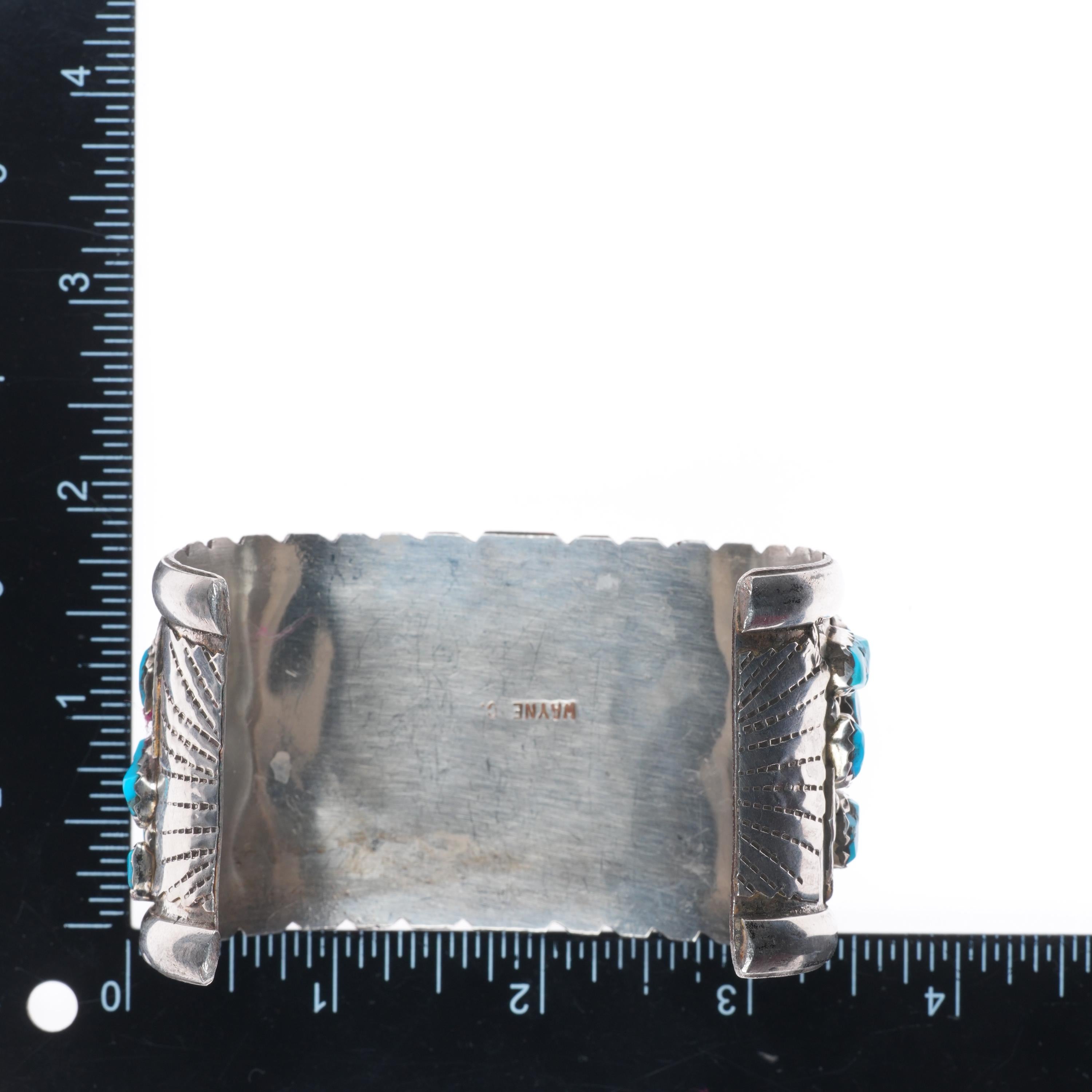 8.25" Wayne Cheama Zuni sterling silver snake cuff bracelet turquoise cluster. Tested and guaranteed solid sterling silver with weight and measurements in pictures. Circa third quarter of the 20th century. Fits up to a 8.25" wrist without adjustment, though .25" or more of careful adjustment is typically very simple. Any adjustment will change the gap size of course which is shown in the pictures. This bracelet could easily be taken down to a 7.5" or so, I would be happy to do it before shipping.