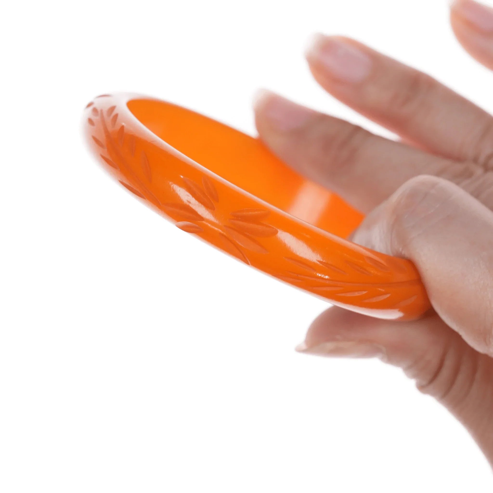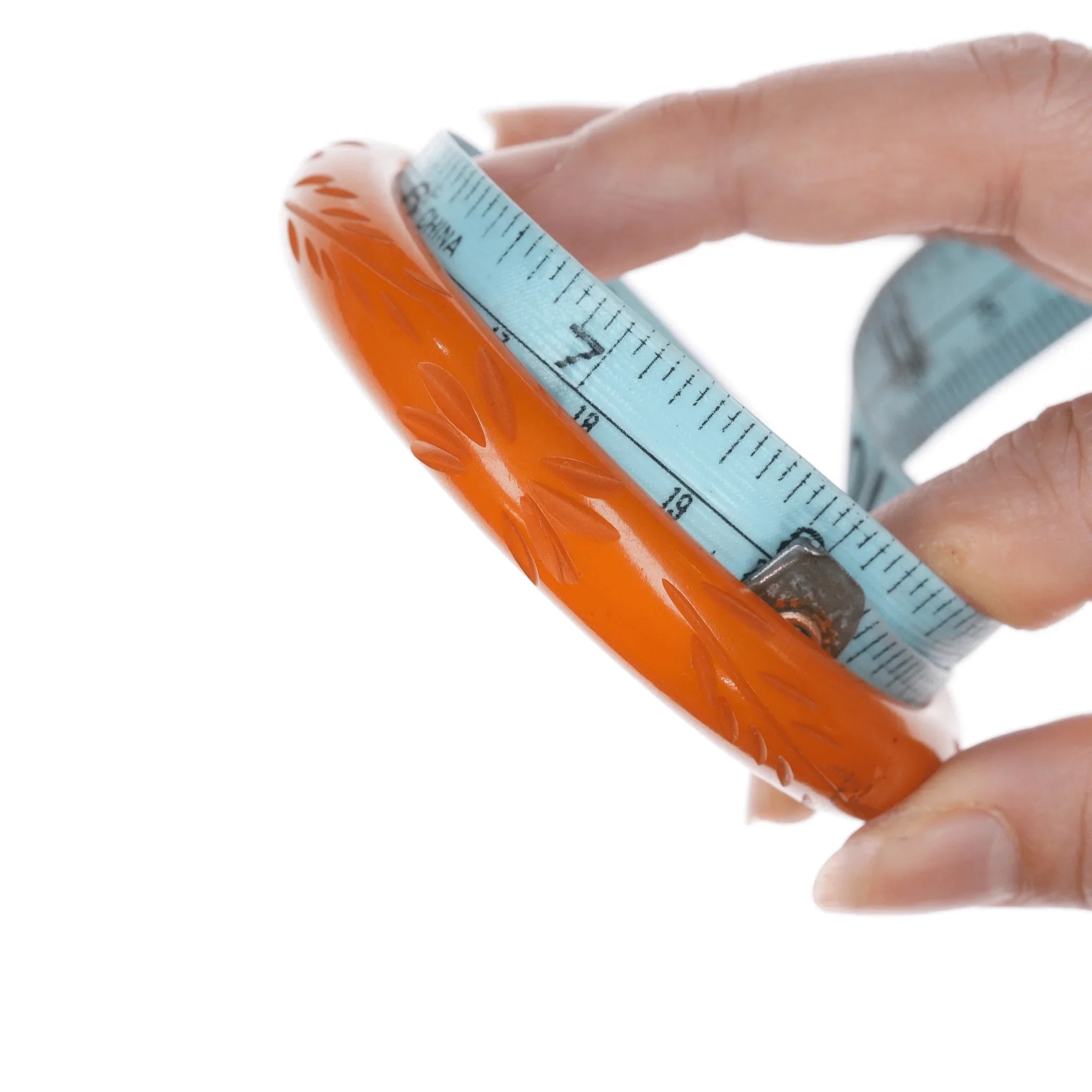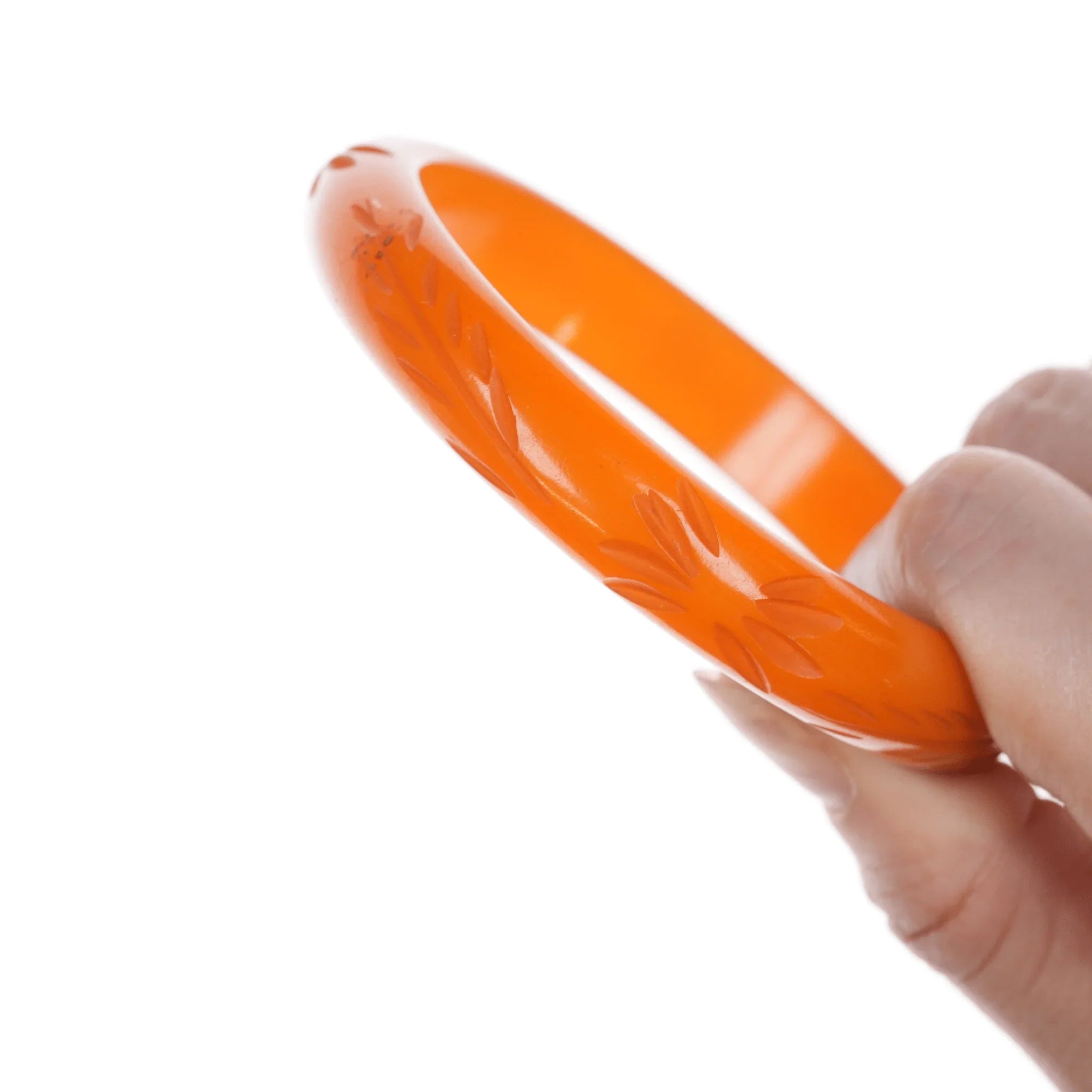 8" c1940's Carved Butterscotch bakelite bangle, fun with no issues. Very well preserved authentic item from an extensive long time collection put together in the last quarter of the 20th century. Shown on a 6" women's wrist. Measurements in pics.
