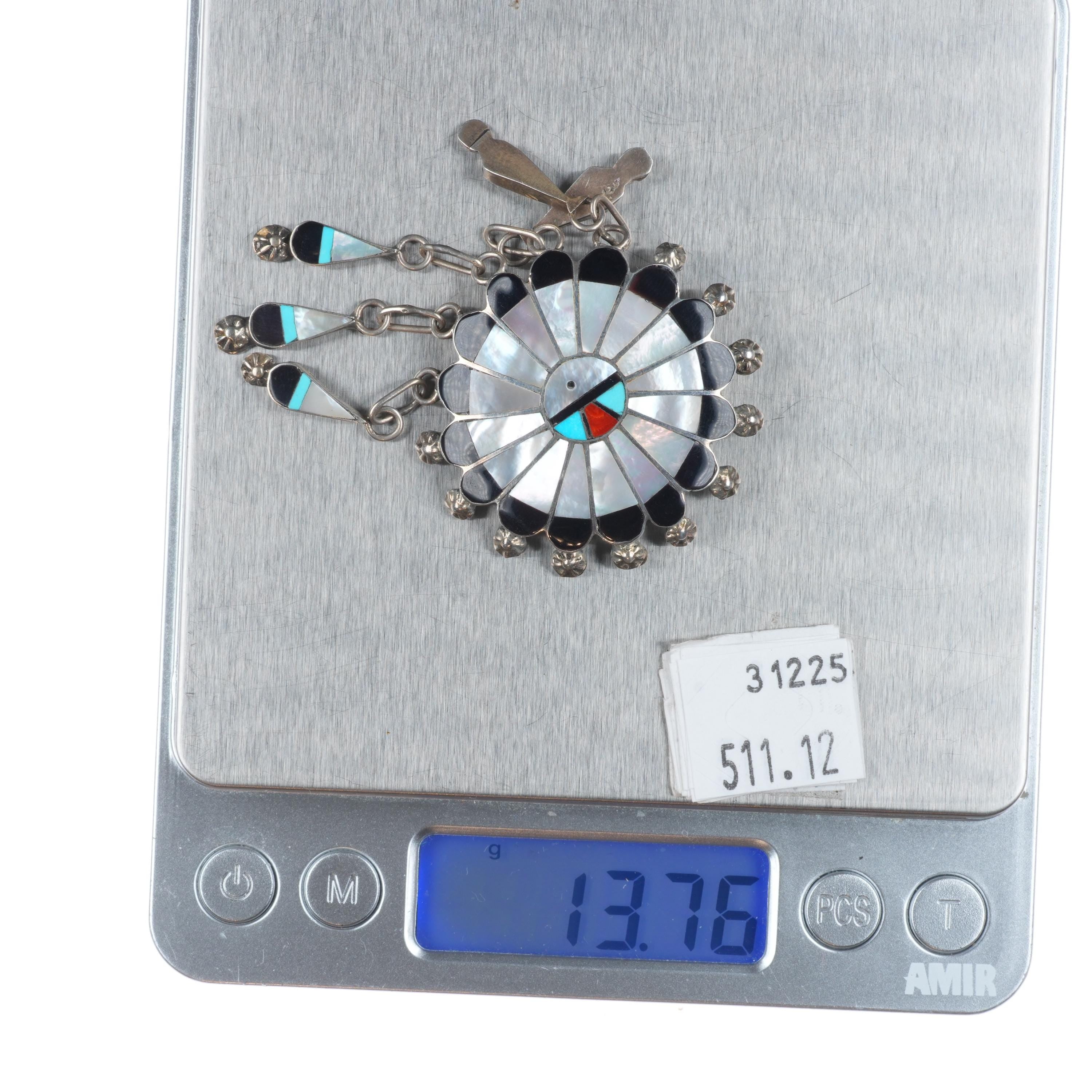 Abel Soseeah Zuni sterling silver shell/jet/turquoise inlay sunface pendant/pin. Tested and guaranteed solid sterling silver with weight and measurements in pictures. All stones, secure and intact with no apparent issues.