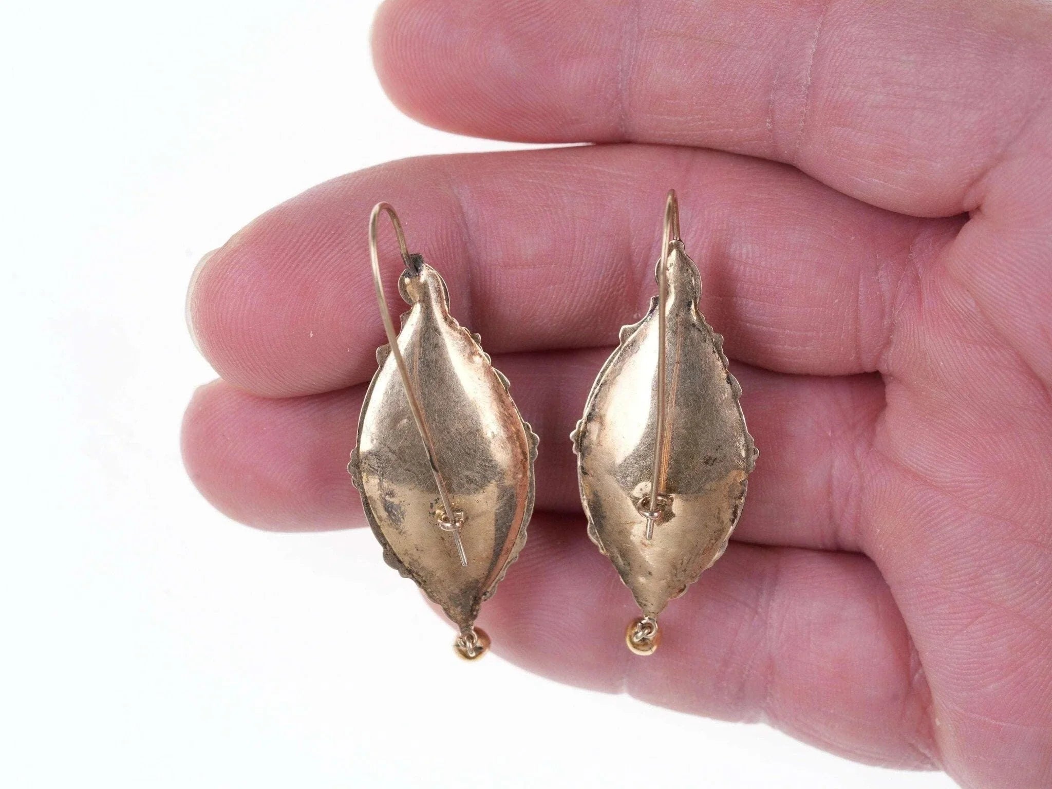 c1890 Victorian 14k Micro-Mosaic Dog earrings. Great pair of hollow but solid<br>(tested) 14k gold earrings from the last half of the 19th century. 2" tall x<br>5/8" wide 6.5 grams. unmarked