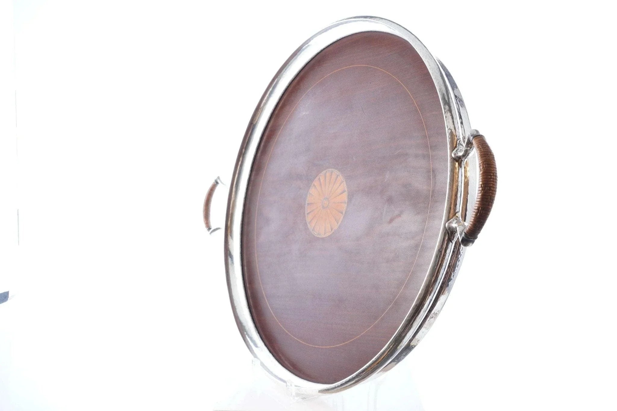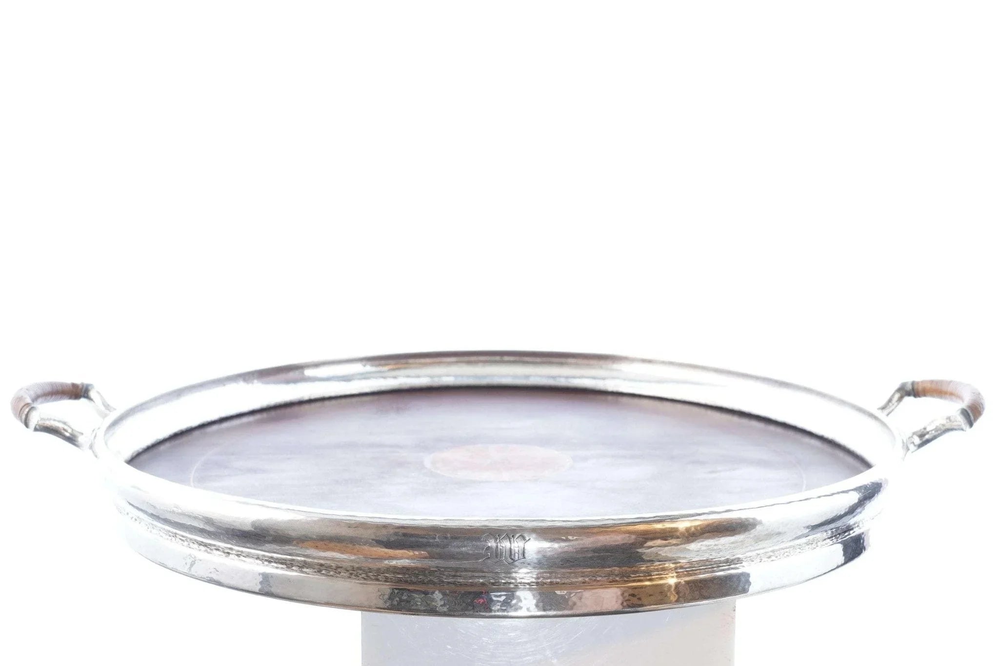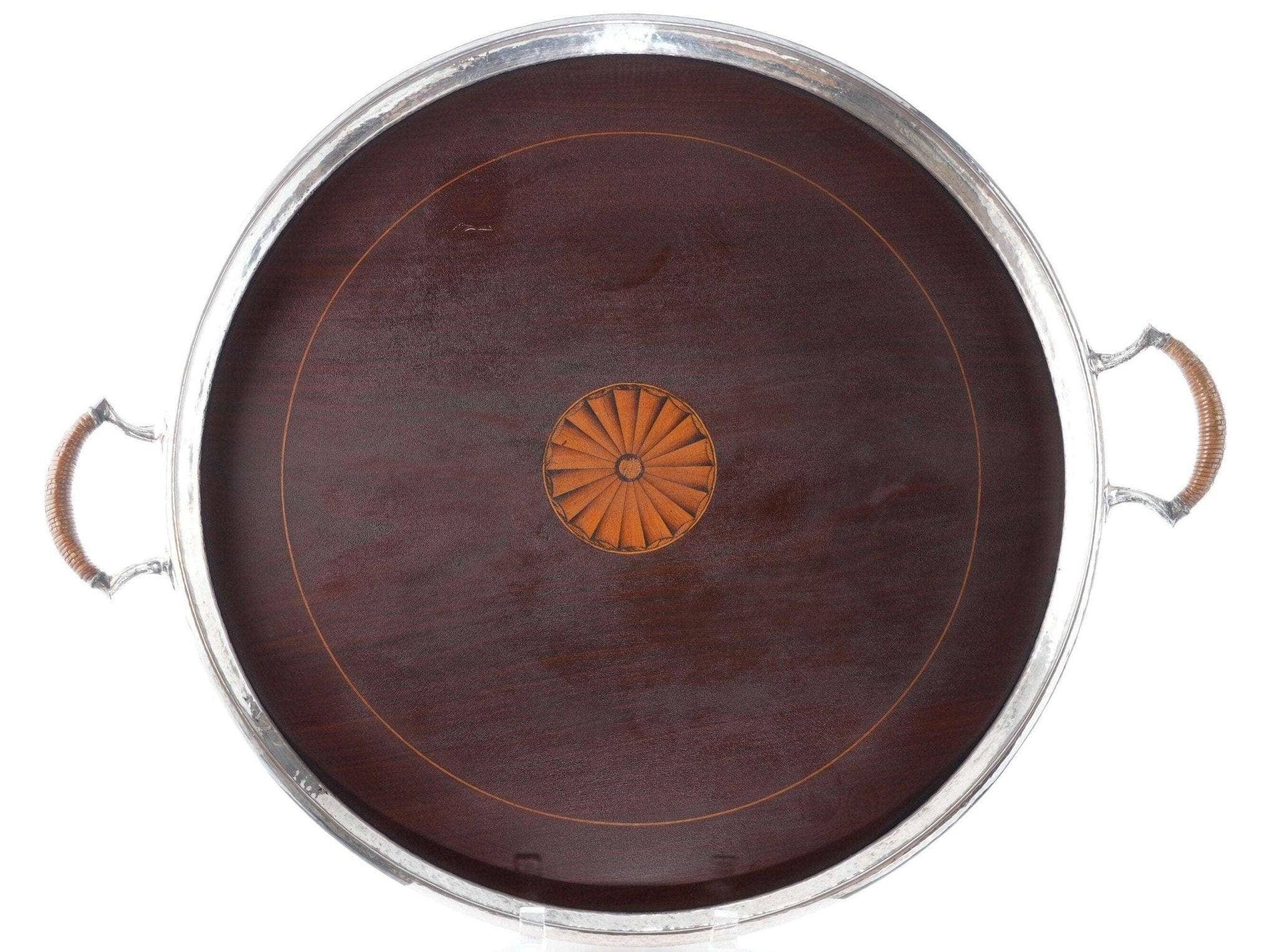 c1920 Gorham Sterling/Marquetry Art Deco Inlaid Tea tray. Very rare and amazing<br>tray from the first quarter of the 20th century, early art deco period and<br>style. The entire tray is hand hammered sterling with a hand inlaid marquetry<br>wood center. Thick solid, strong tray that has made it 100 years with no damage<br>or significant wear. 23" wide handle to handle, 18.5" wide without handle, W<br>monogram that can't be seen at a normal level.<br><br>I'm am offering this on 2/5/2023, at that time I have a matching tea set, hand<br>hammered teapot, Coffeepot, creamer sugar with lid, same w monogram, Gorham<br>Sterling with woven rattan handles like this one and fancy organic finials that<br>I could sell for $2200 more. I figured I'd mention it but I have a very strong<br>local offer so I'm not going to spend time I don't have photographing it unless<br>someone expresses serious interest within the next week or so. It will be gone<br>after that.
