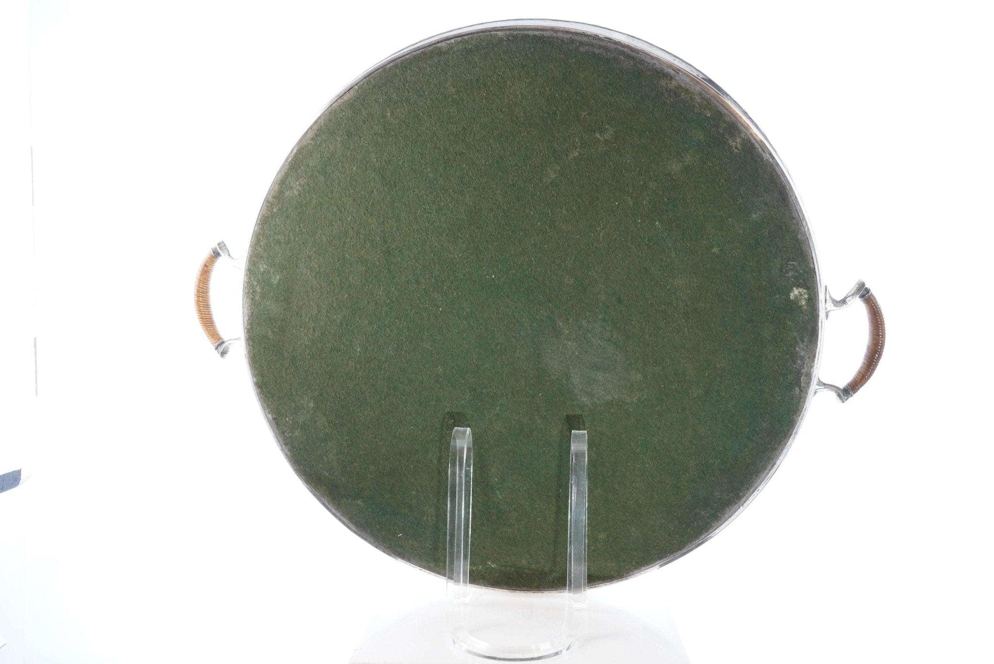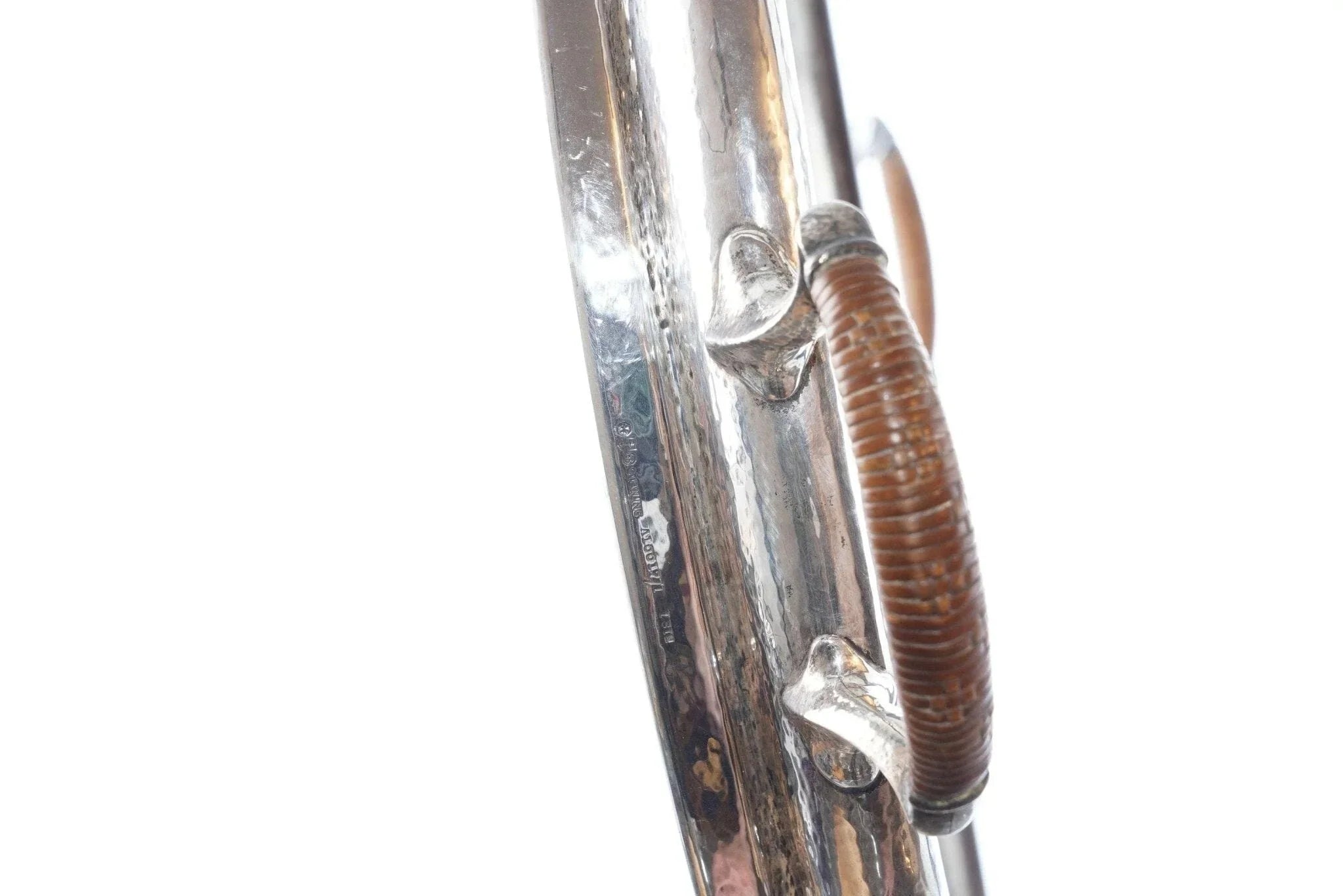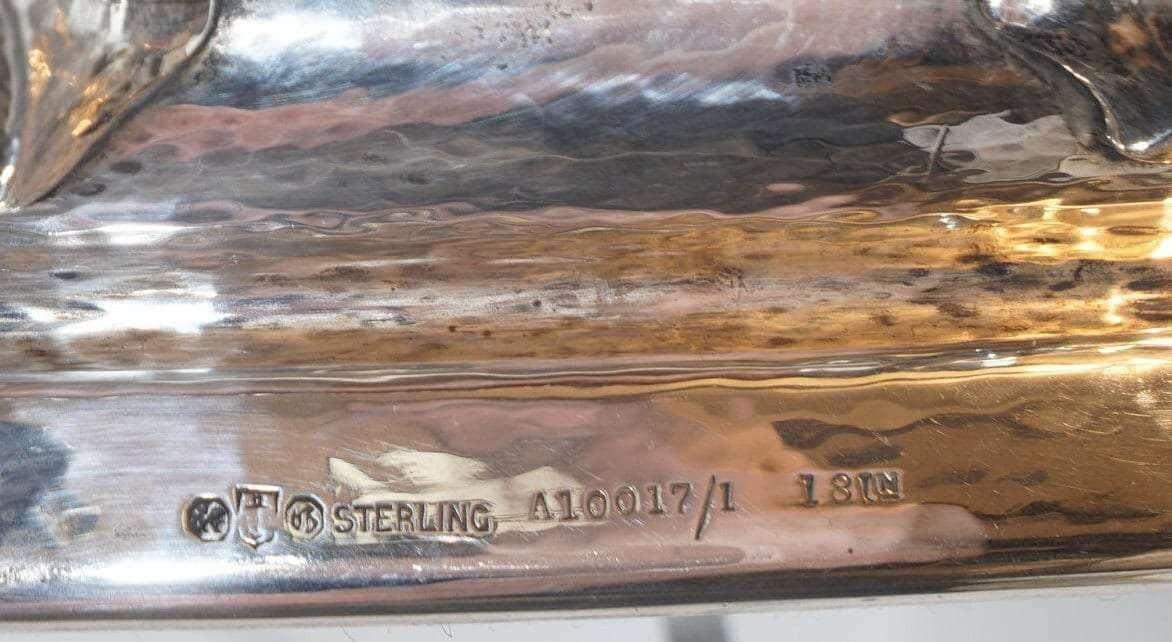 c1920 Gorham Sterling/Marquetry Art Deco Inlaid Tea tray. Very rare and amazing<br>tray from the first quarter of the 20th century, early art deco period and<br>style. The entire tray is hand hammered sterling with a hand inlaid marquetry<br>wood center. Thick solid, strong tray that has made it 100 years with no damage<br>or significant wear. 23" wide handle to handle, 18.5" wide without handle, W<br>monogram that can't be seen at a normal level.<br><br>I'm am offering this on 2/5/2023, at that time I have a matching tea set, hand<br>hammered teapot, Coffeepot, creamer sugar with lid, same w monogram, Gorham<br>Sterling with woven rattan handles like this one and fancy organic finials that<br>I could sell for $2200 more. I figured I'd mention it but I have a very strong<br>local offer so I'm not going to spend time I don't have photographing it unless<br>someone expresses serious interest within the next week or so. It will be gone<br>after that.