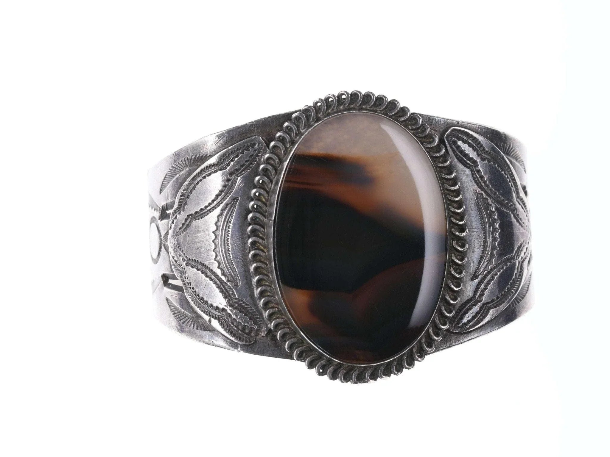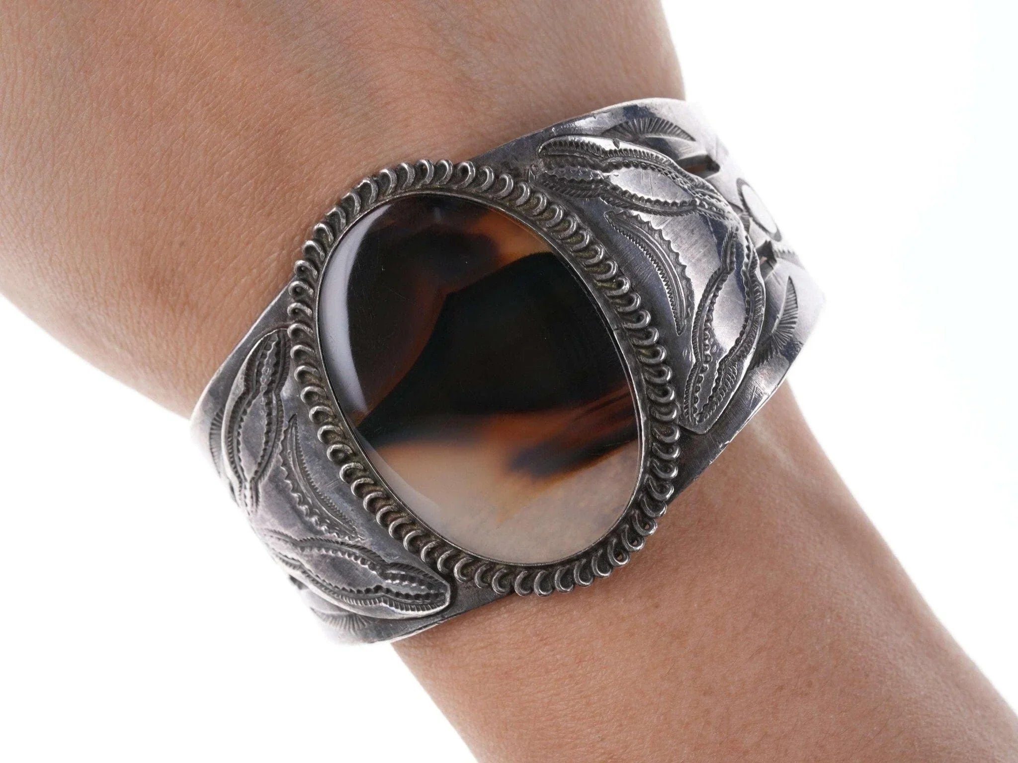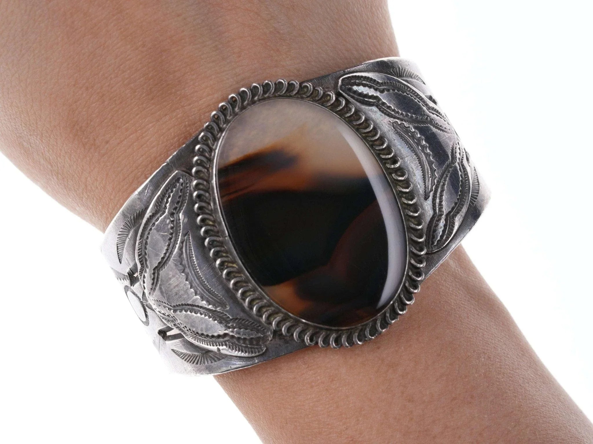 Vintage Native American Heavy stamped silver Agate cuff bracelet. Nice heavy<br>stamped cuff from the second quarter of the 20th century. No damage or breaks..<br><br>All precious metals are tested and guaranteed, any Native American jewelry<br>referred to as Silver or Sterling is guaranteed to be a minimum of 90% (coin)<br>silver and possibly higher content.