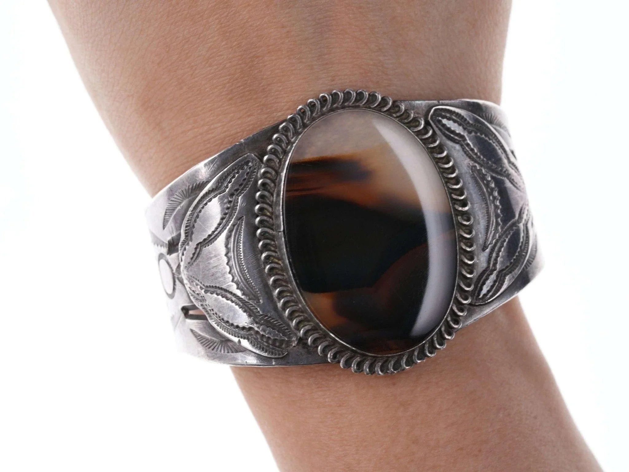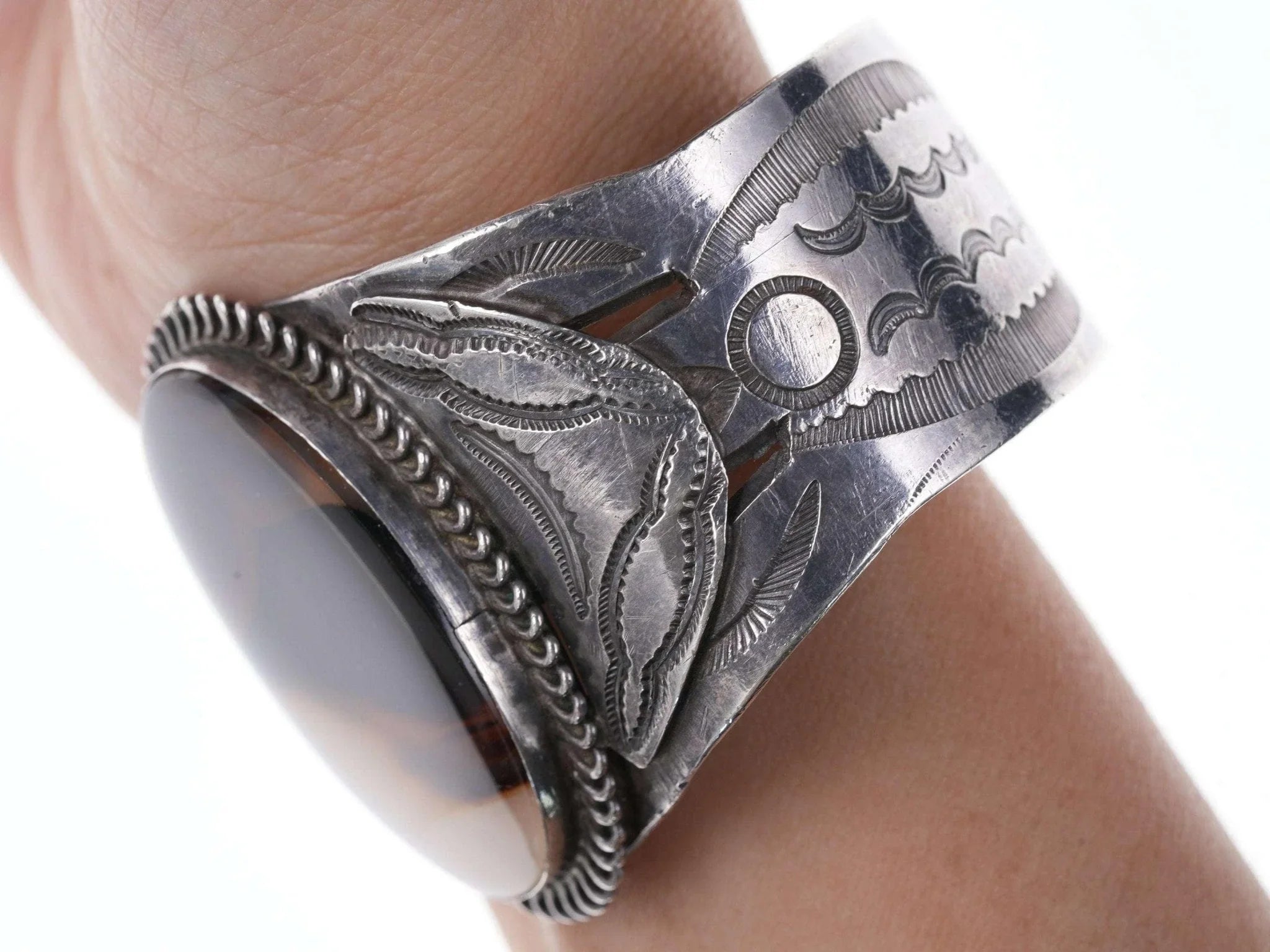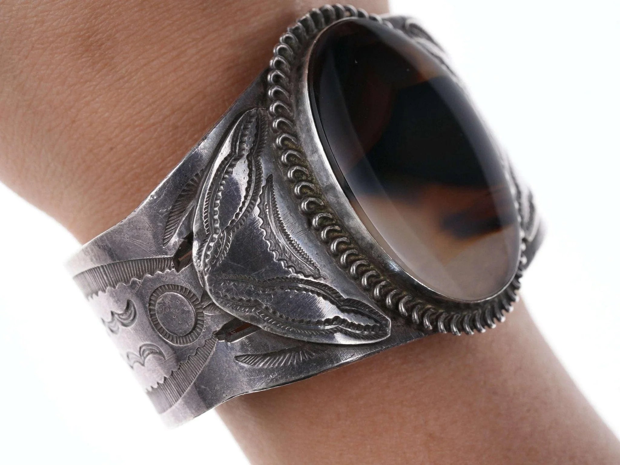 c1940's Native American Heavy stamped silver Agate cuff bracelet