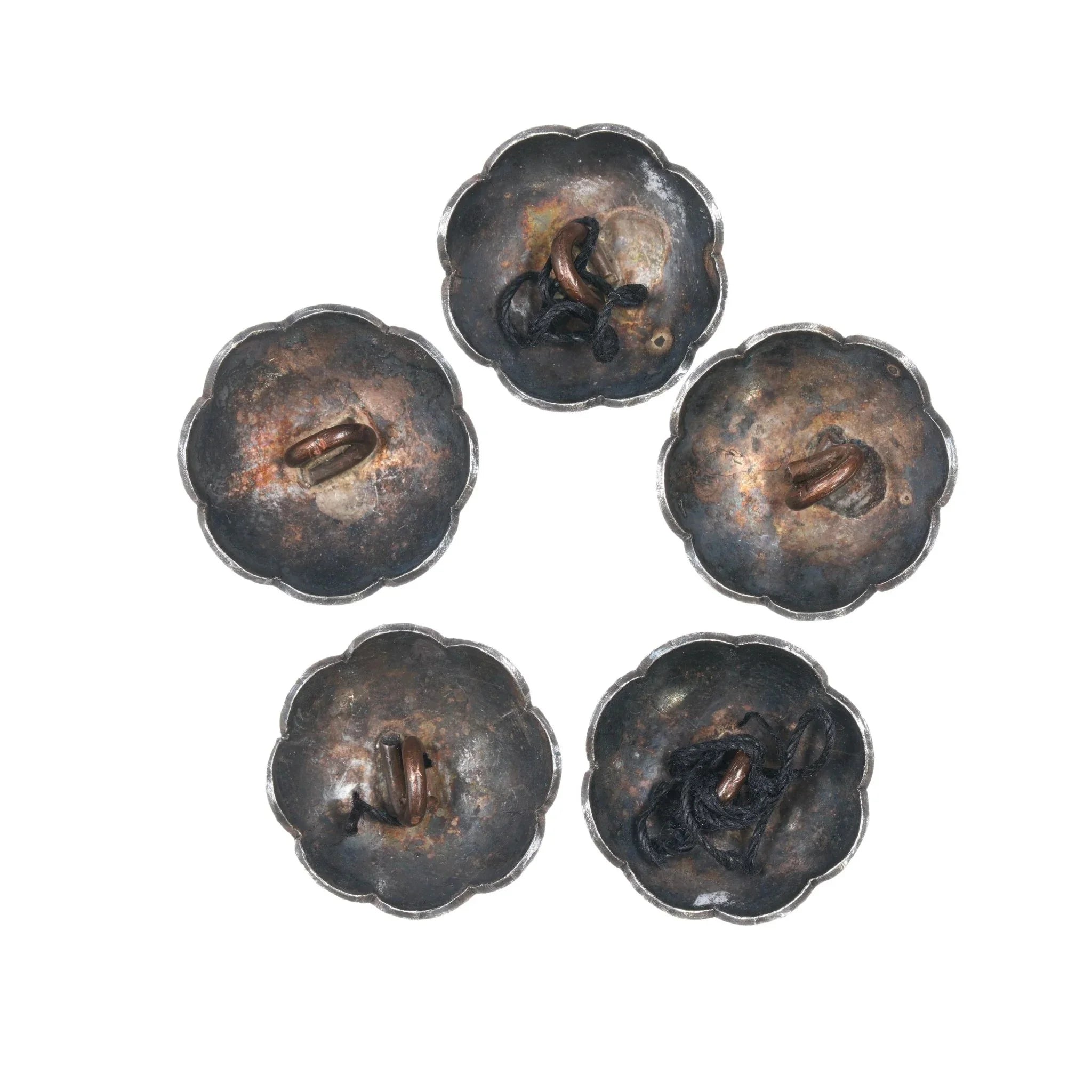 c1940‘s Navajo silver buttons (5). Selling the 5 buttons shown, handmade solid sterling silver or coin silver from the second quarter of the 20th century. Copper thread loops.