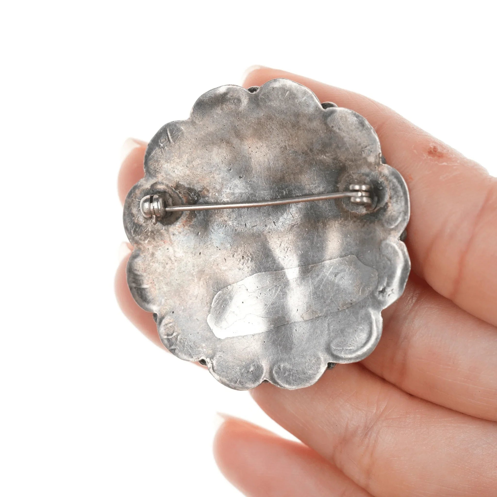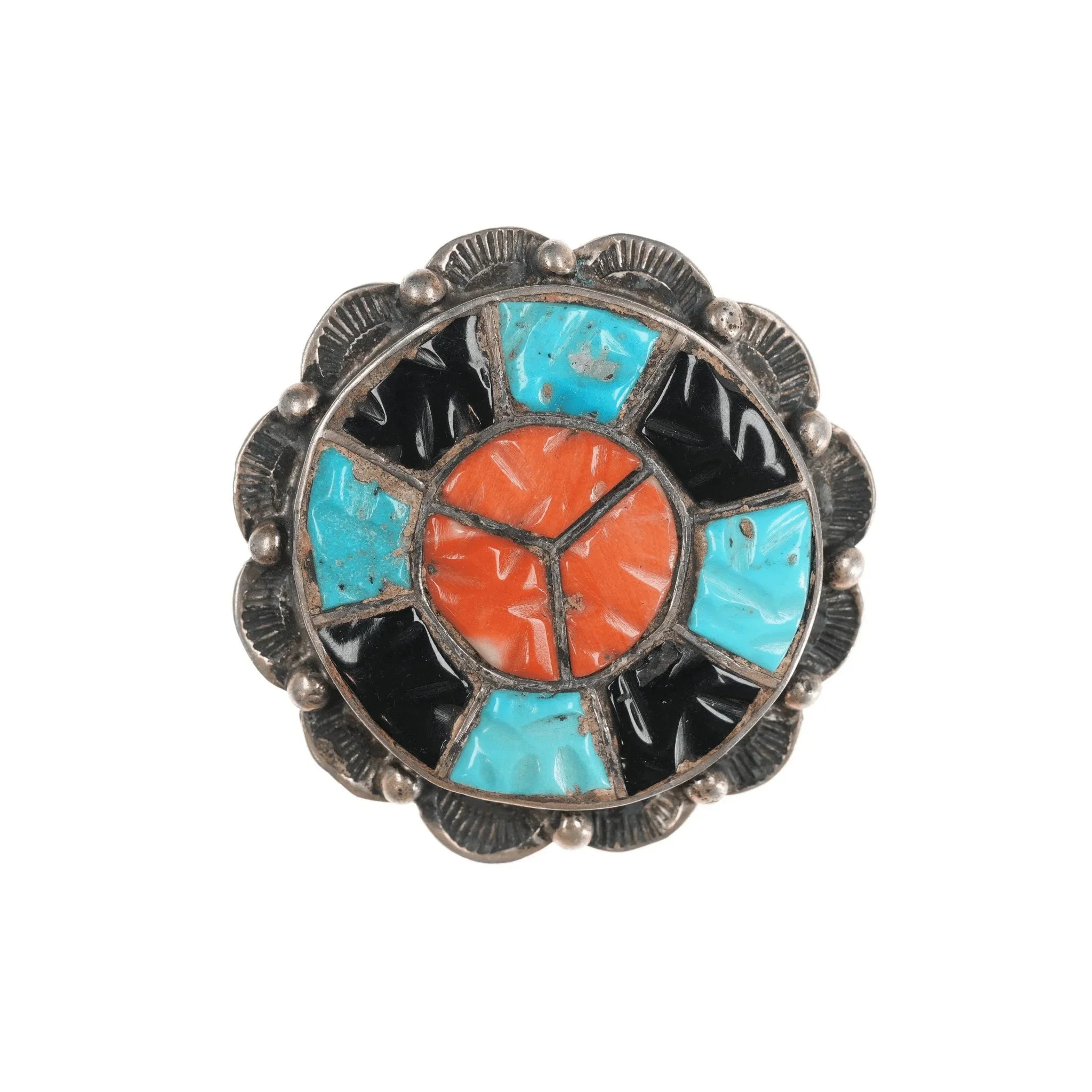 c1950's Zuni Silver carved turquoise, coral, and jet channel inlay pin. Marked or unmarked as shown in pics, weight and other measurements in pics. Sorry but my jewelry is stored in a secure location and cannot be accessed for more pictures, videos, or measurements until sold. If you look at pictures/description your question should be answered. Thank you so much for your time and consideration!<br><br>All precious metals are tested and guaranteed, any Native American jewelry<br>referred to as Silver or Sterling is guaranteed to be a minimum of 90% (coin)<br>silver and possibly higher content. Anything marked is guaranteed to be what<br>it's marked, most bracelets are photographed on a 6" wrist (non hairy), rings<br>photographed on the appropriate sized finger when possible. With bracelets if<br>the measurement is not given in the description then inside circumference is<br>shown where the metal meets the number on the the cloth tape measure.