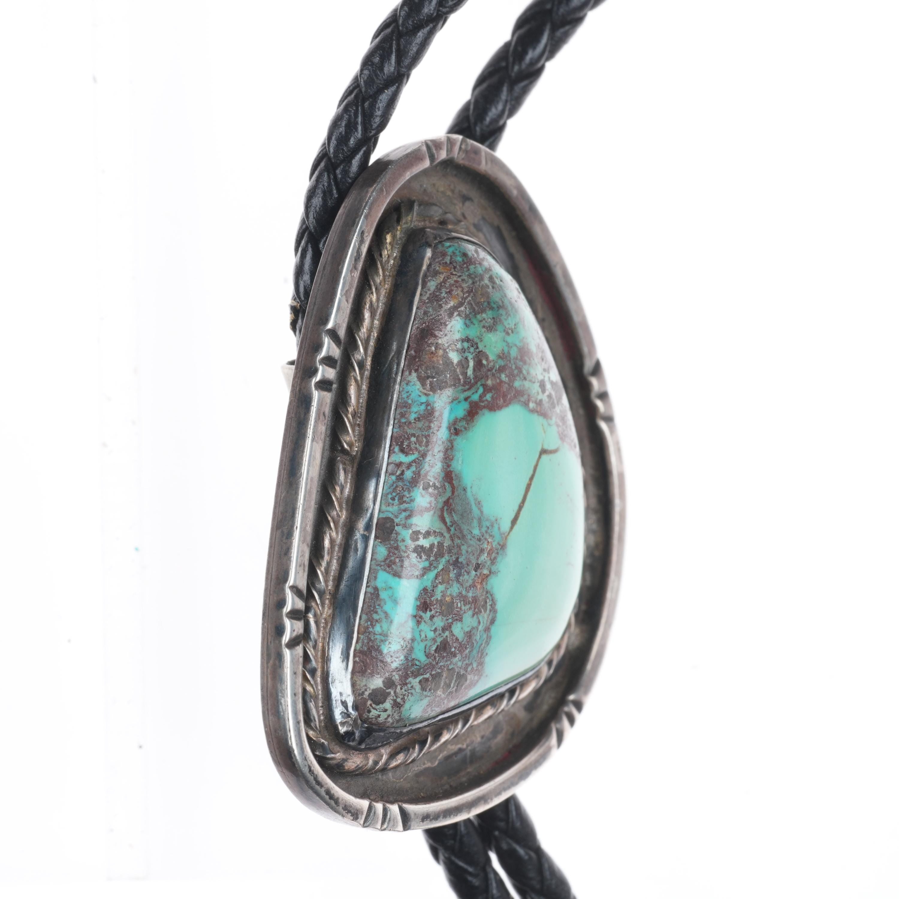c1960 c-31 smoky Bisbee turquoise Navajo sterling silver bolo tie. Tested and guaranteed solid sterling silver slide and tips. Weight and measurements in pictures. 40" long. Illegible/unidentified mark. I believe this to be Bisbee that has turned green from 60+ years of being exposed to the environment, oils, etc which is common with natural turquoise.